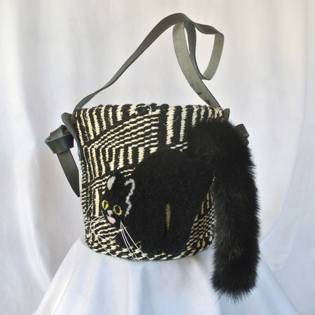 モコモコねこカゴバッグ サイザルVer. ブラック 毛糸でモコモコに刺繍した猫ちゃんと、ふわふわロングなシッポがポイントのかごバッグです。小さめで持ちやすいサイズのカゴバッグです。 シャーっとおこっているような表情の猫ちゃんがモチーフになっています。 サイザル麻で編まれたかごバッグを使用しています。 ※手作りのため、一点ずつ個体差があります。毛糸刺繍の起毛の状況によって、猫ちゃんの表情が、画像とやや異なる場合がございます旨ご了承ください。 ※カゴは手仕事の為歪みがあります。 サイズ:高さ約23cm(ハンドル除く)最大幅約 25cm 底幅約 16cm 底マチ約 15cm ハンドル長さ:約 30cm 素材: ボディ:サイザル麻 シッポ部分 アクリル/ナイロン、猫刺繍部分 アクリル/ウール かご: ケニア製 ワッペン: 日本製 組み立て: 日本 この製品は素材の特性上、摩擦や水分、汗などにより、他の衣類に色移りすることがあります。白物、淡色物のお洋服とのご使用を避けてください。 また、天然草素材の為、周囲のものを引っ掛けたり、傷つけたりする恐れがありますので十分ご注意ください。
