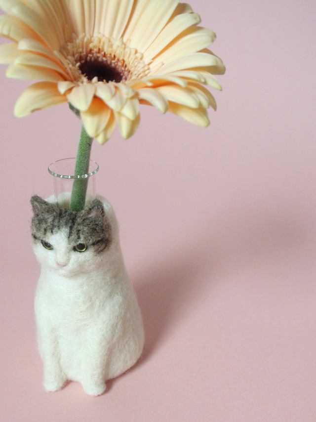 a little more DO CATS!(もうちょっとDO CATS!)と題して、イベントでご紹介した一部の商品を期間限定でオンライン販売いたします。イベントにお越しいただけなかった方や、迷って買わなかった〜という方、ぜひこちらでお楽しみくださいね! キジ白ちゃんの小さな一輪挿しです。 何か言いたげなお顔です。「大丈夫、わかってるよ、頑張ってるのちゃんと見てるからね」なんて言ってくれそうな表情。 テーブルの上やデスクの上に置いて、時々悩み相談してしまいそうです。 会社のデスクに置いたら、つい仕事中に上司の愚痴をこぼしてしまいそうです。 だってなんでも聞いてくれそうだから。 なんて長々すみません。 とにかくかわいいにつきます。足の裏の肉球まであるんだよ、、作家さんの猫愛にうるっときます。このお顔にキュンときたらぜひお迎えしてください〜♡ 高さ:約8.5cm 幅:約4.5cm Kushu+(クシュプラス) 長年の夢だった猫との暮らしをきっかけに猫愛が爆発して、羊毛フェルトで猫のお顔をつくるようになりました。 身につけても飾っても楽しいアクセサリーや 眺めたり抜けたおひげを挿したらヒゲホルダーにもなるようなインテリアアイテムをつくっています。 なかなか一緒に出掛けられない猫たちとのお散歩気分を楽しんだり いつも身近に猫を感じられるような存在になれたら嬉しいです。 愛猫のお写真を元に『うちねこバッヂ』のオーダーメイド製作もしています。 『うちねこ』シリーズの売り上げの一部は動物保護のために寄付させていただいております。