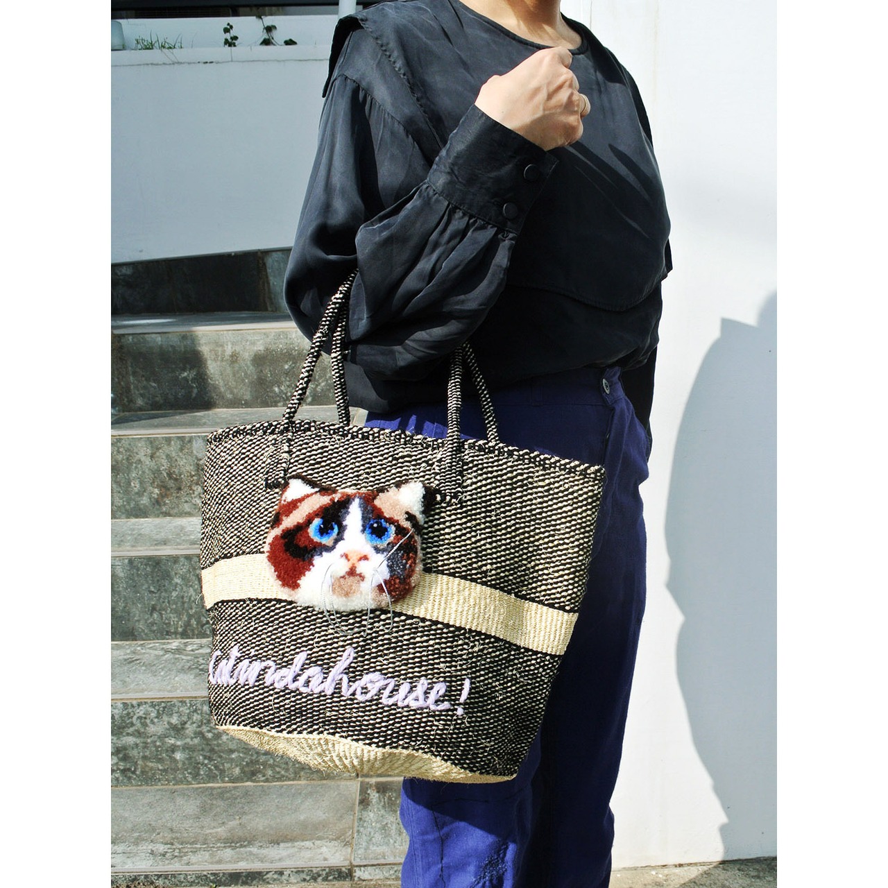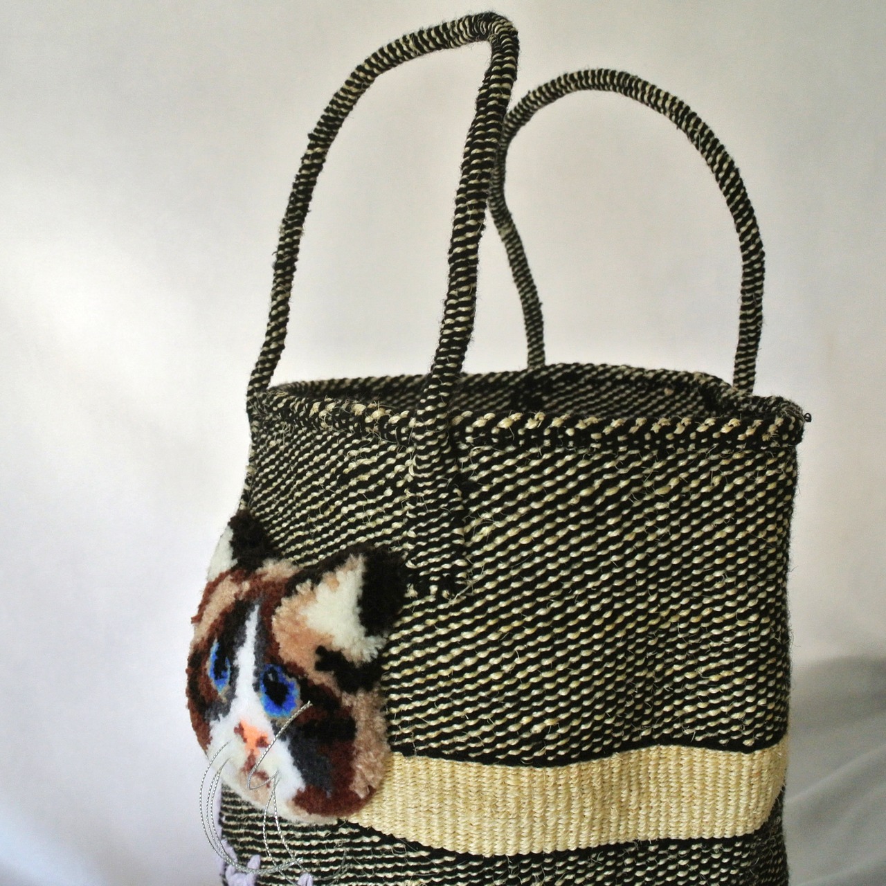 素朴な風合いのサイザルかごに、毛糸でモコモコに刺繍したcat faceを縫い付けました。