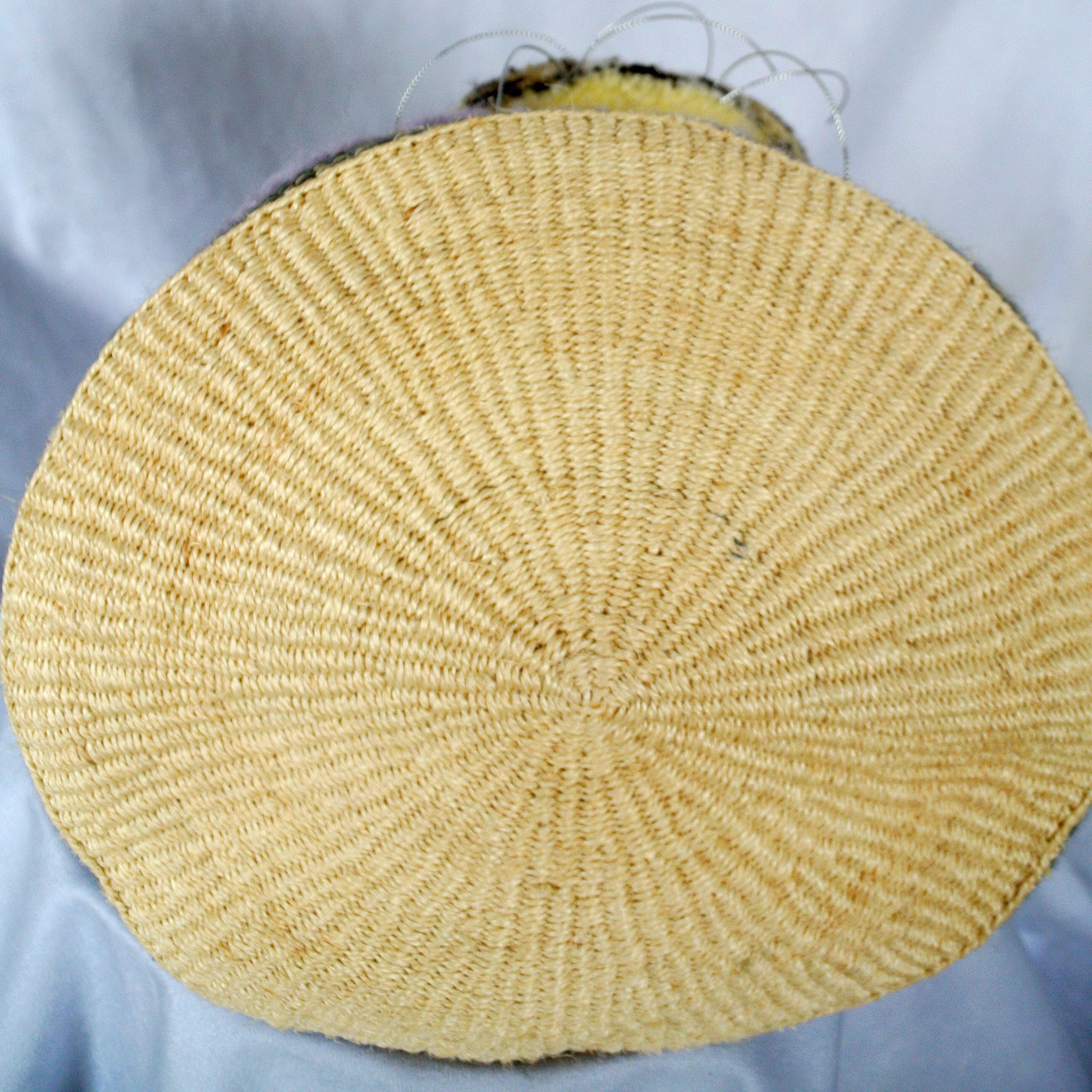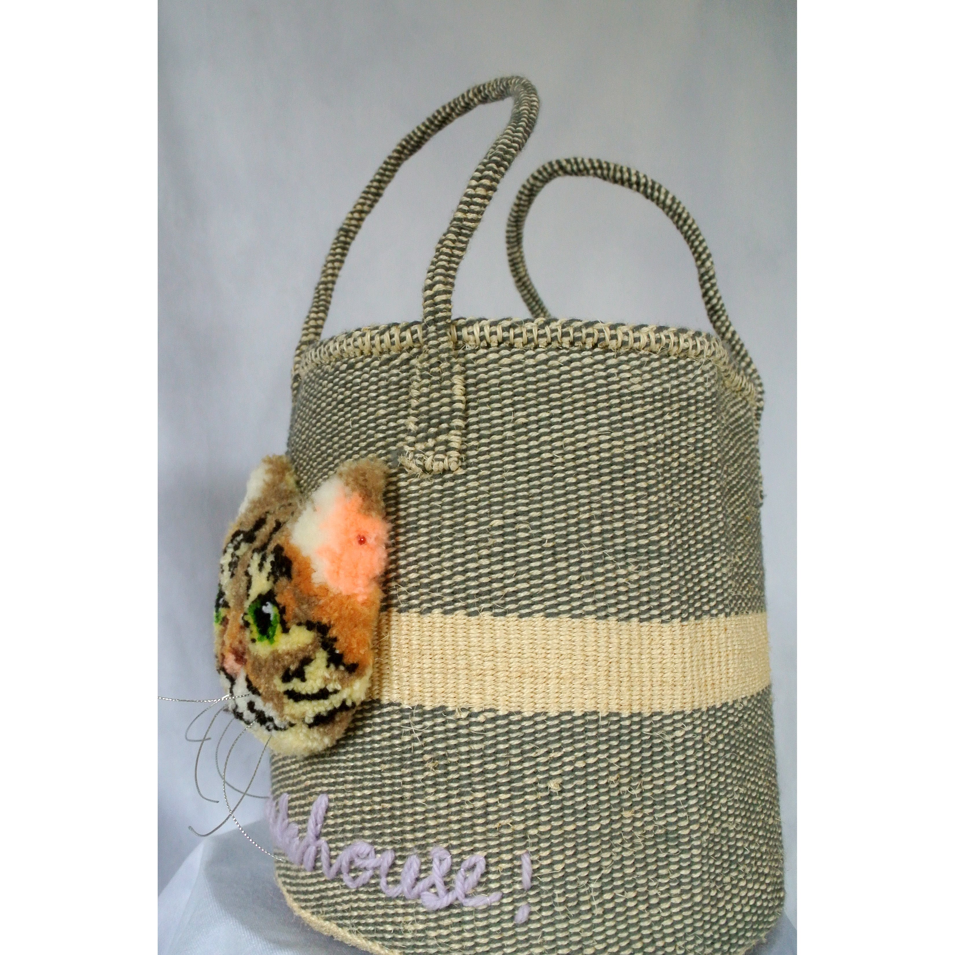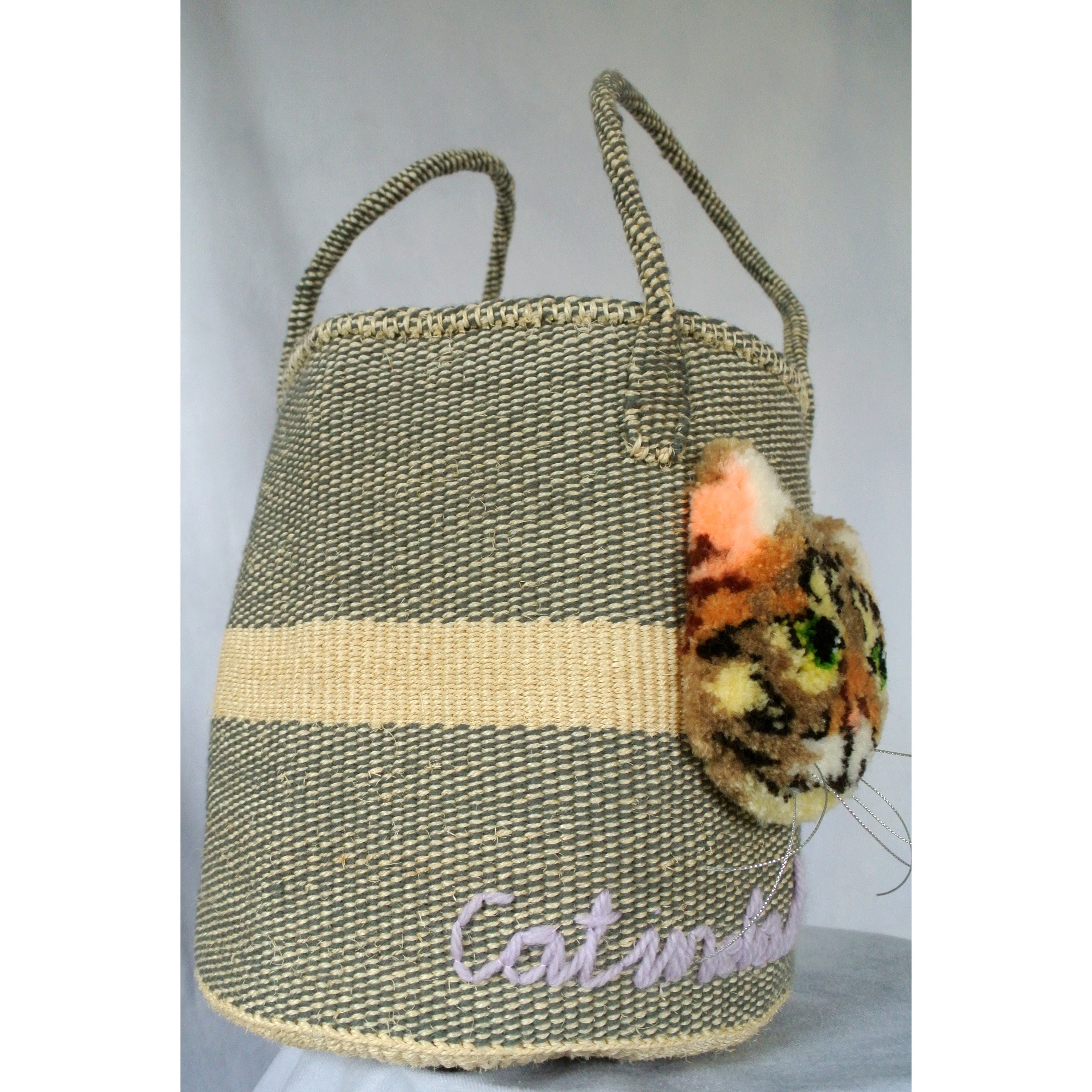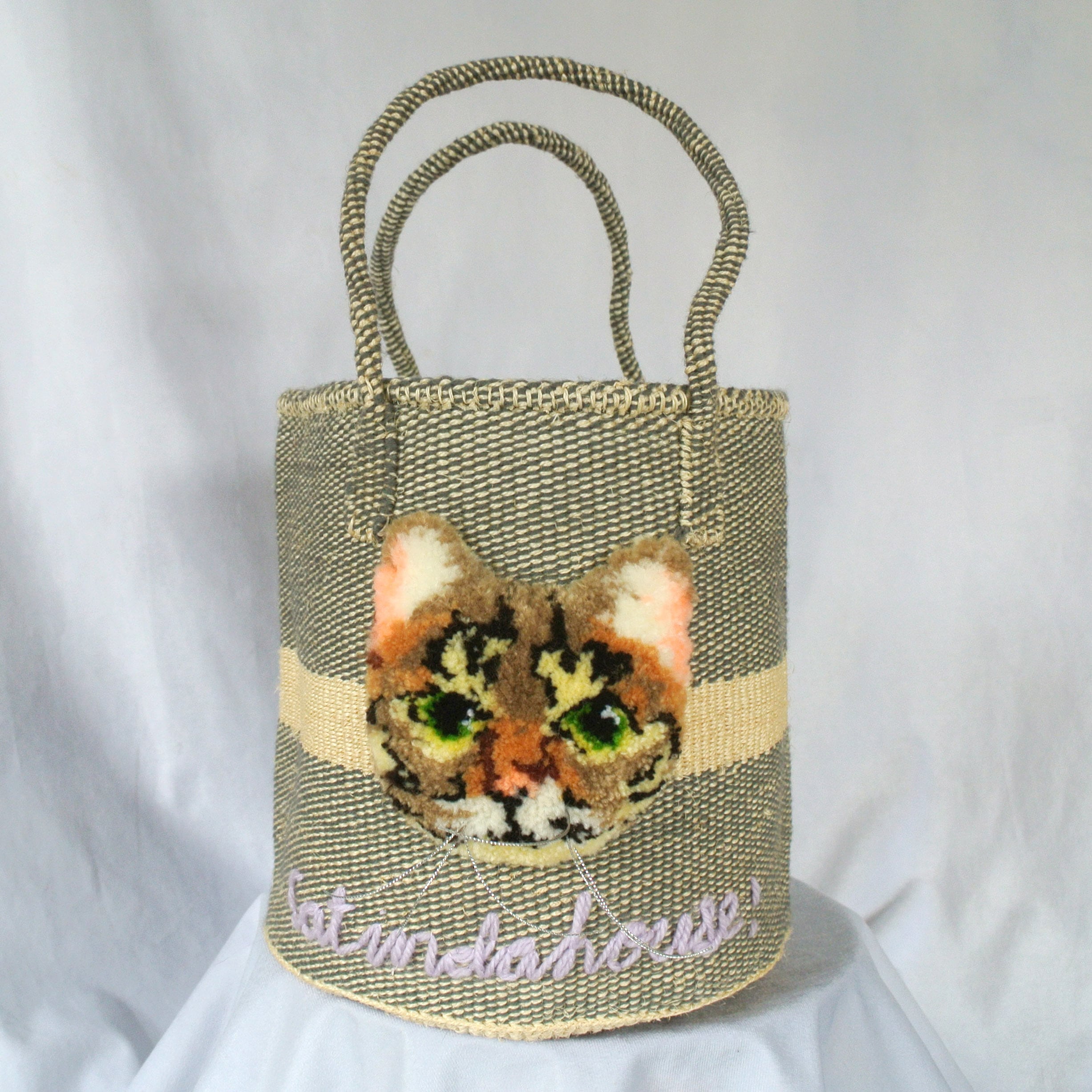 素朴な風合いのサイザルかごに、毛糸でモコモコに刺繍したcat faceを縫い付けました。