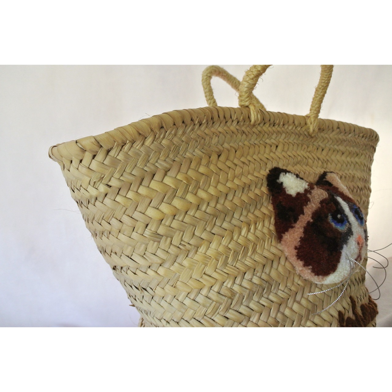 素朴な風合いのモロッコ製のマルシェかごに、毛糸でモコモコに刺繍したネコを縫い付けました。