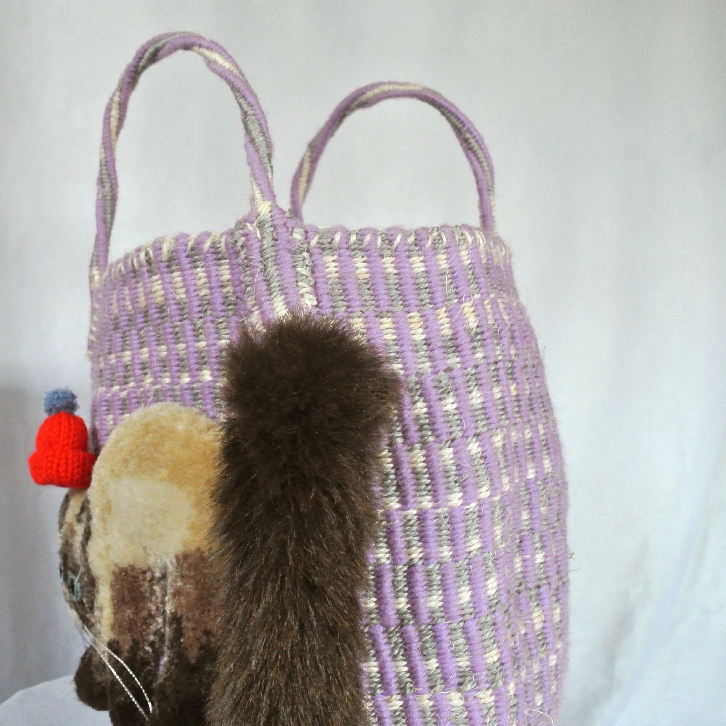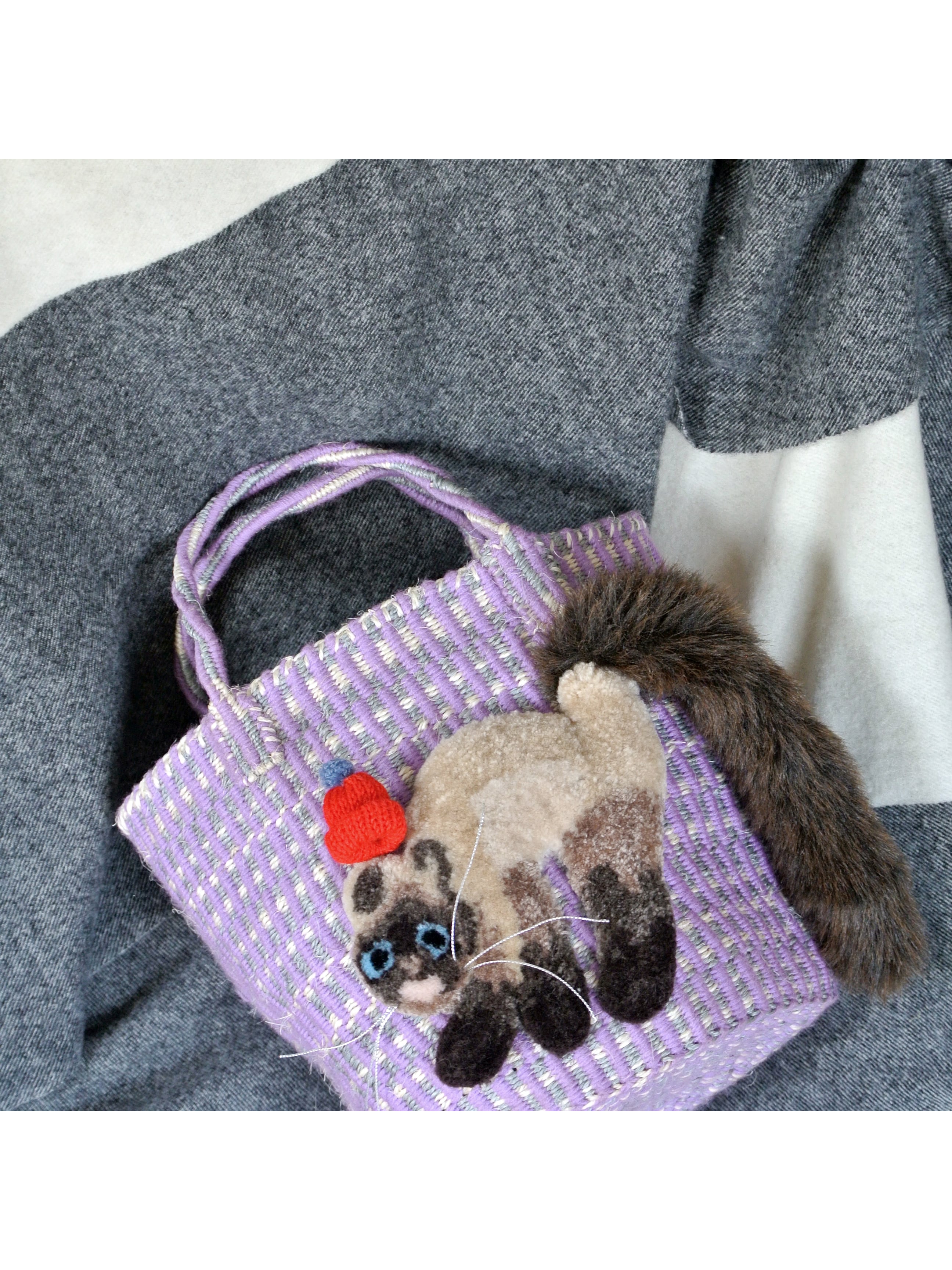 This basket bag features a fluffy cat embroidered with yarn and a long, fluffy tail.