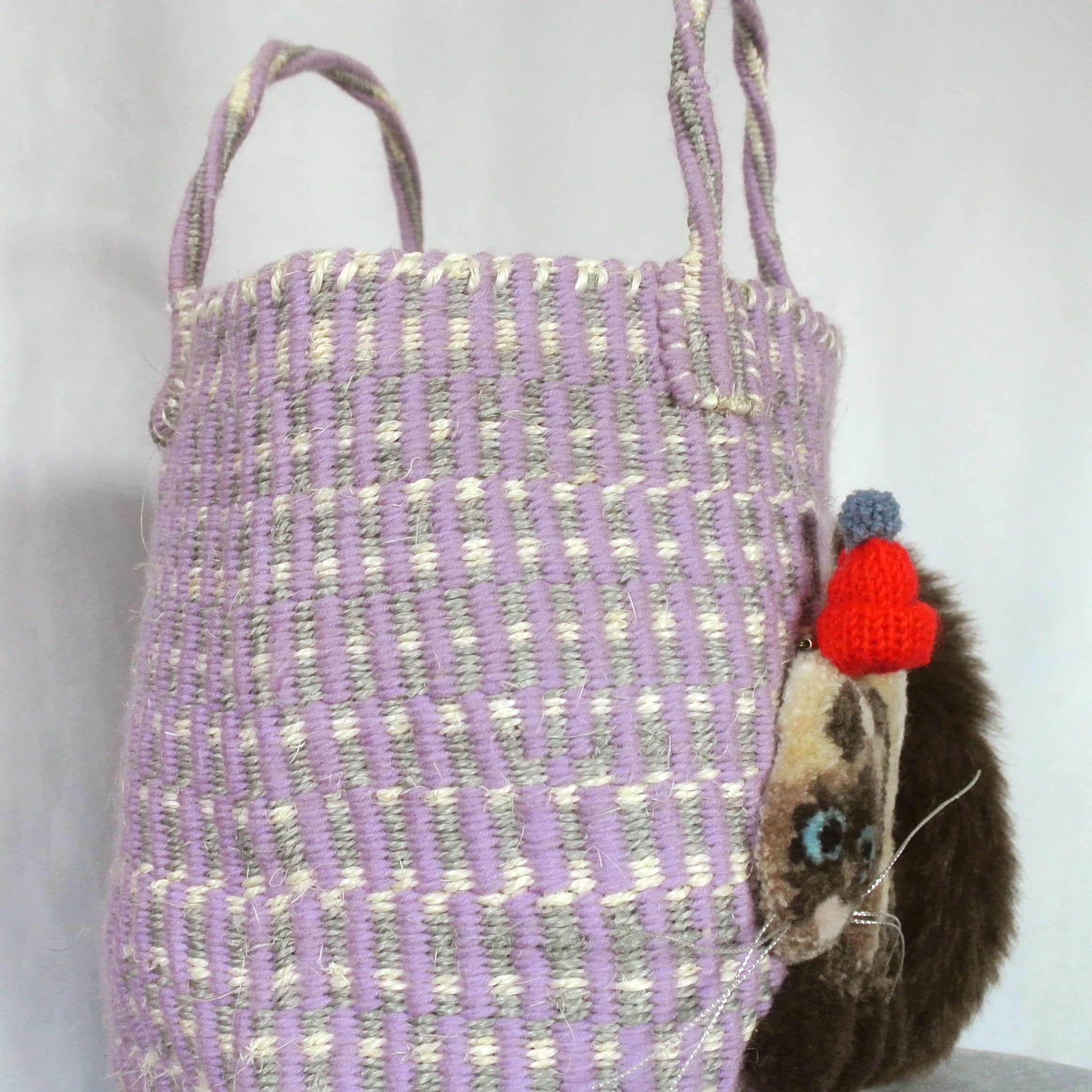 毛糸でモコモコに刺繍した猫ちゃんと、ふわふわロングなシッポがポイントのかごバッグです。
