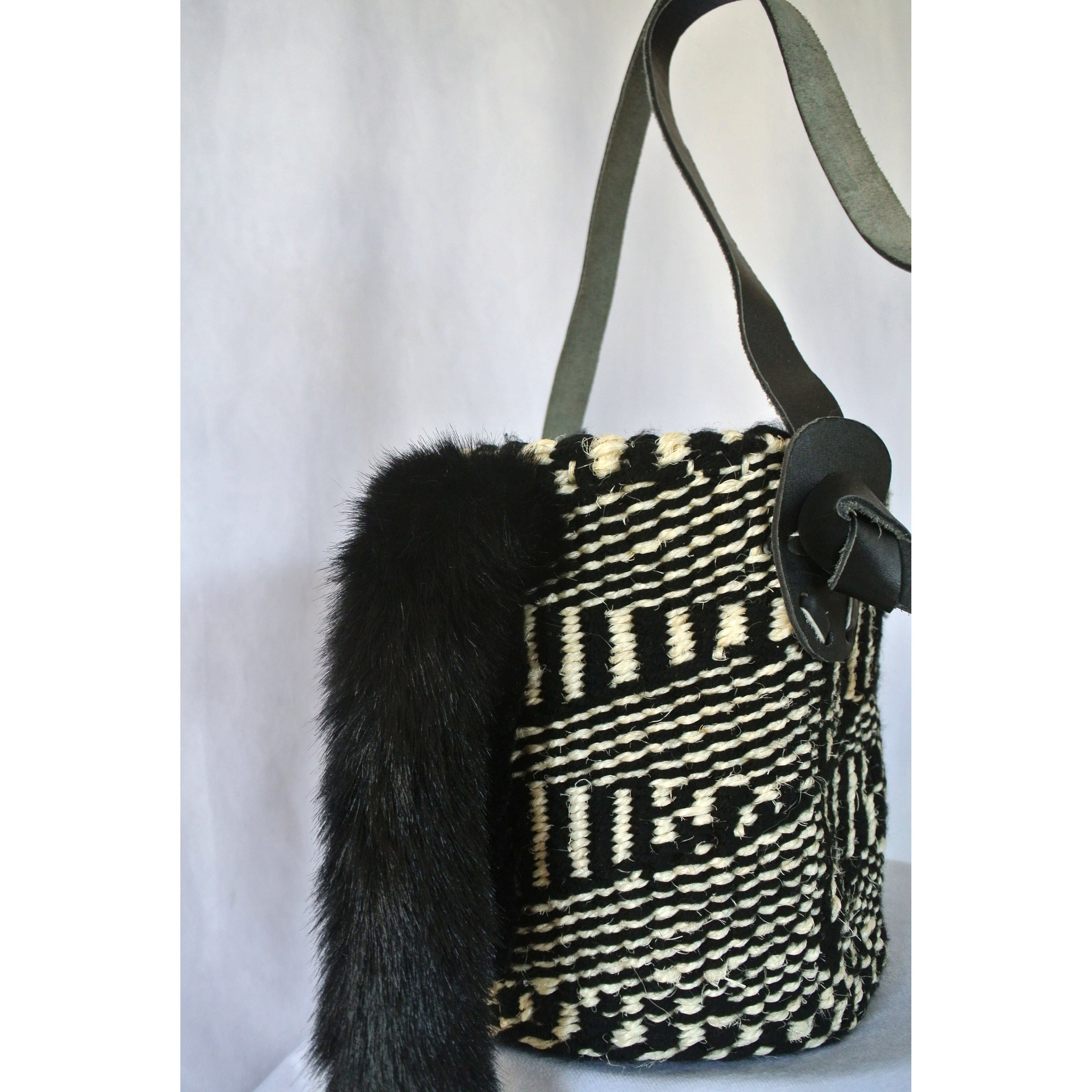 毛糸でモコモコに刺繍した猫ちゃんと、ふわふわロングなシッポがポイントのかごバッグです。