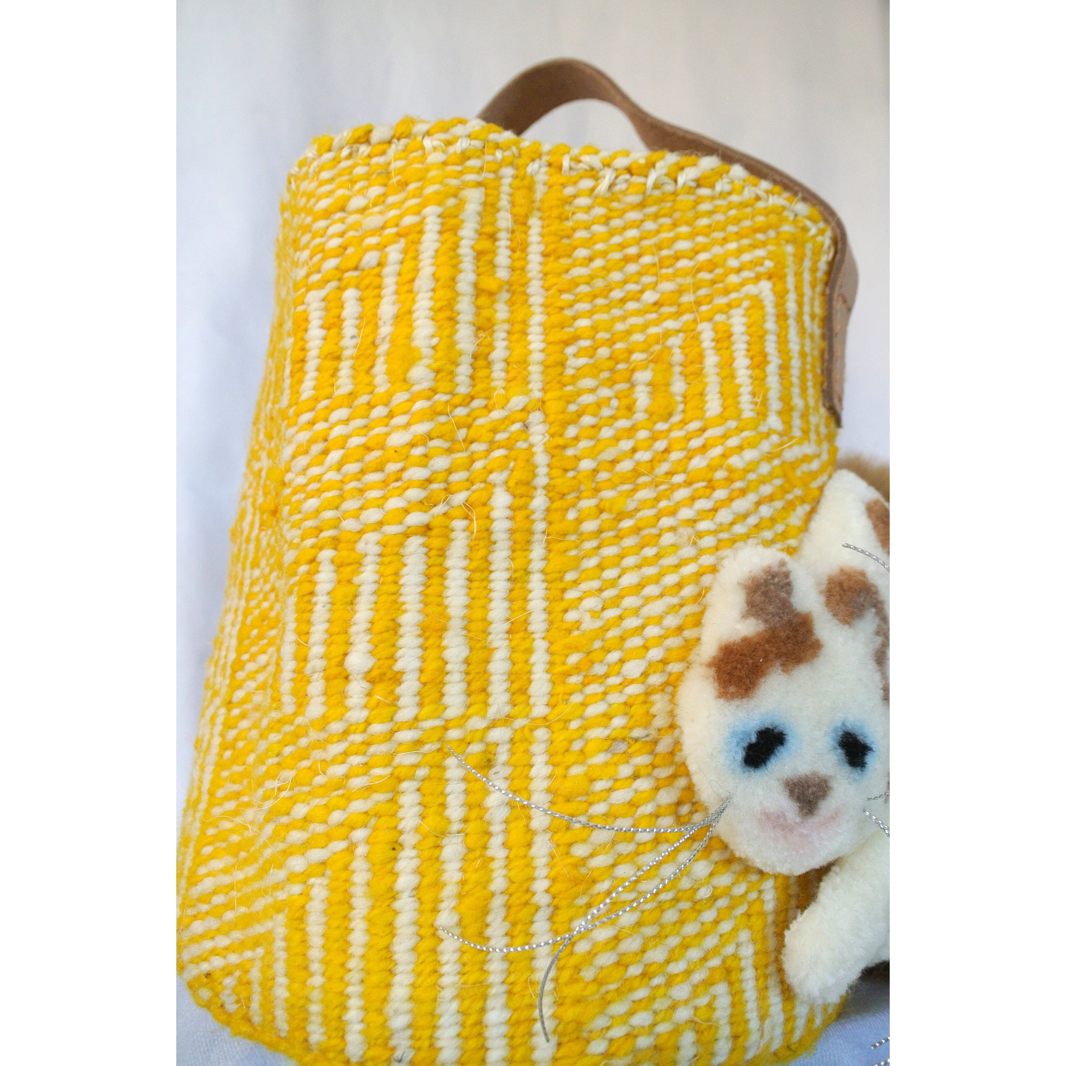 サイザル麻とアクリル毛糸で編まれたかごバッグを使用しています。