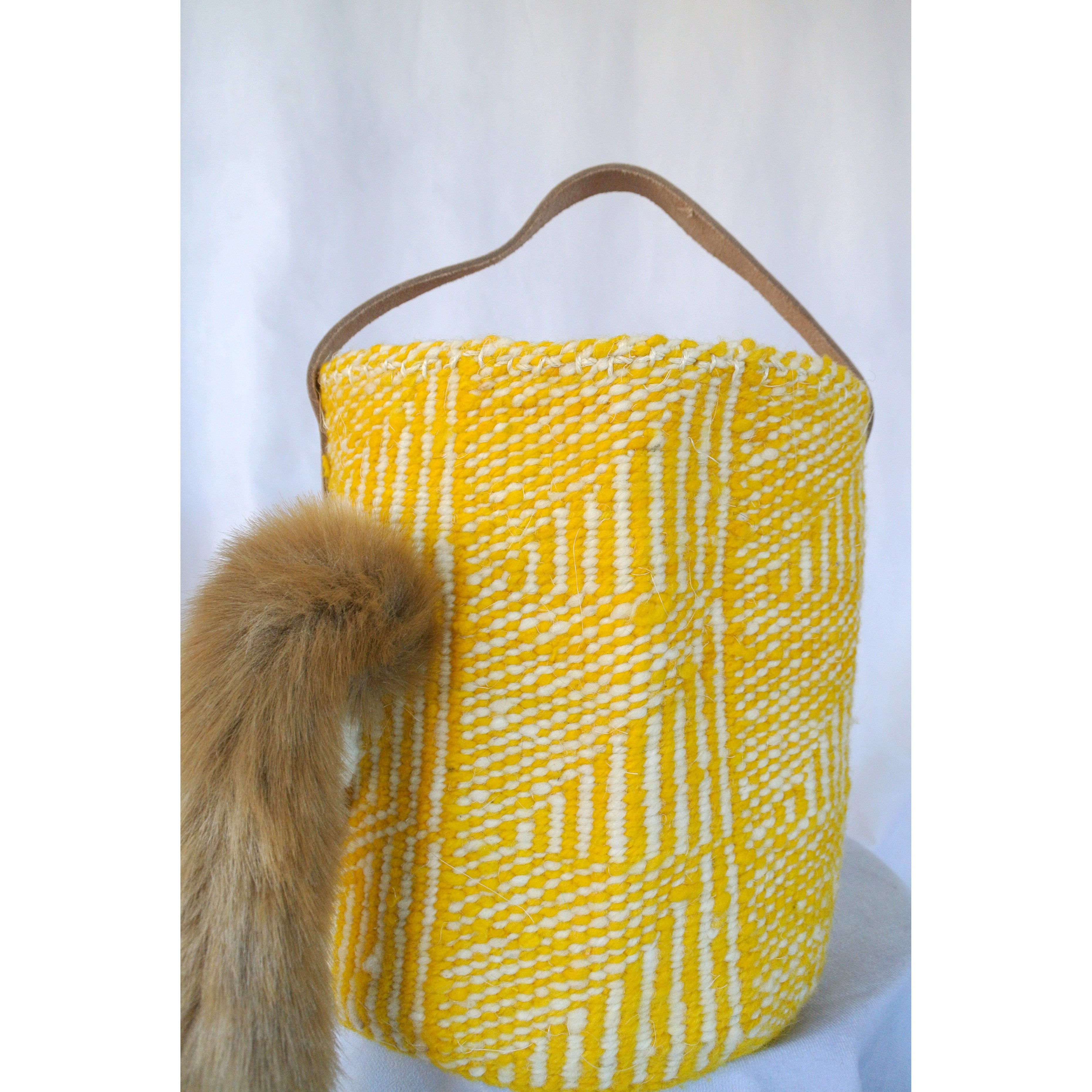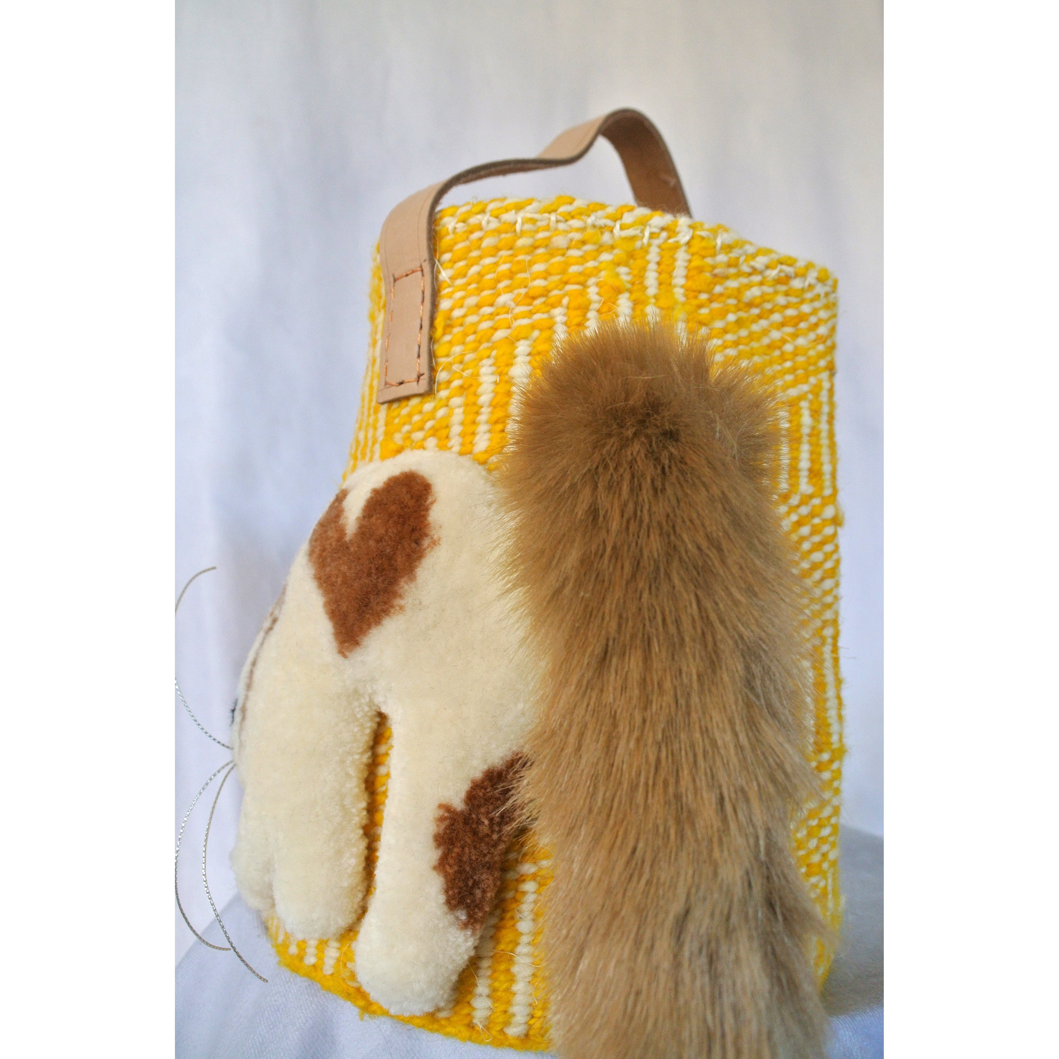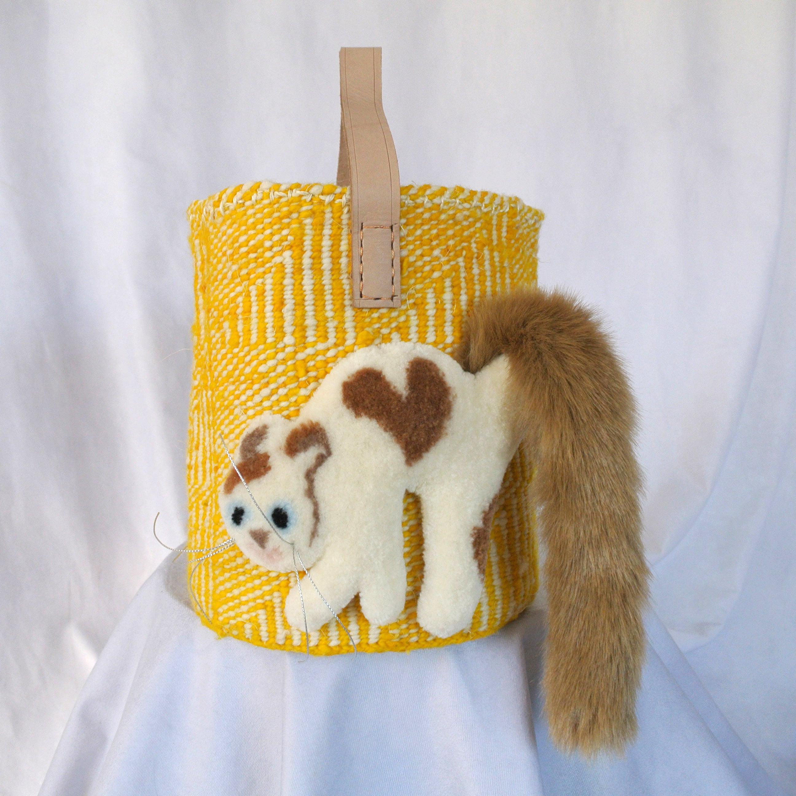 毛糸でモコモコに刺繍した猫ちゃんと、ふわふわロングなシッポがポイントのかごバッグです。小さめで持ちやすいサイズのカゴバッグです。
