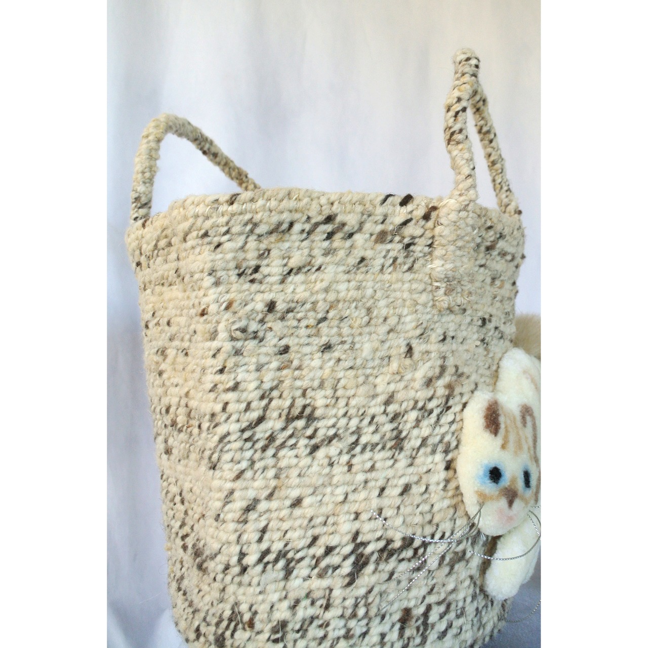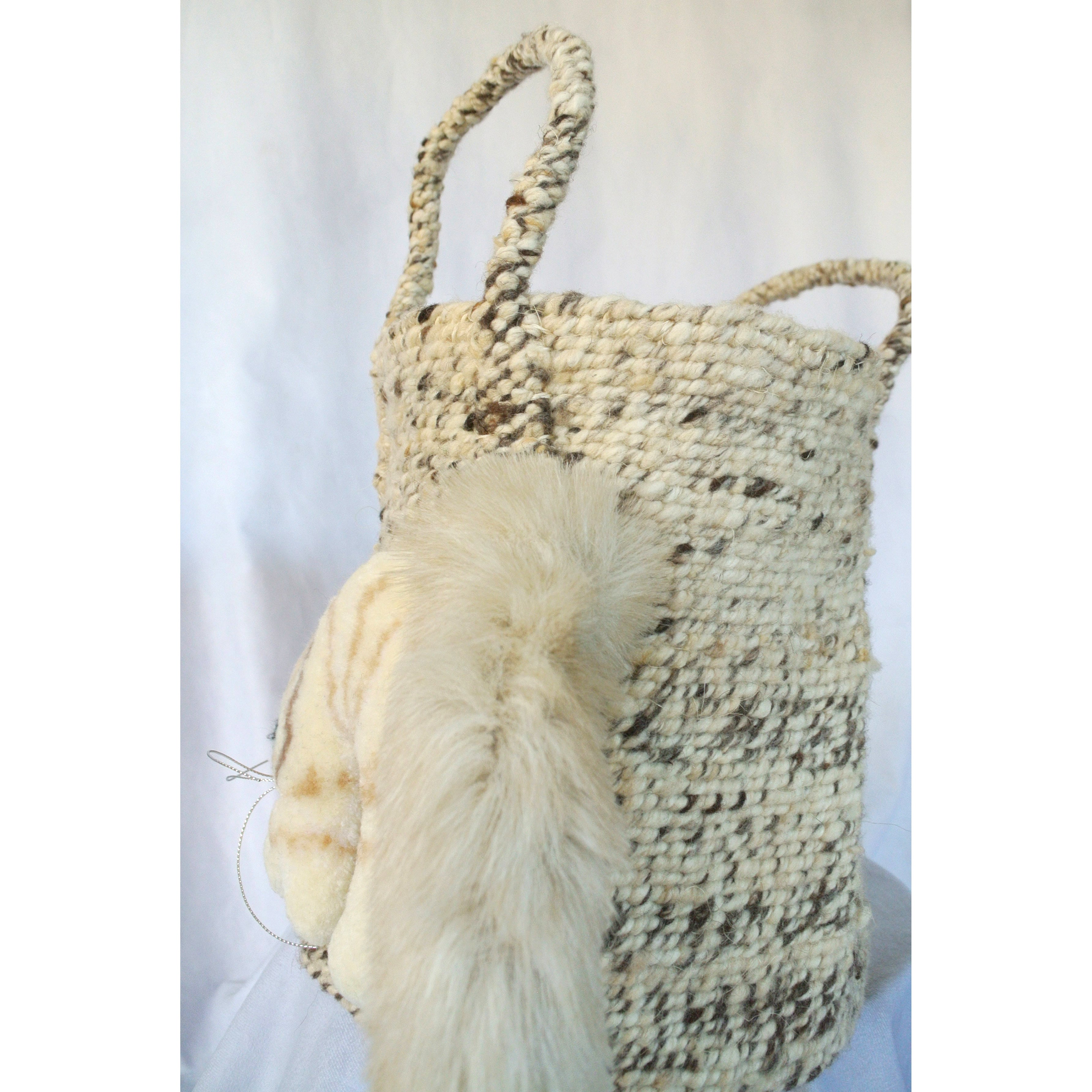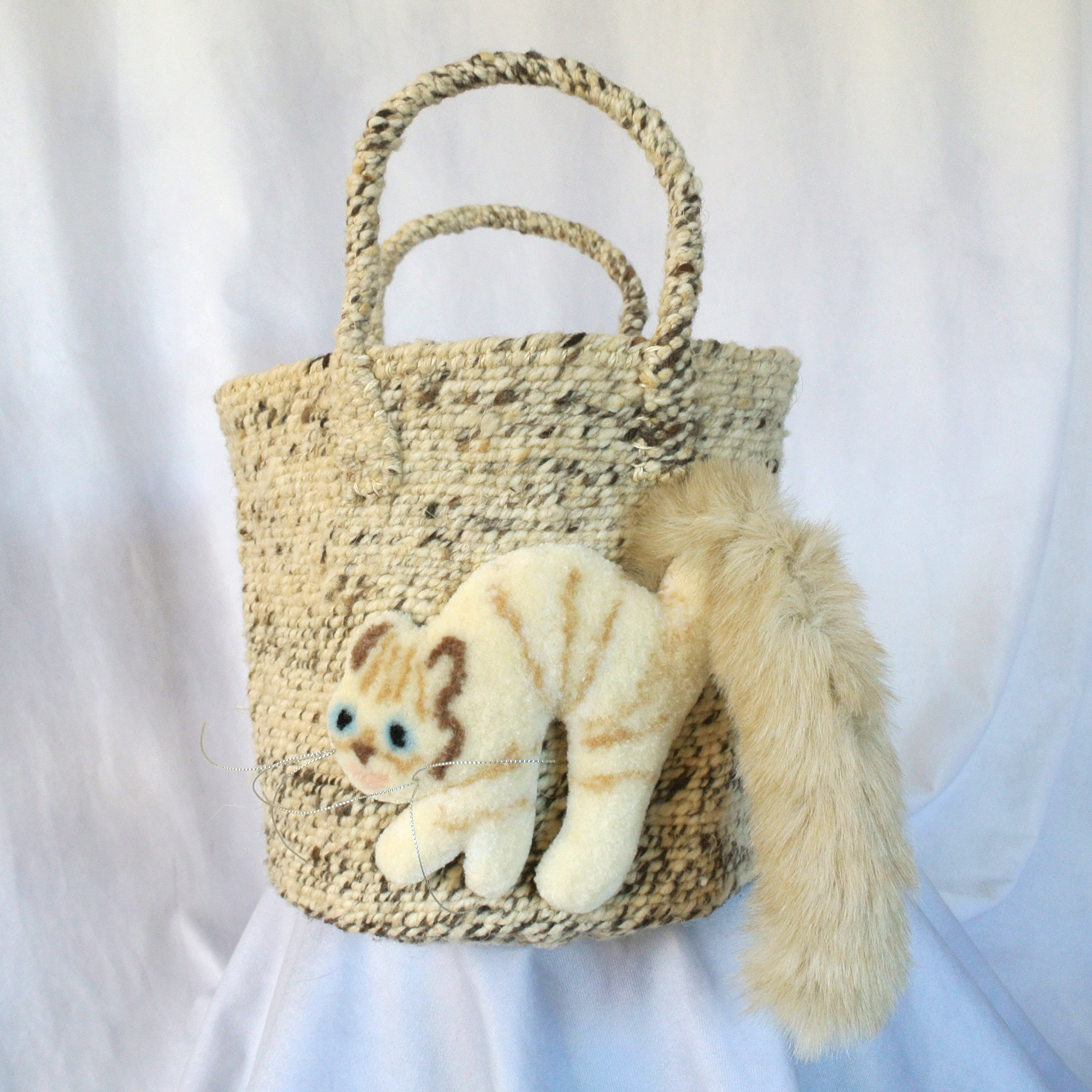 This basket bag features a fluffy cat embroidered with yarn and a long, fluffy tail.