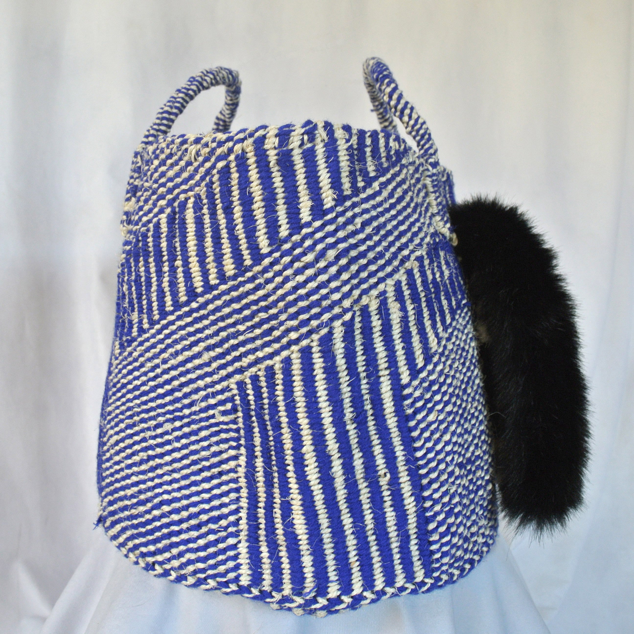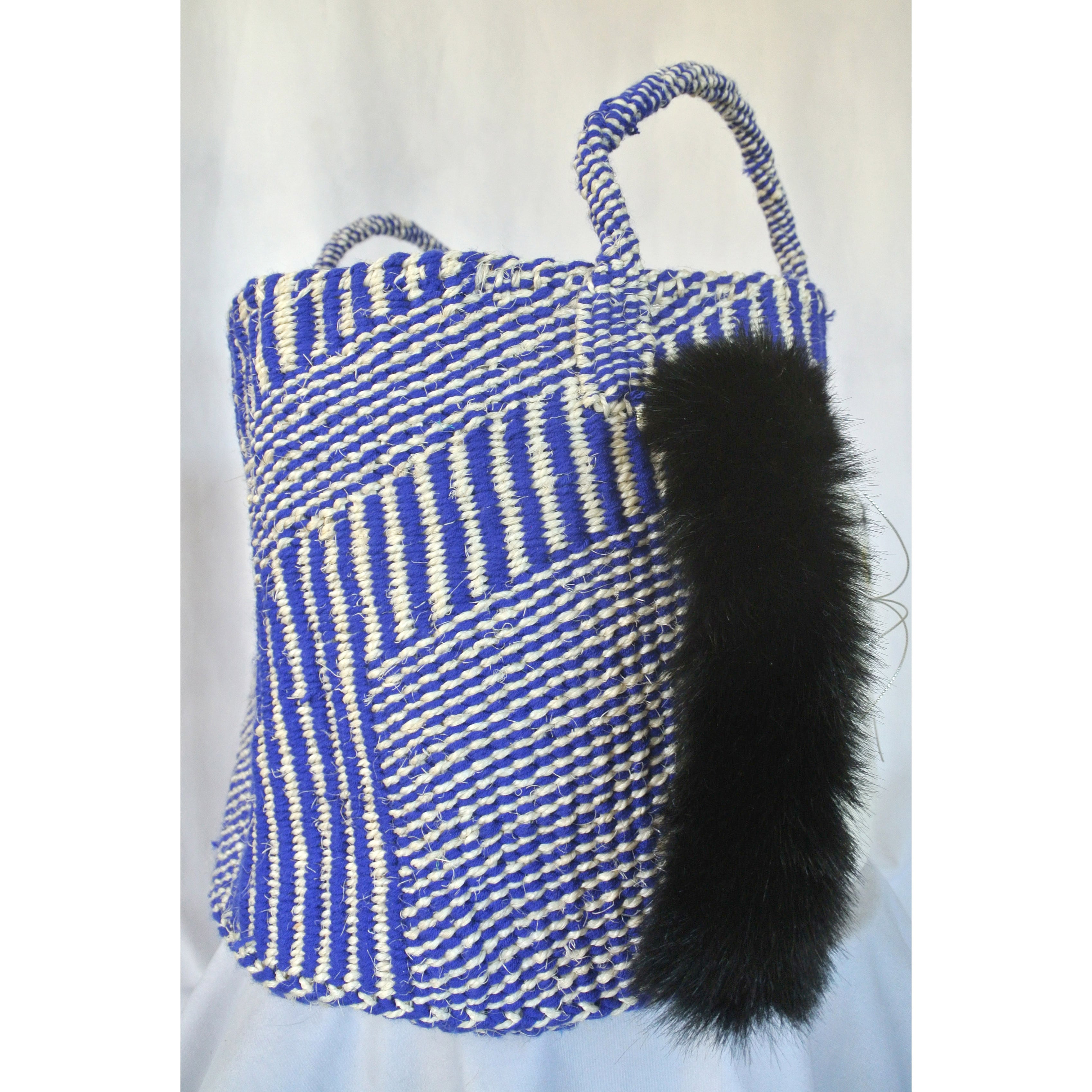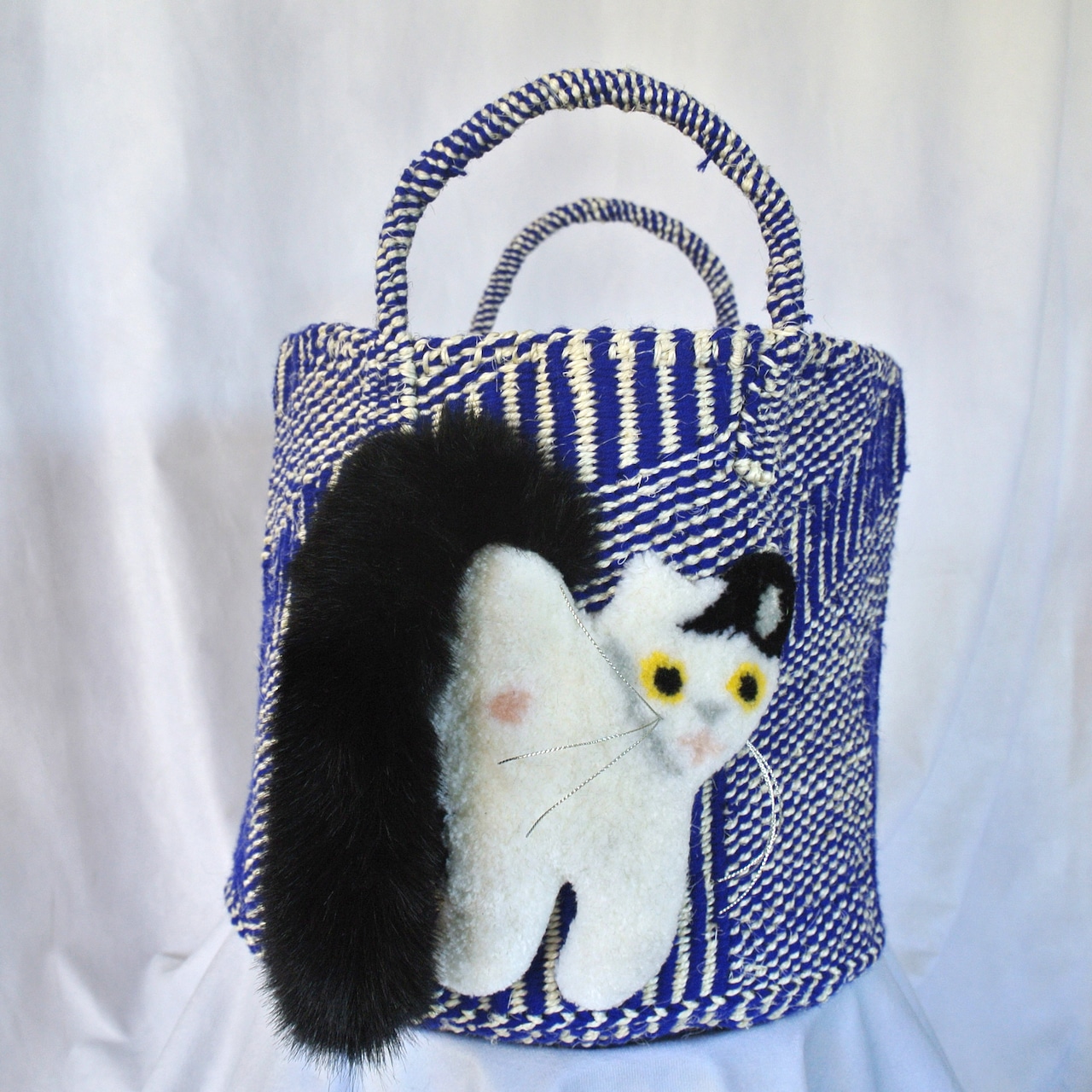 毛糸でモコモコに刺繍した猫ちゃんと、ふわふわロングなシッポがポイントのかごバッグです。