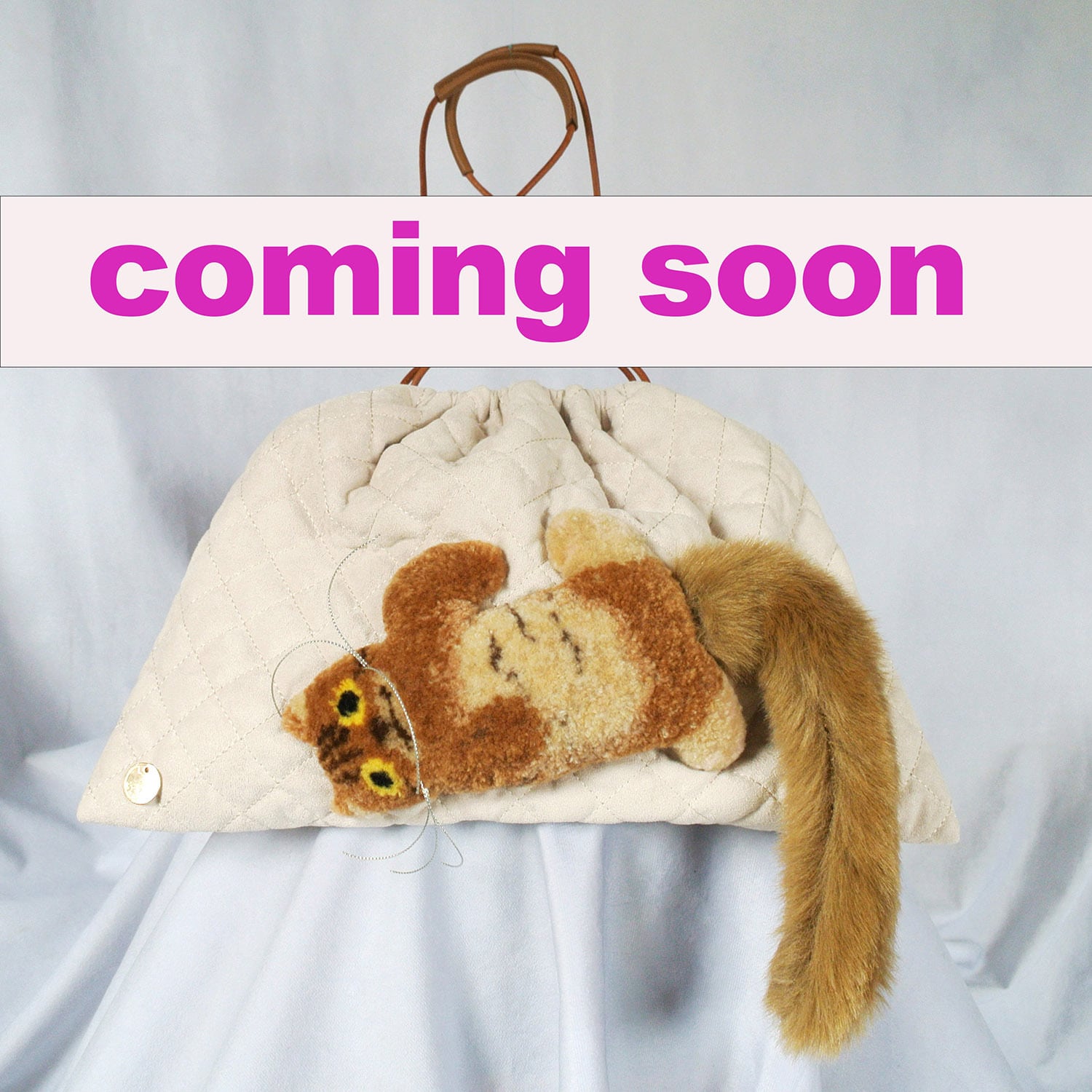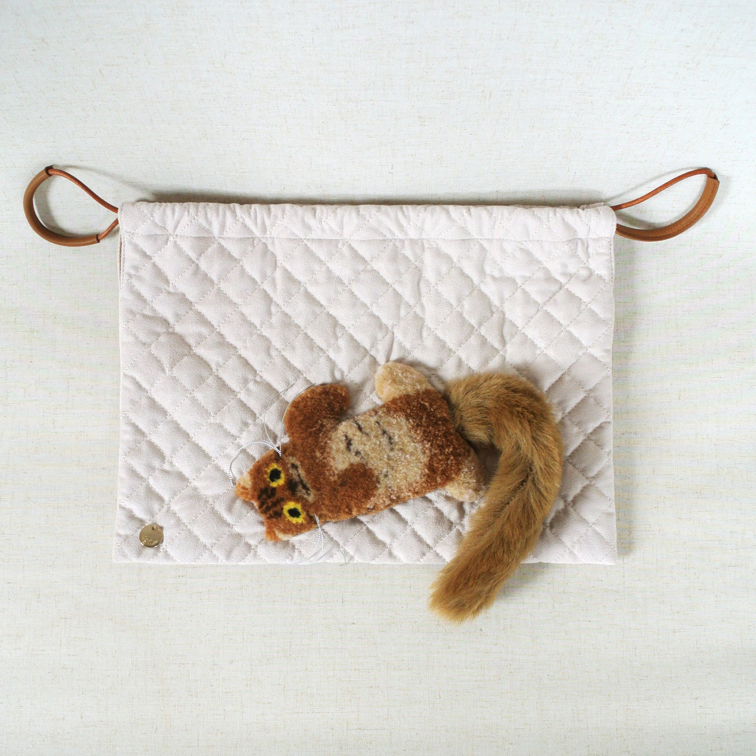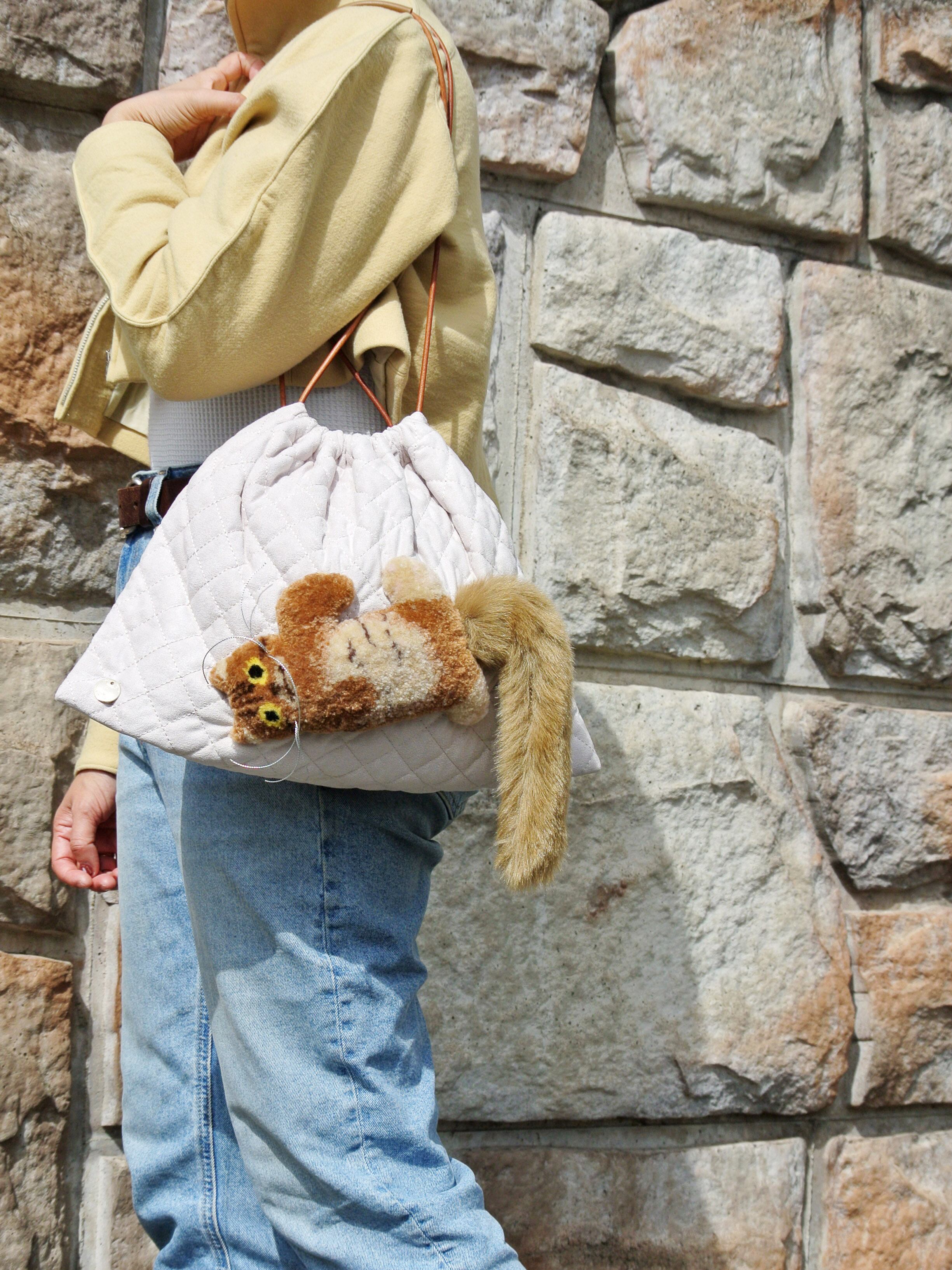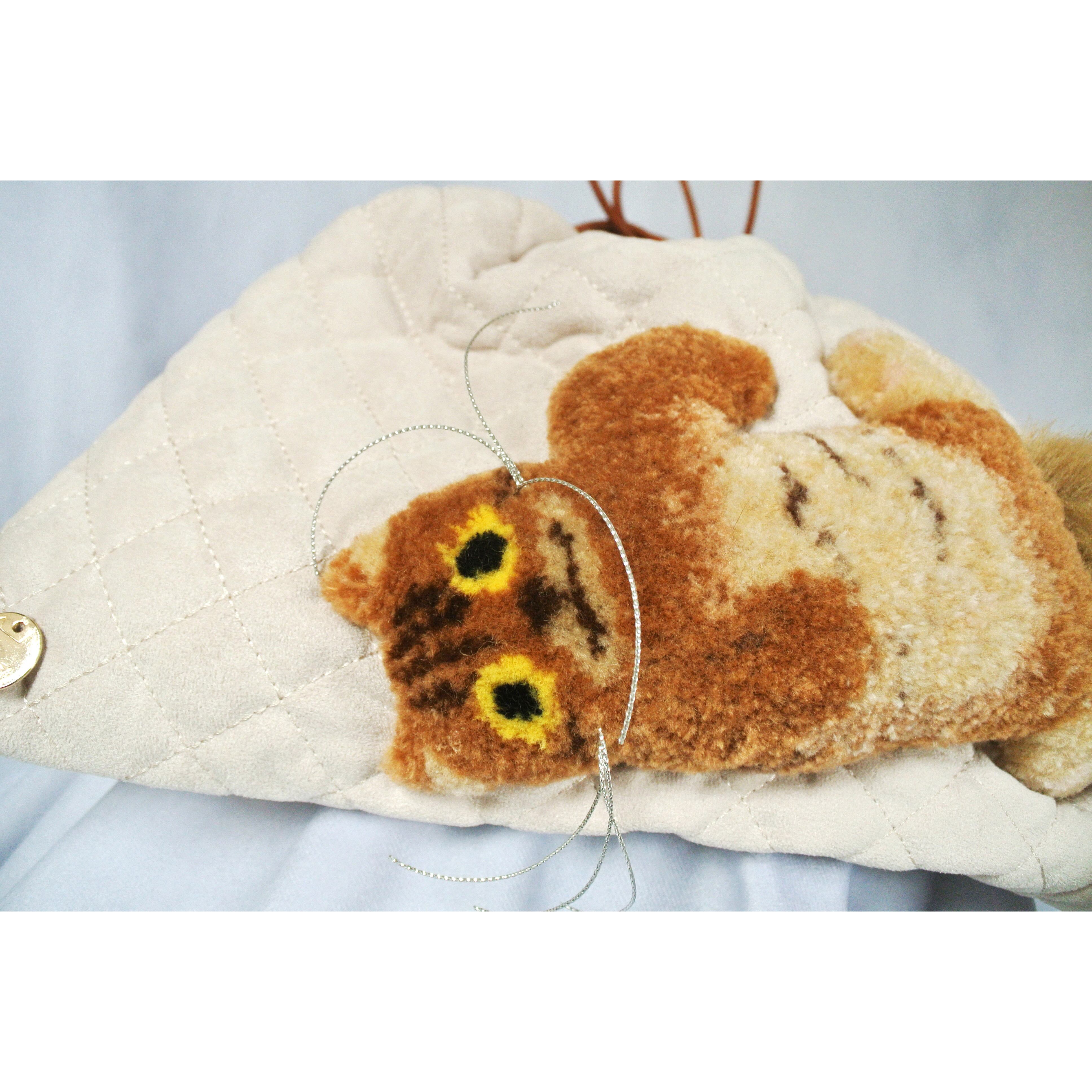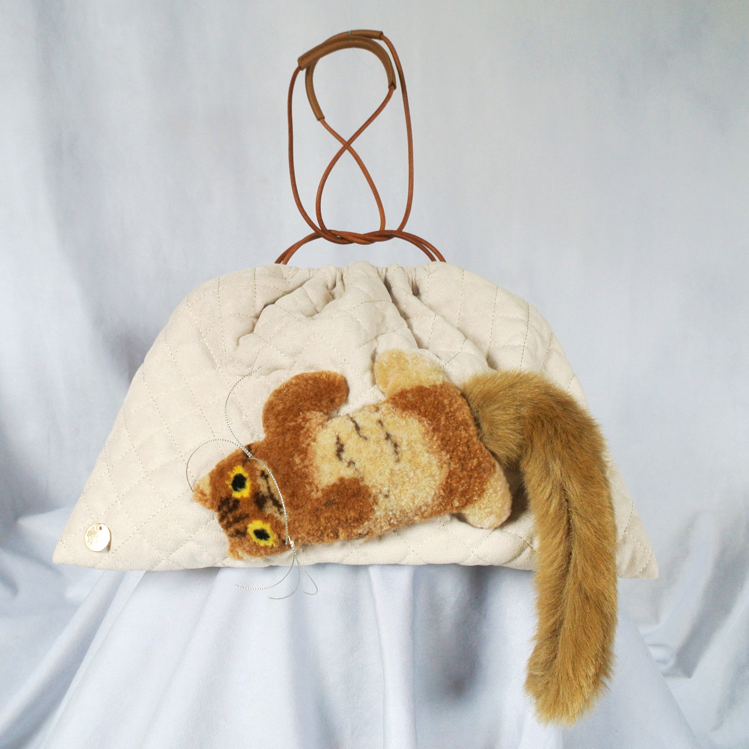 毛糸でモコモコに刺繍した猫ちゃんと、ふわふわなシッポがポイントな巾着バッグです。