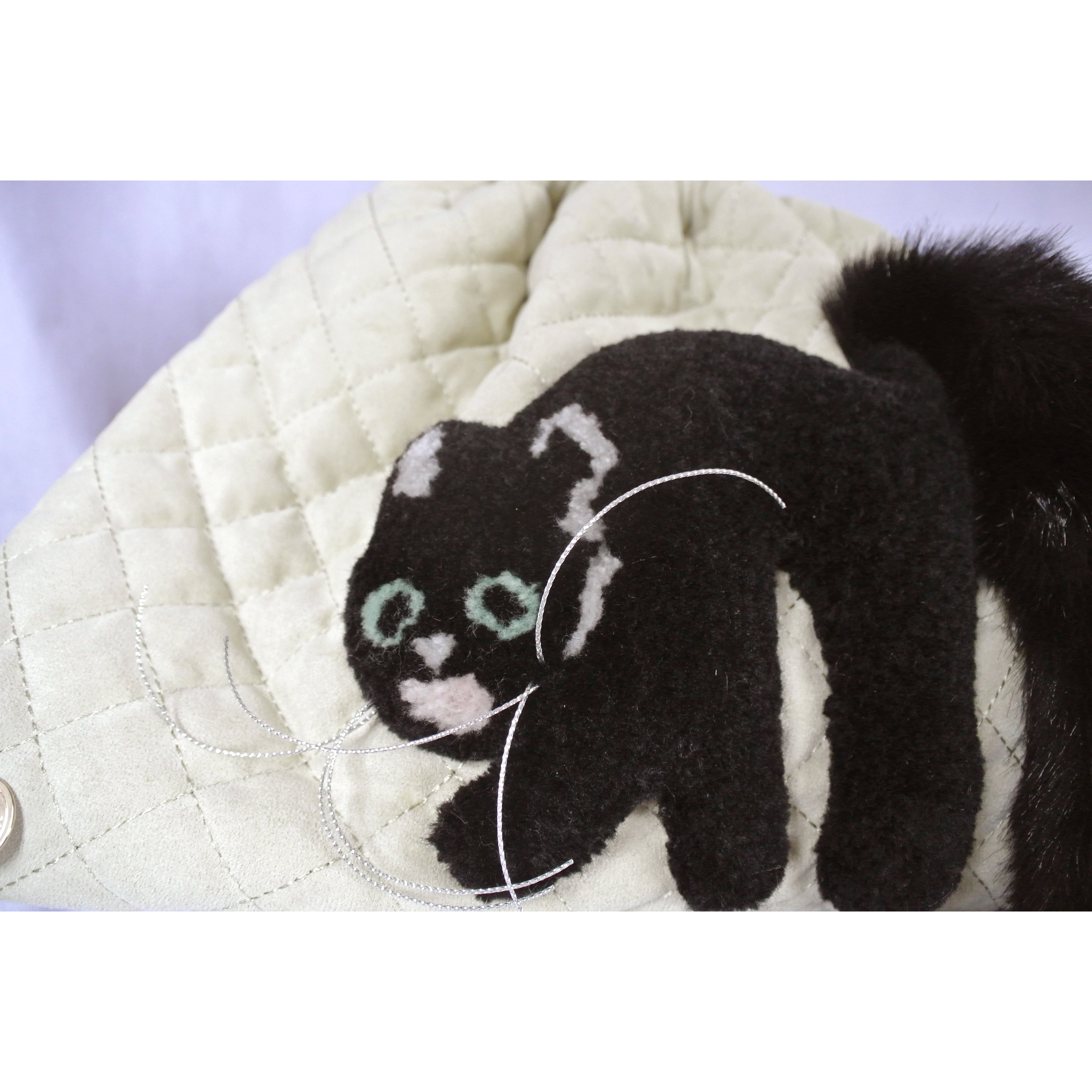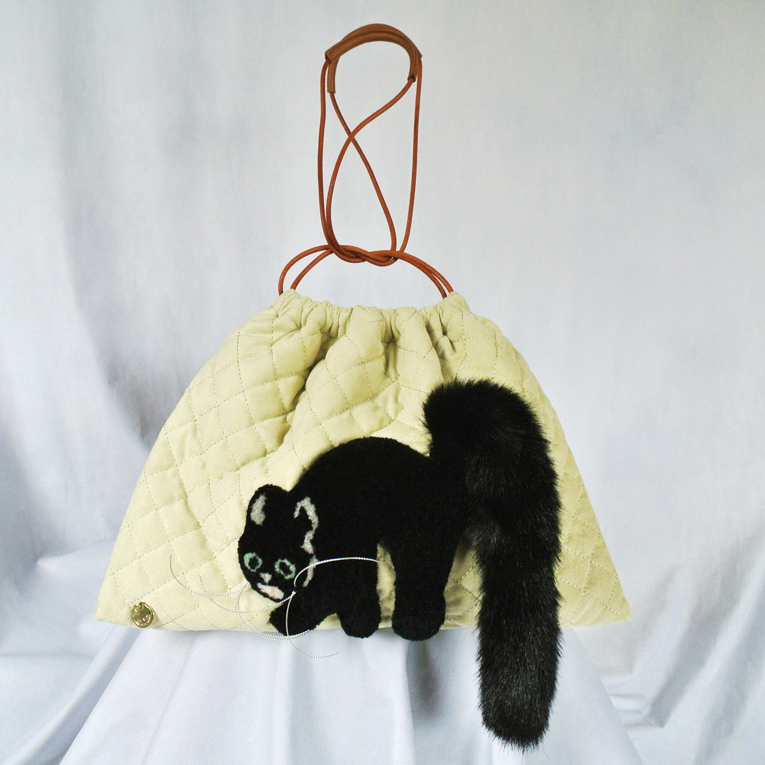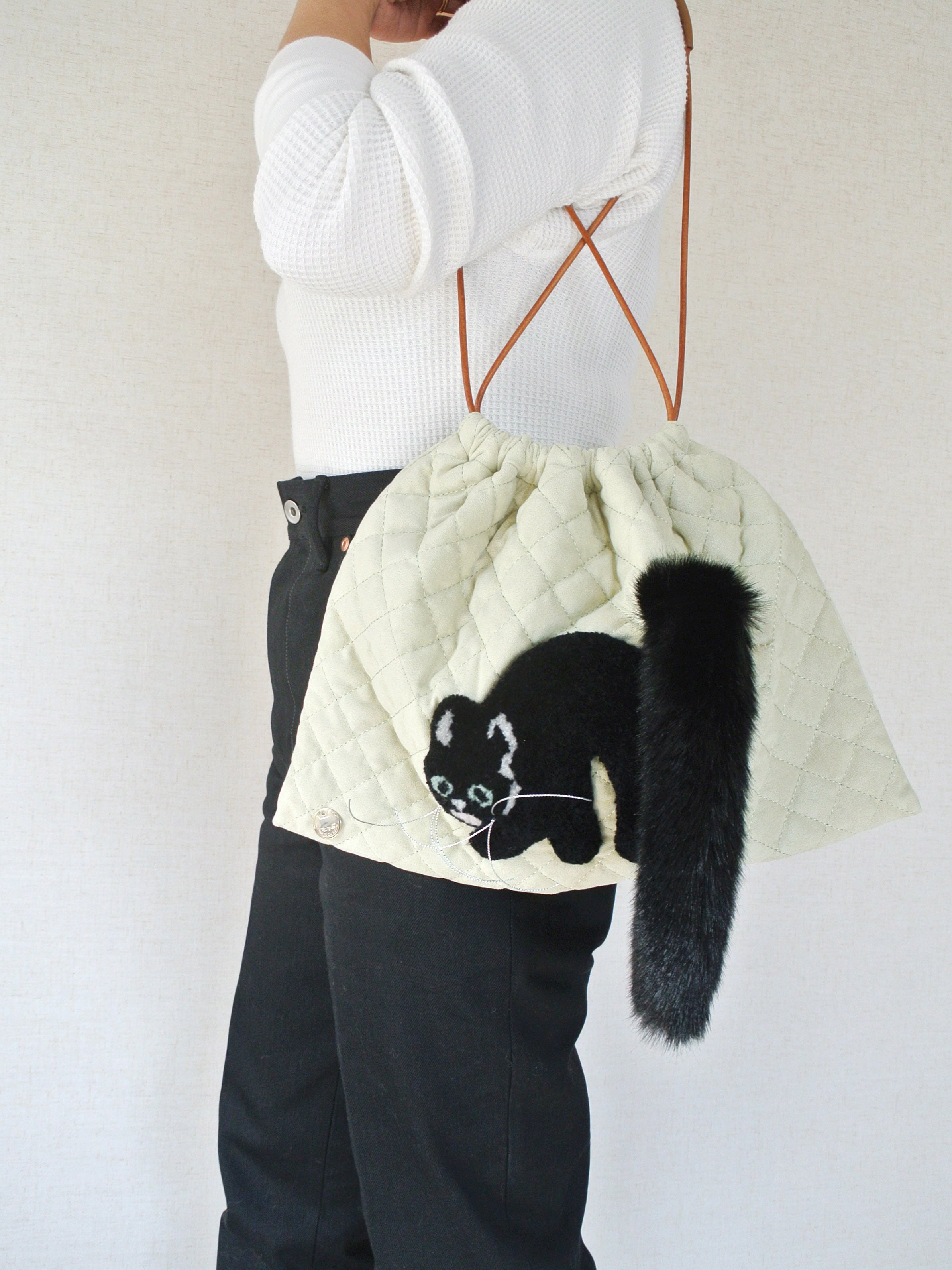 毛糸でモコモコに刺繍した猫ちゃんと、ふわふわなシッポがポイントな巾着バッグです。