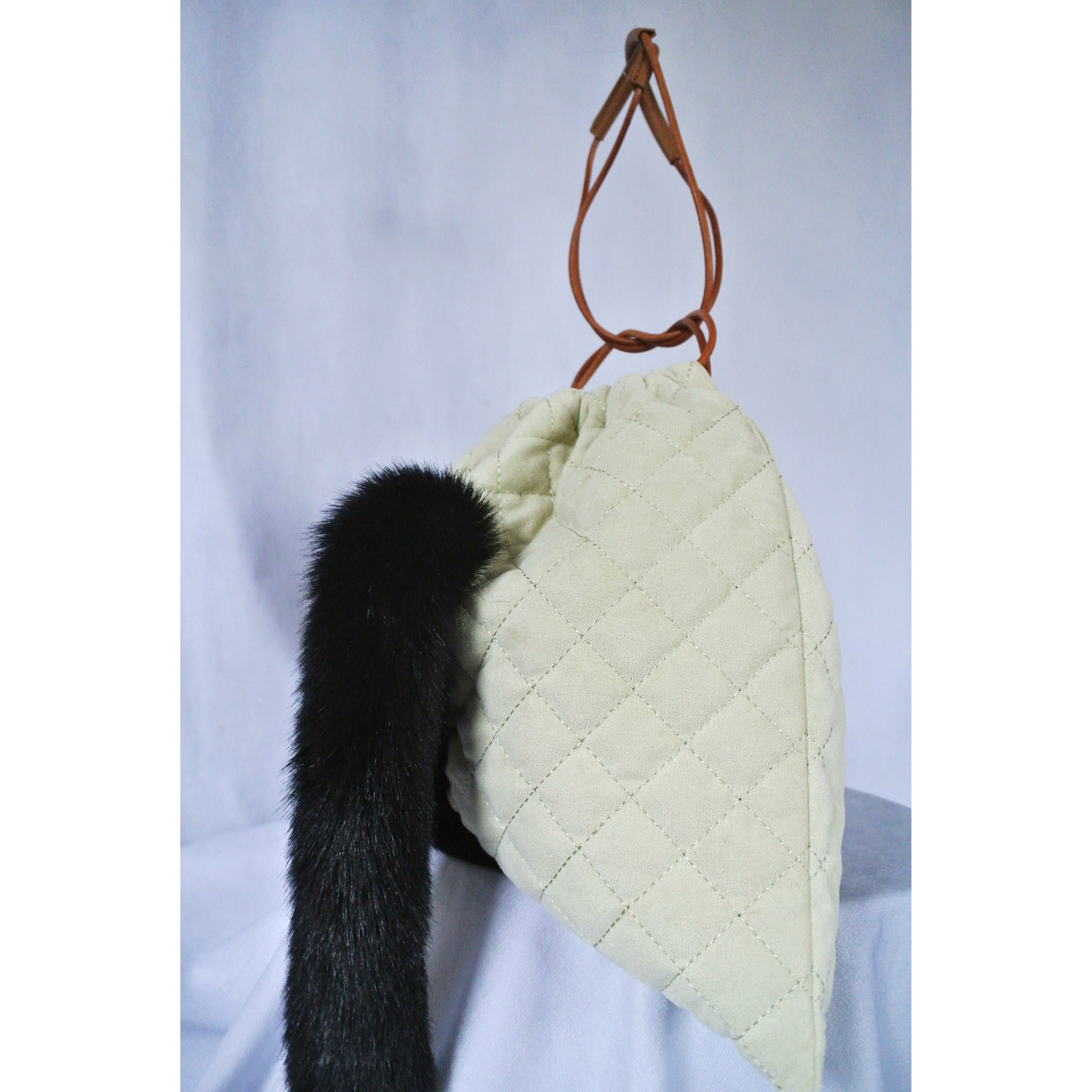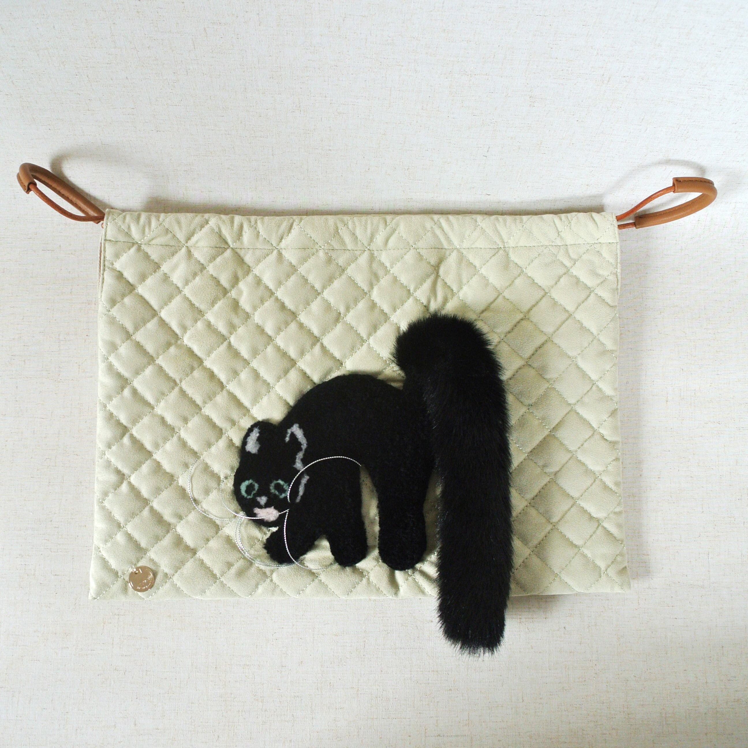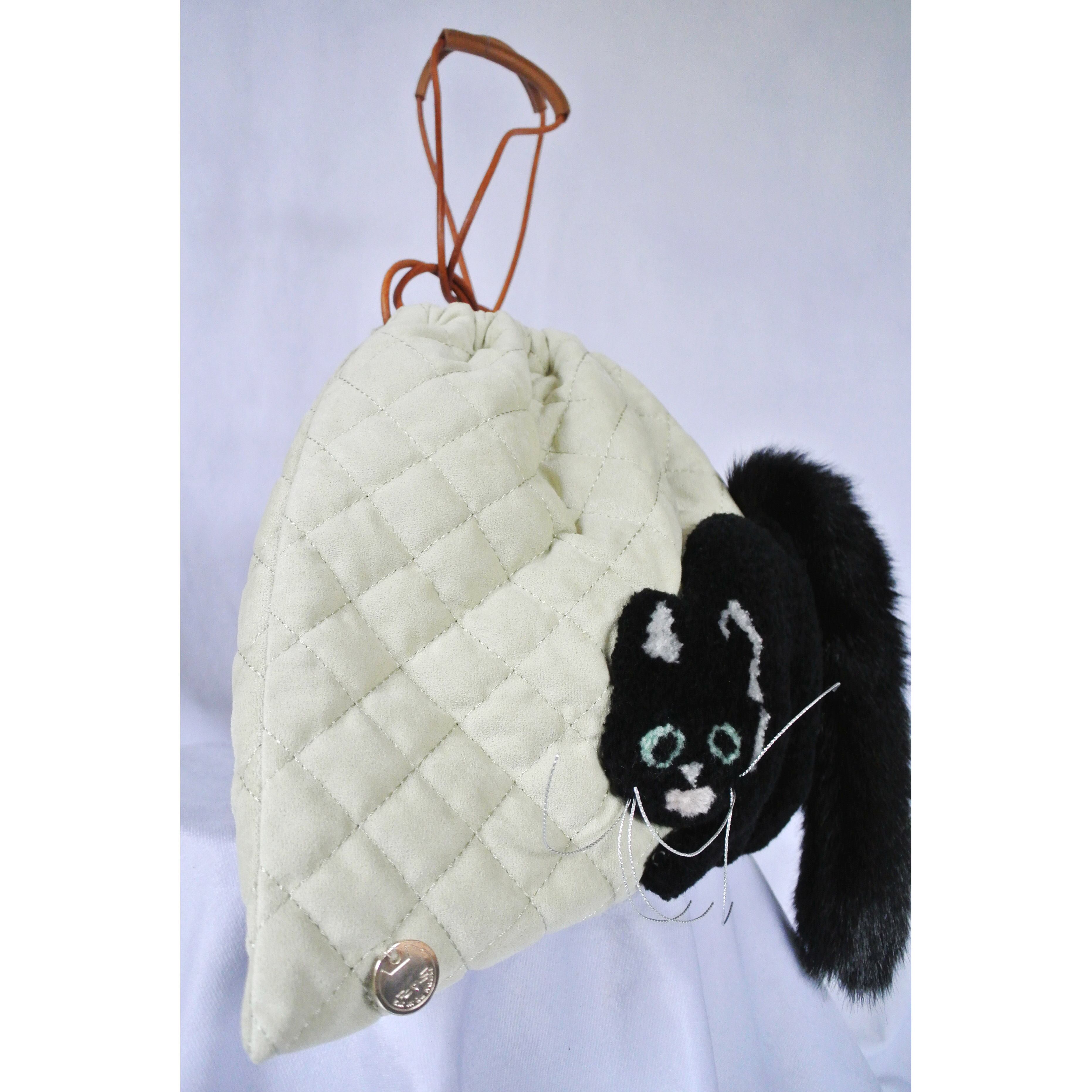 毛糸でモコモコに刺繍した猫ちゃんと、ふわふわなシッポがポイントな巾着バッグです。