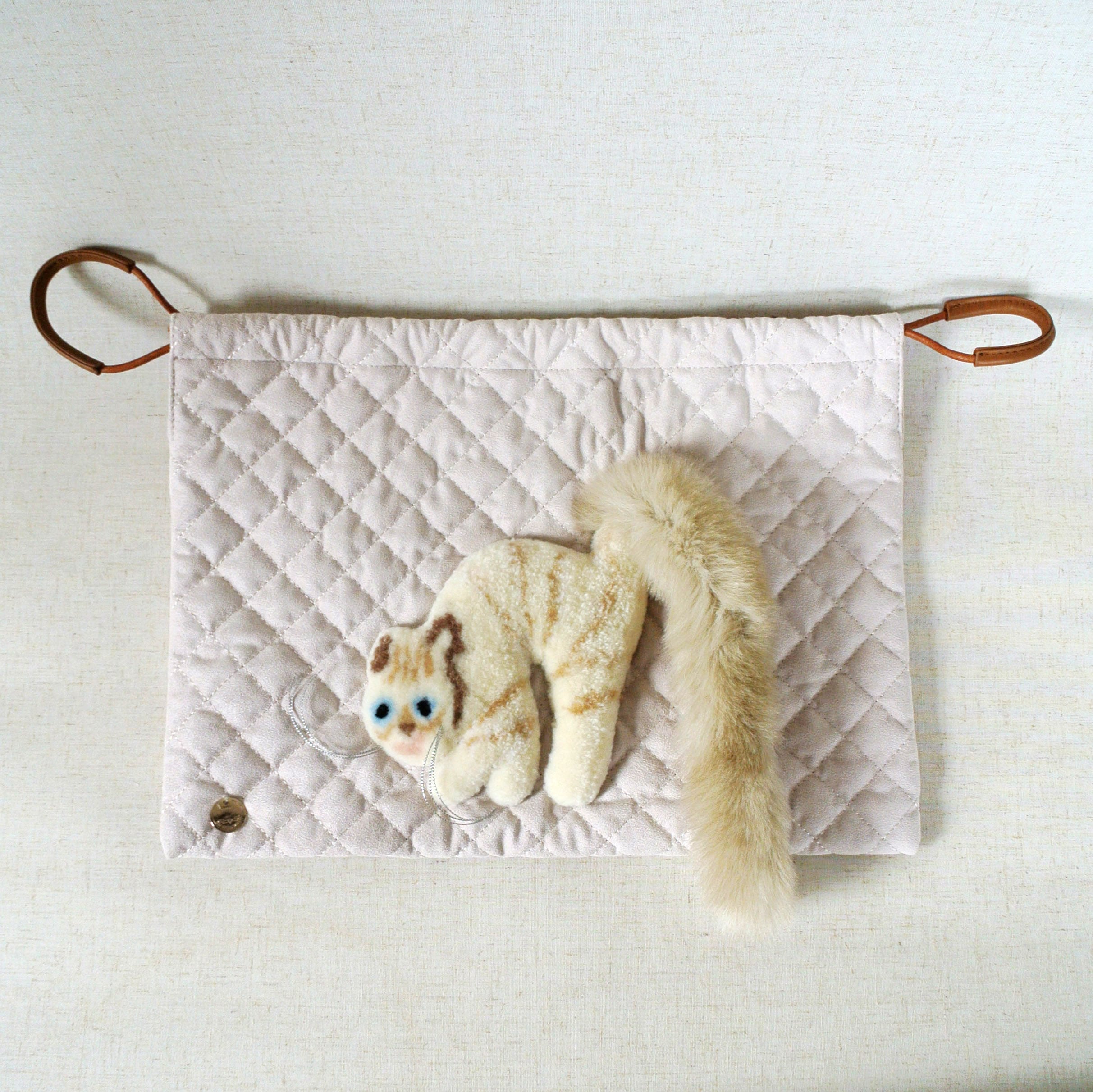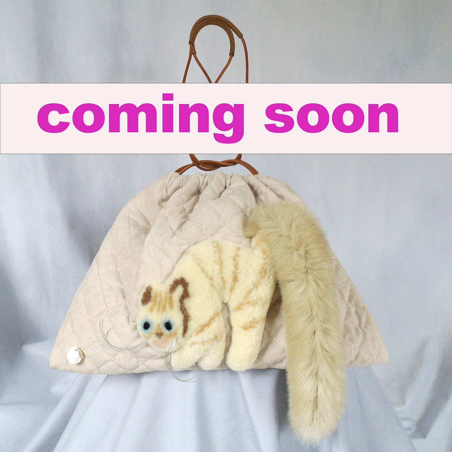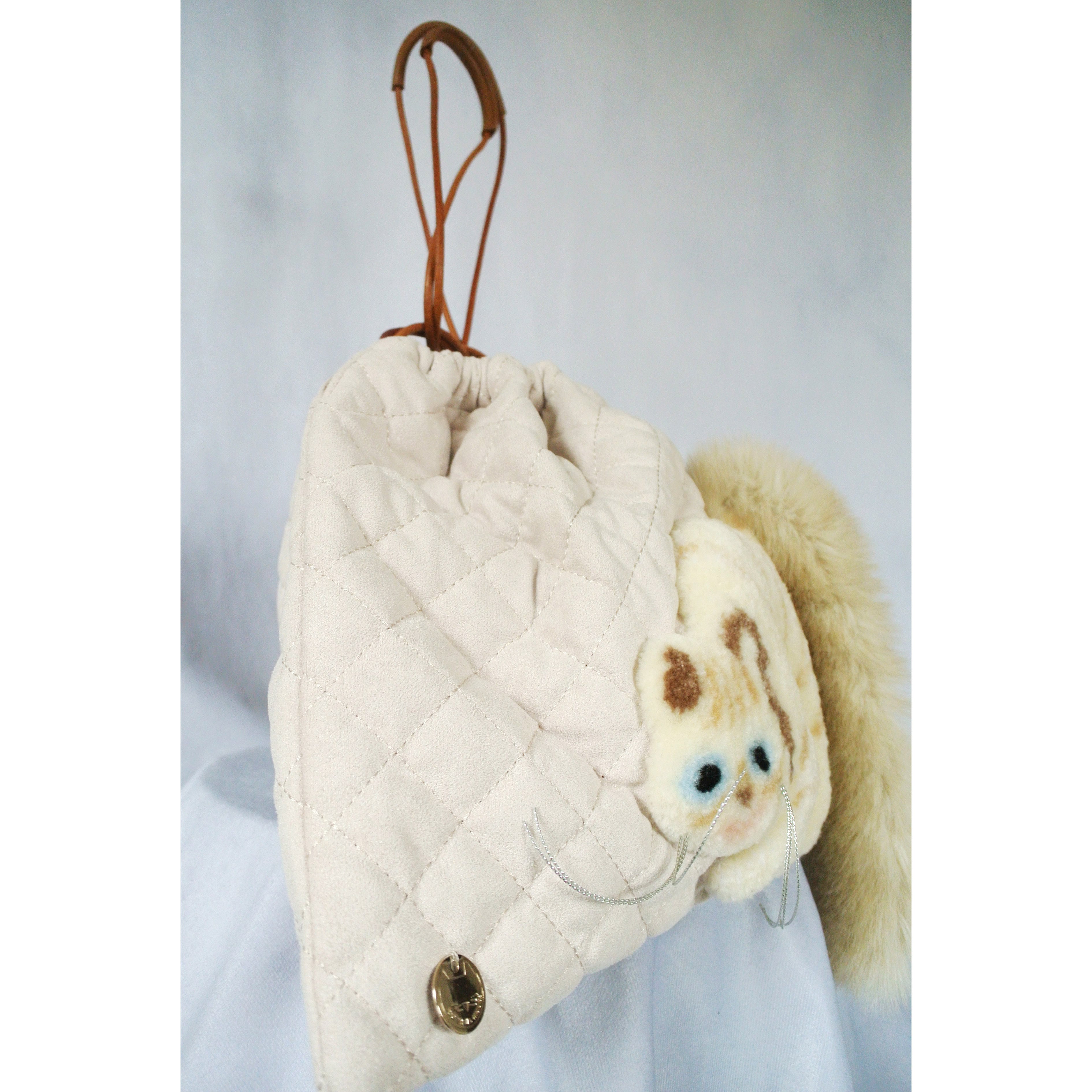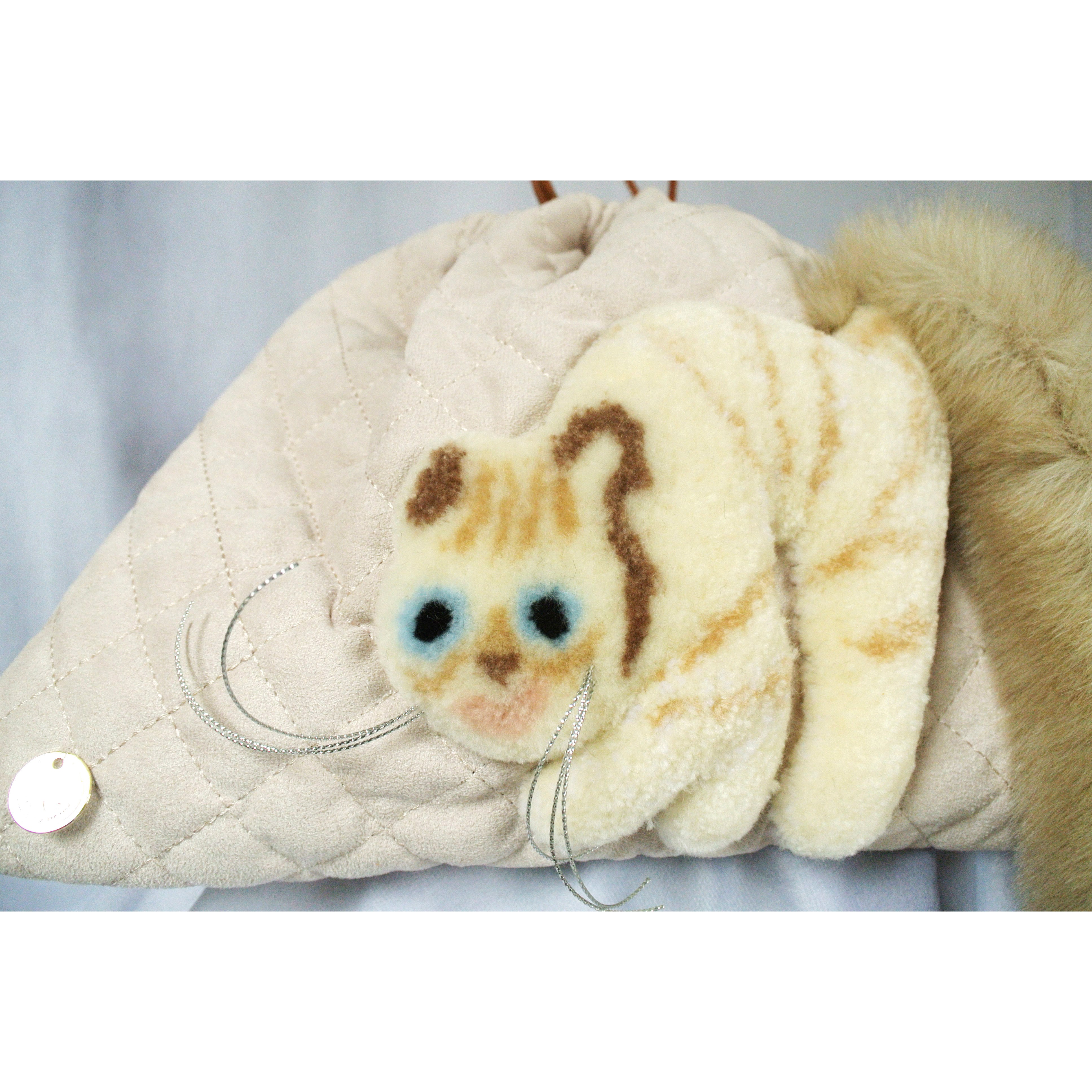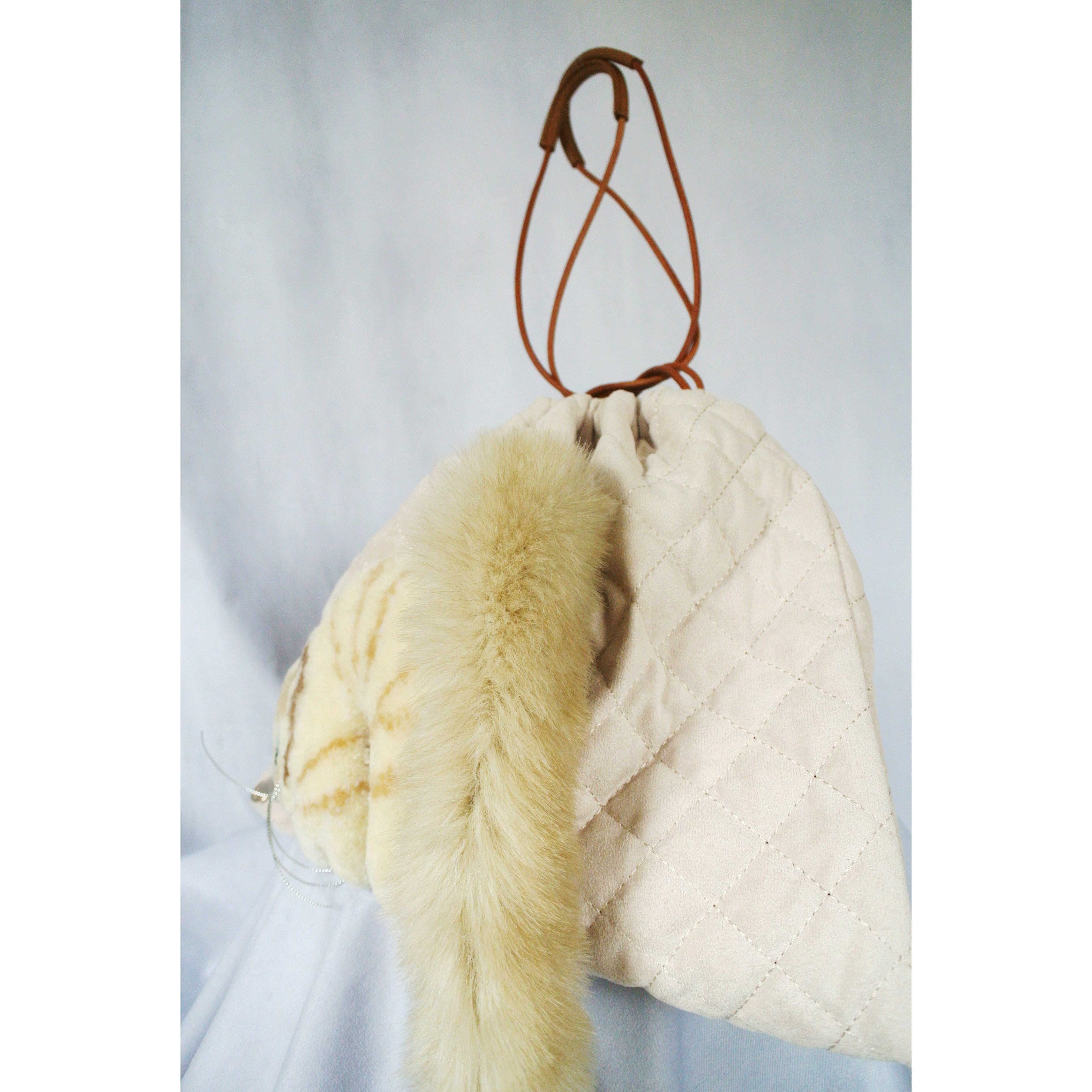毛糸でモコモコに刺繍した猫ちゃんと、ふわふわなシッポがポイントな巾着バッグです。