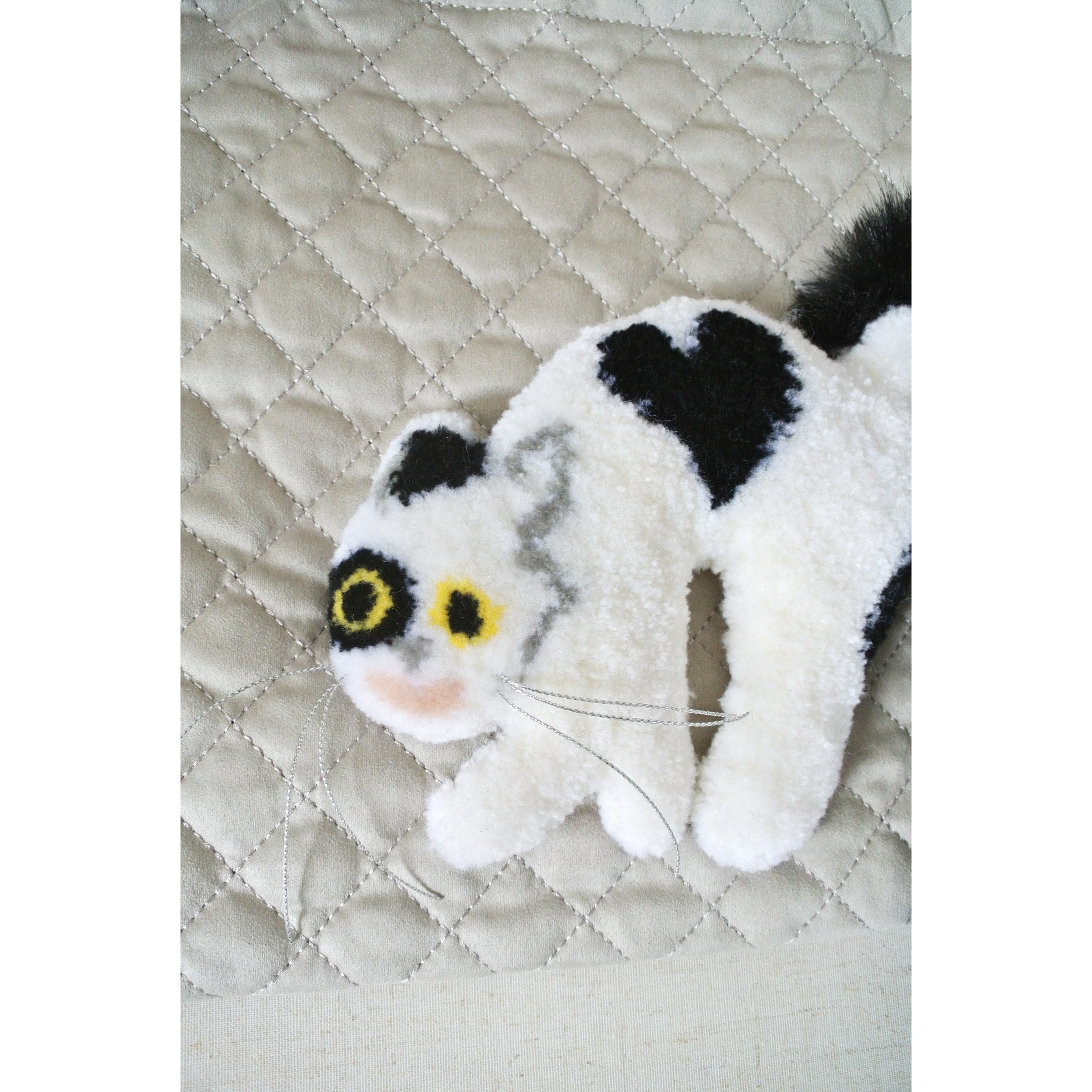 猫のモコモコ刺繍部分は、ラグを作る要領で職人がハンドメイドで仕上げているため、一つ一つ表情が異なります。ご了承ください。