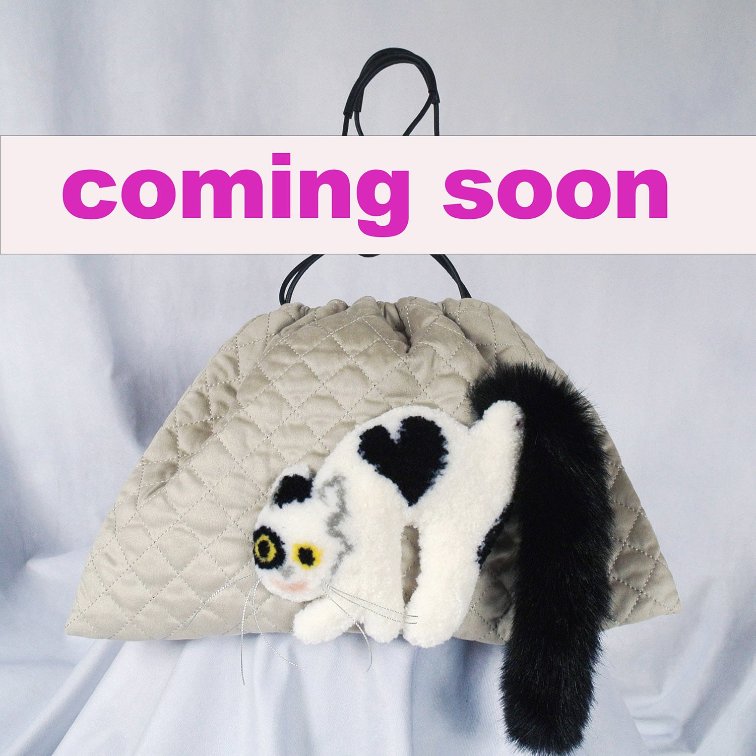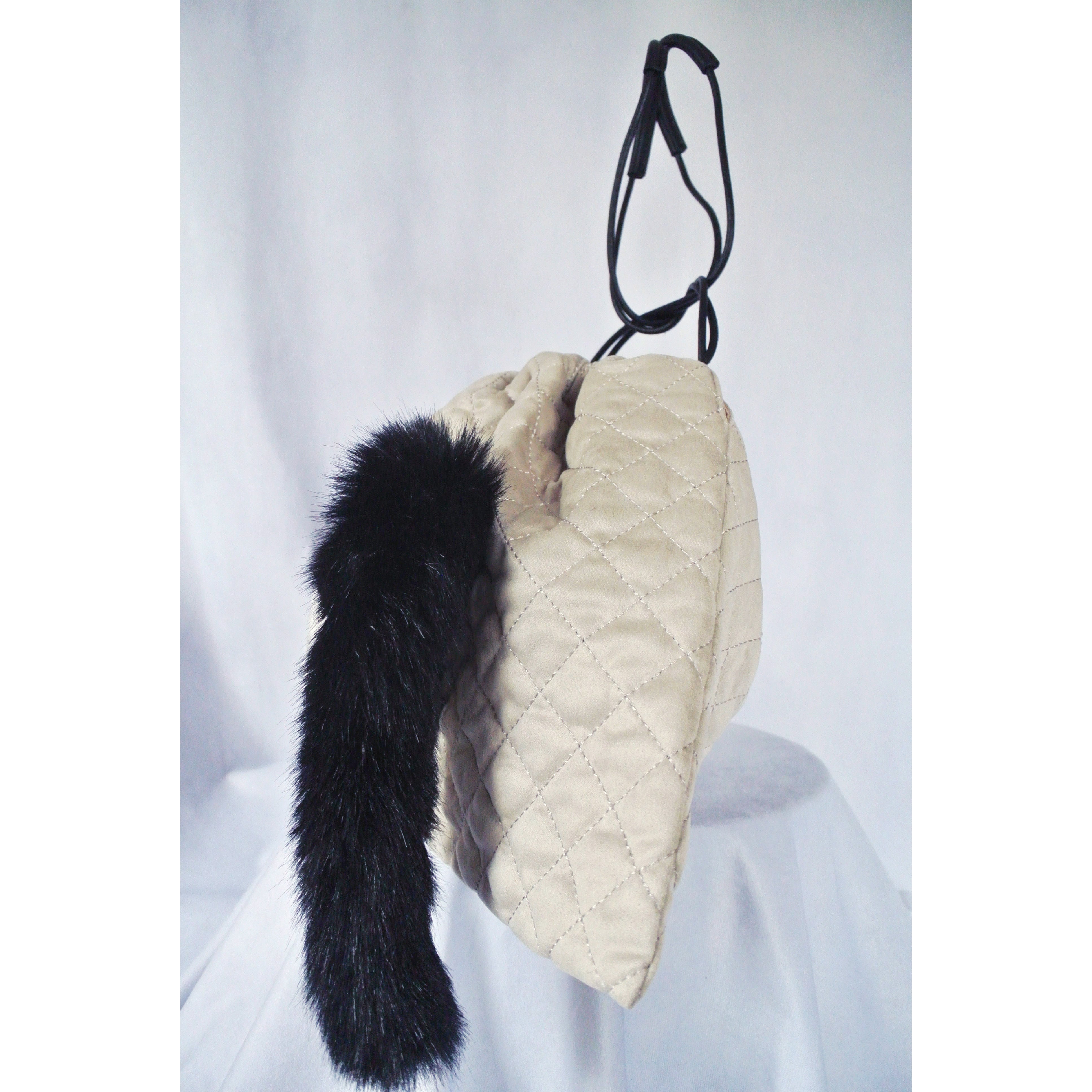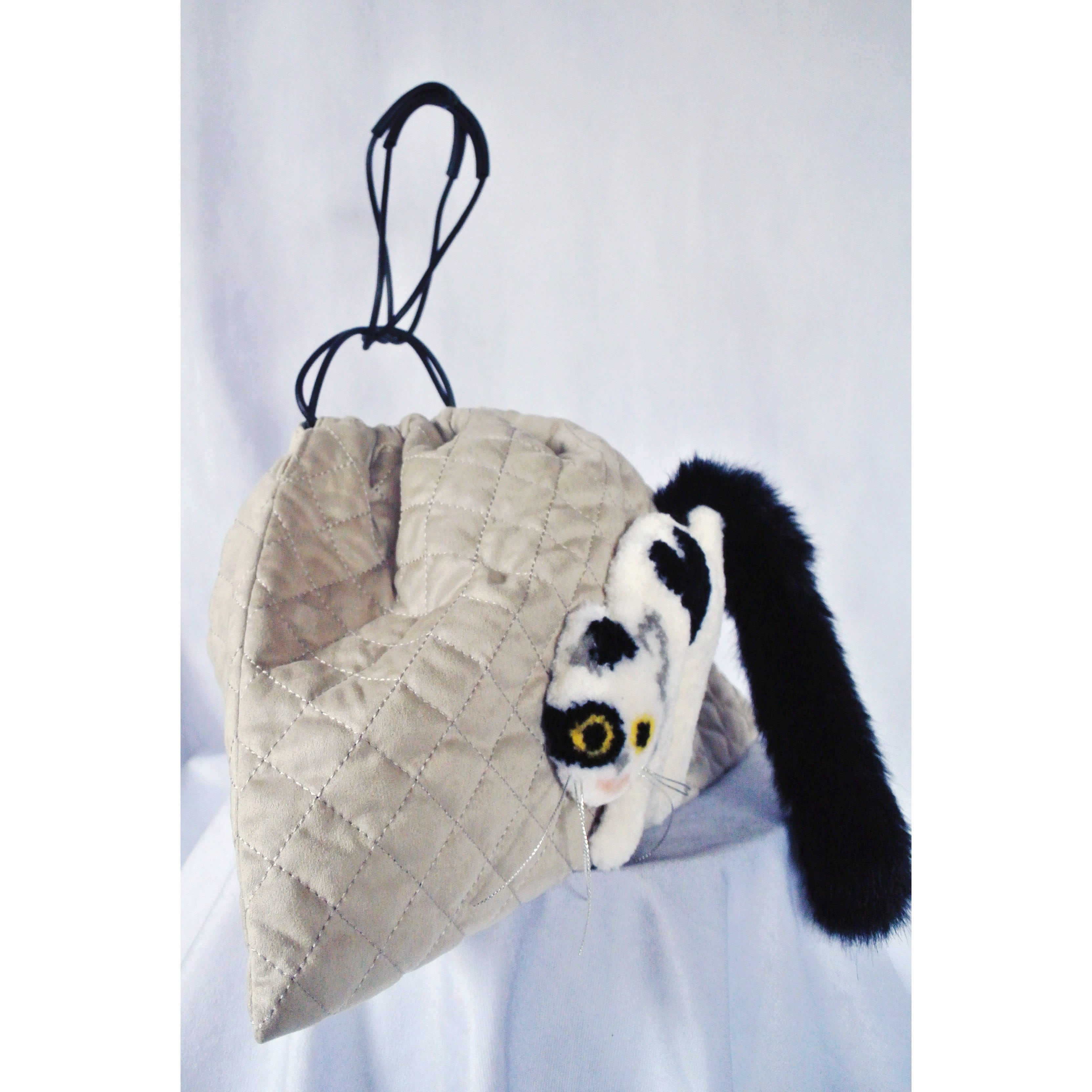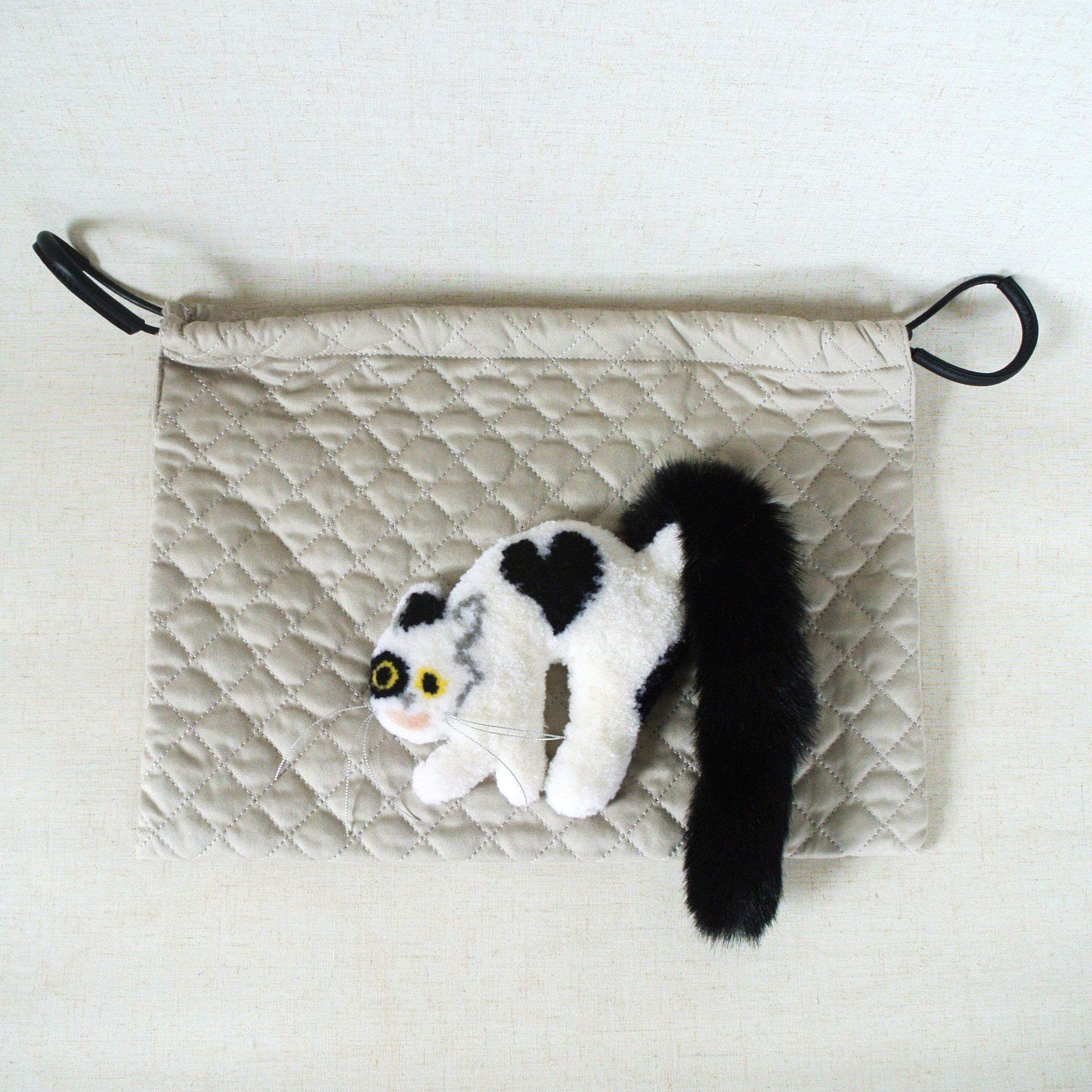 毛糸でモコモコに刺繍した猫ちゃんと、ふわふわなシッポがポイントな巾着バッグです。