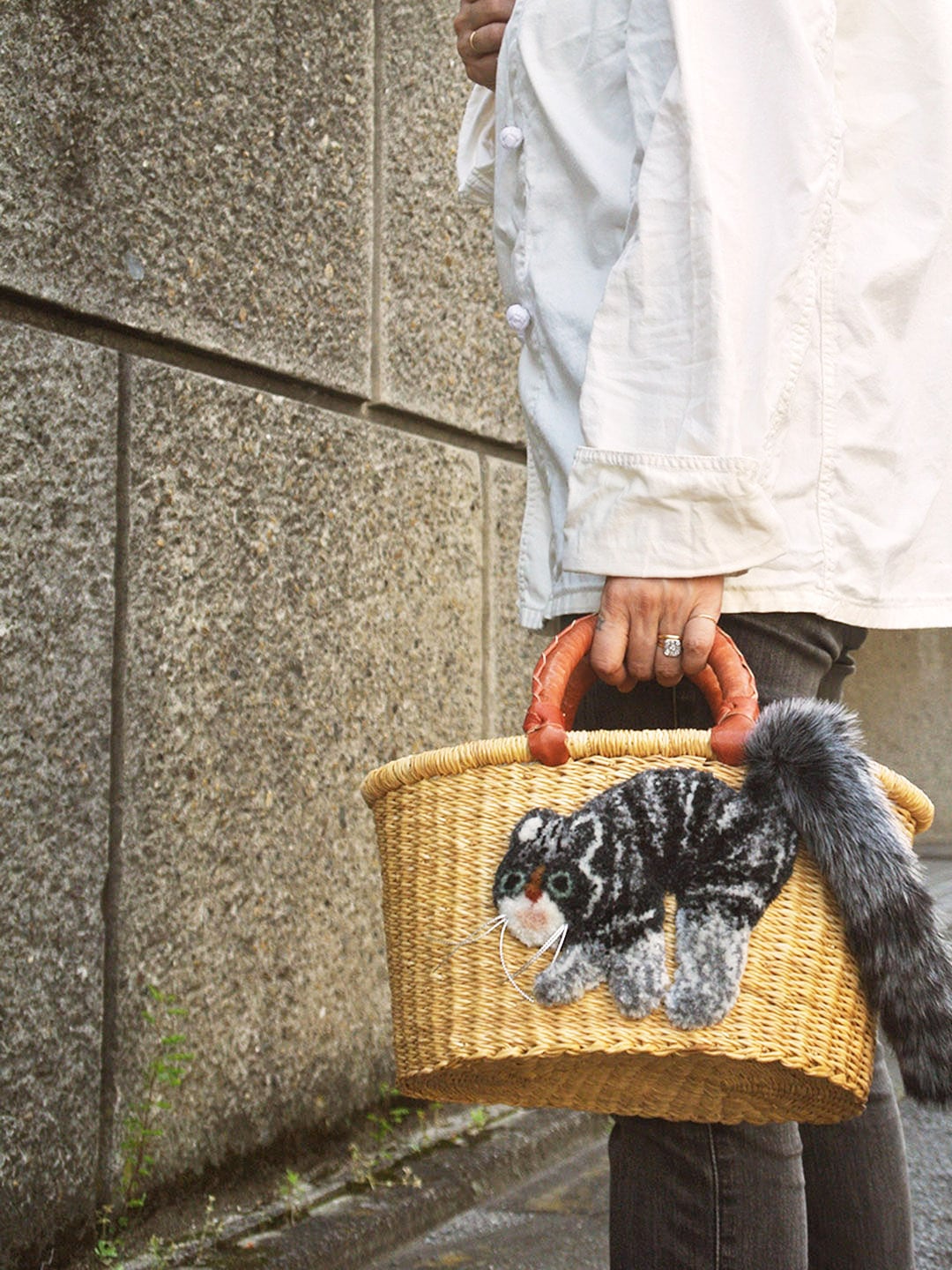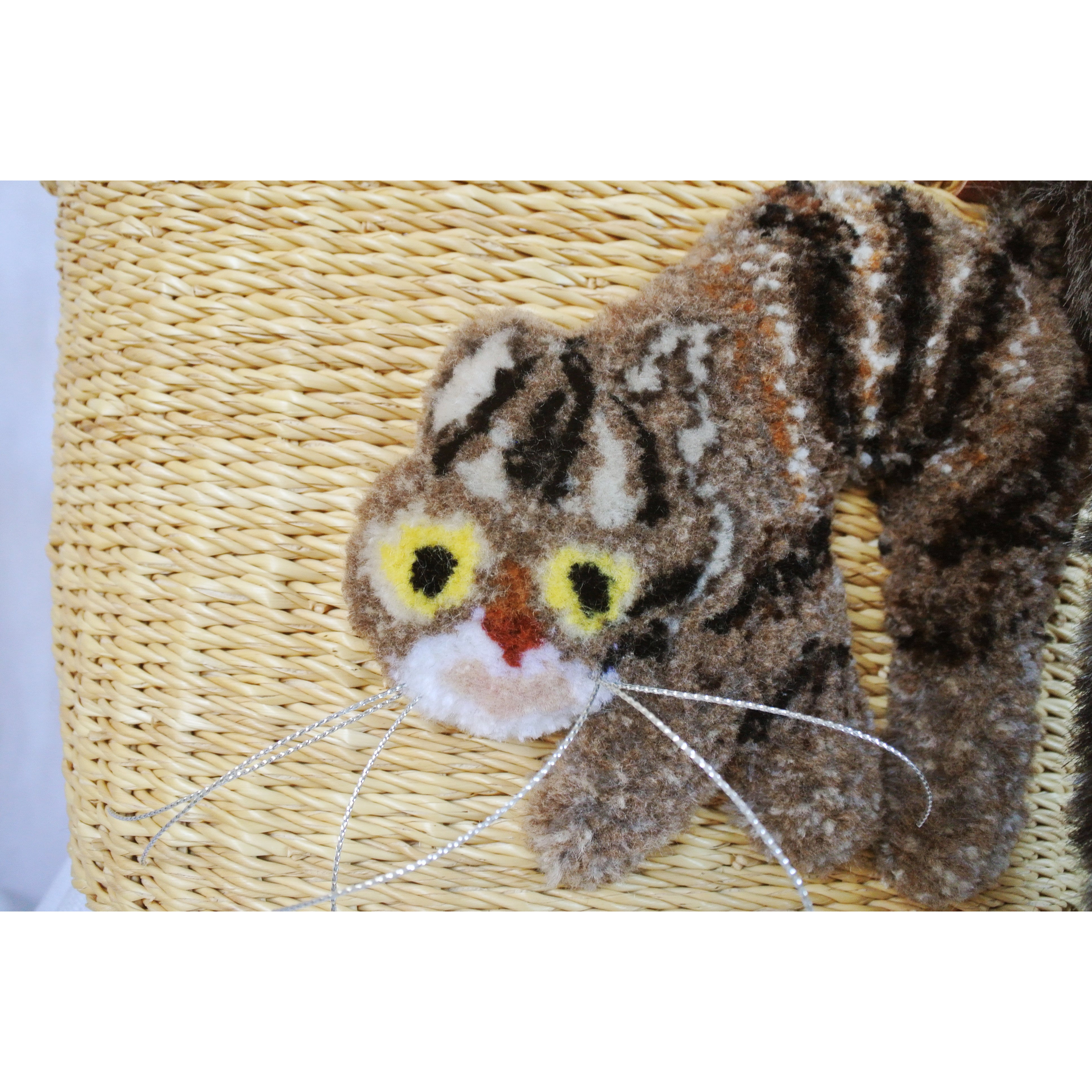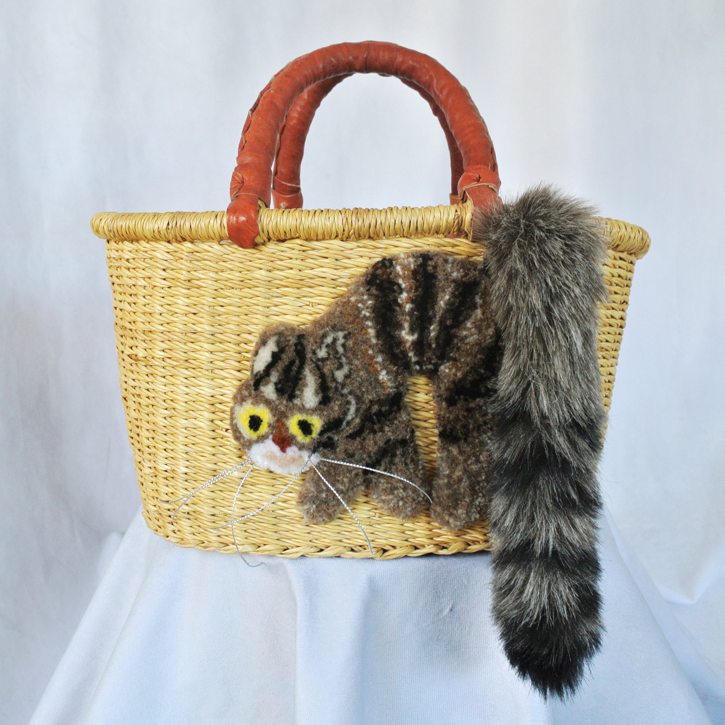 エレファントグラス(イネ科の水草)を編み上げた本体はしっかりと編まれており、自立します。毛糸でモコモコに刺繍した猫ちゃんと、ふわふわロングなシッポがポイントのかごバッグです。