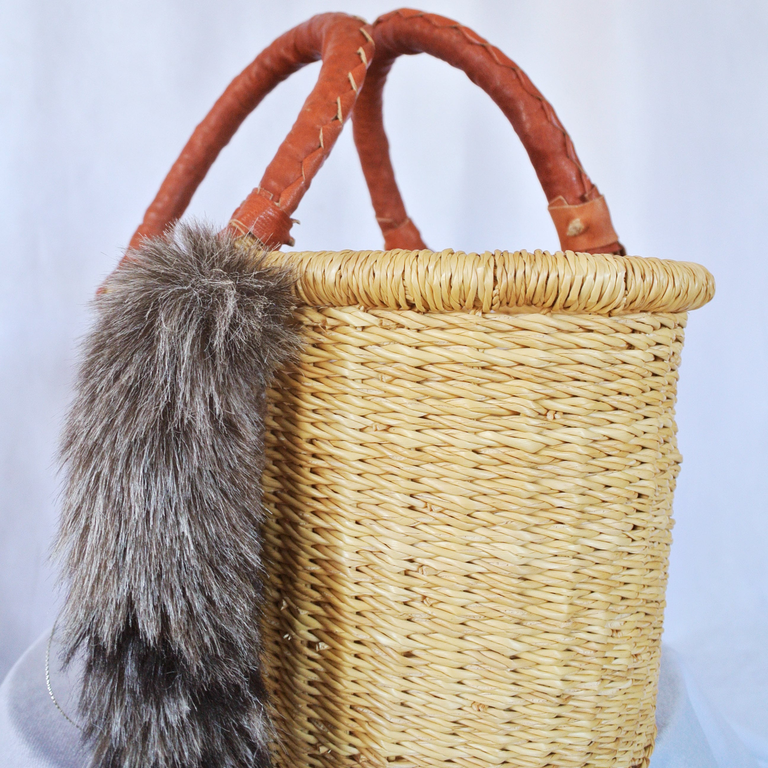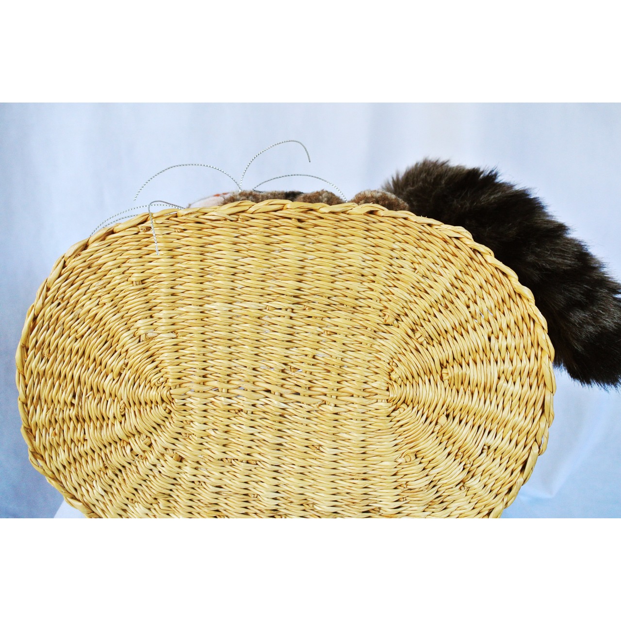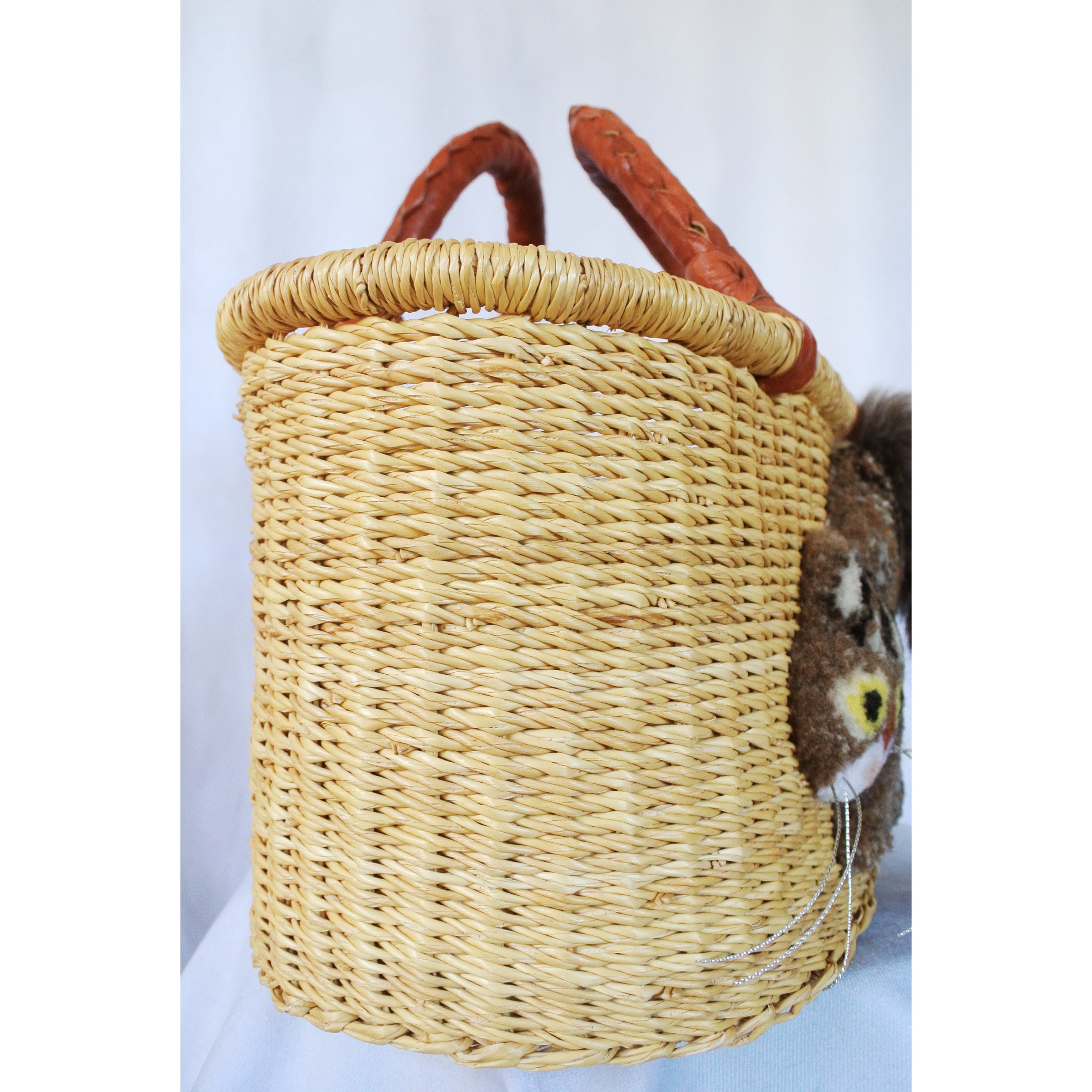 エレファントグラス(イネ科の水草)を編み上げた本体はしっかりと編まれており、自立します。毛糸でモコモコに刺繍した猫ちゃんと、ふわふわロングなシッポがポイントのかごバッグです。