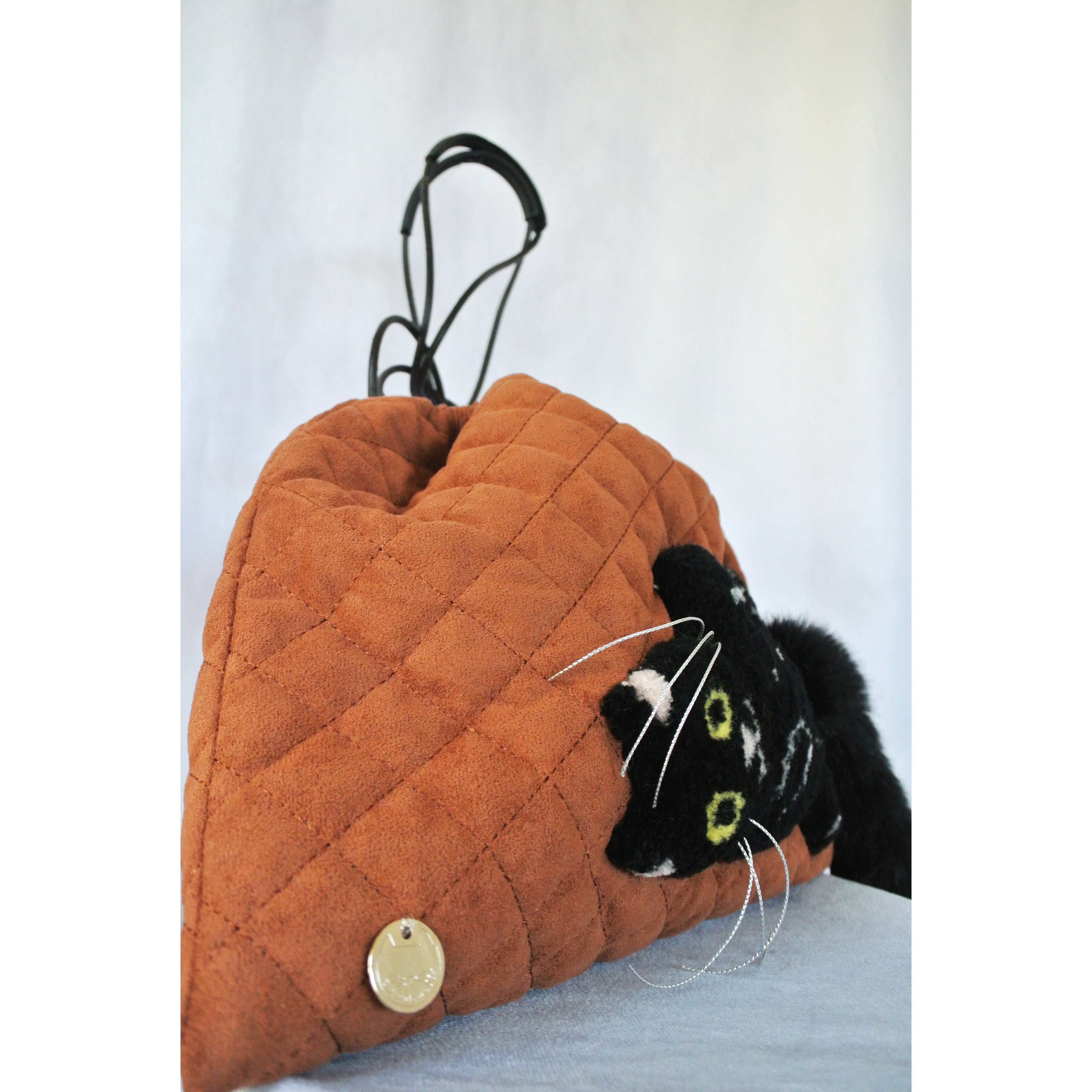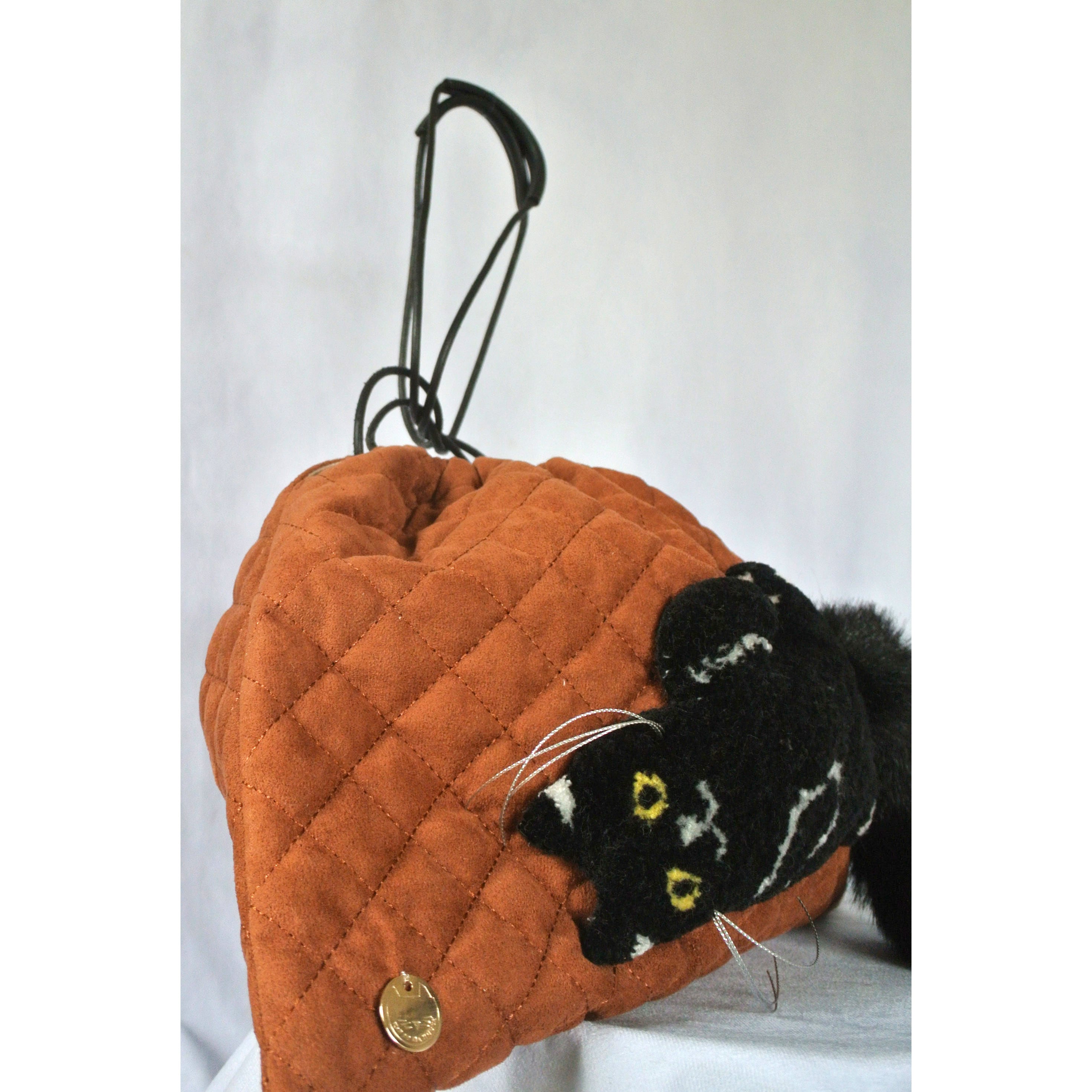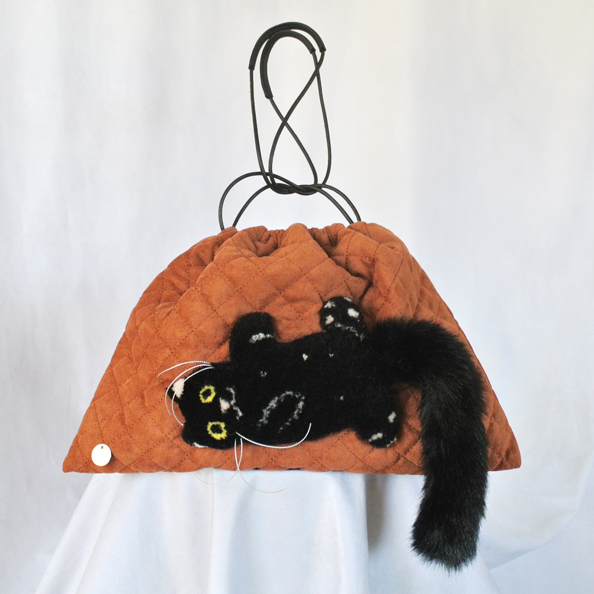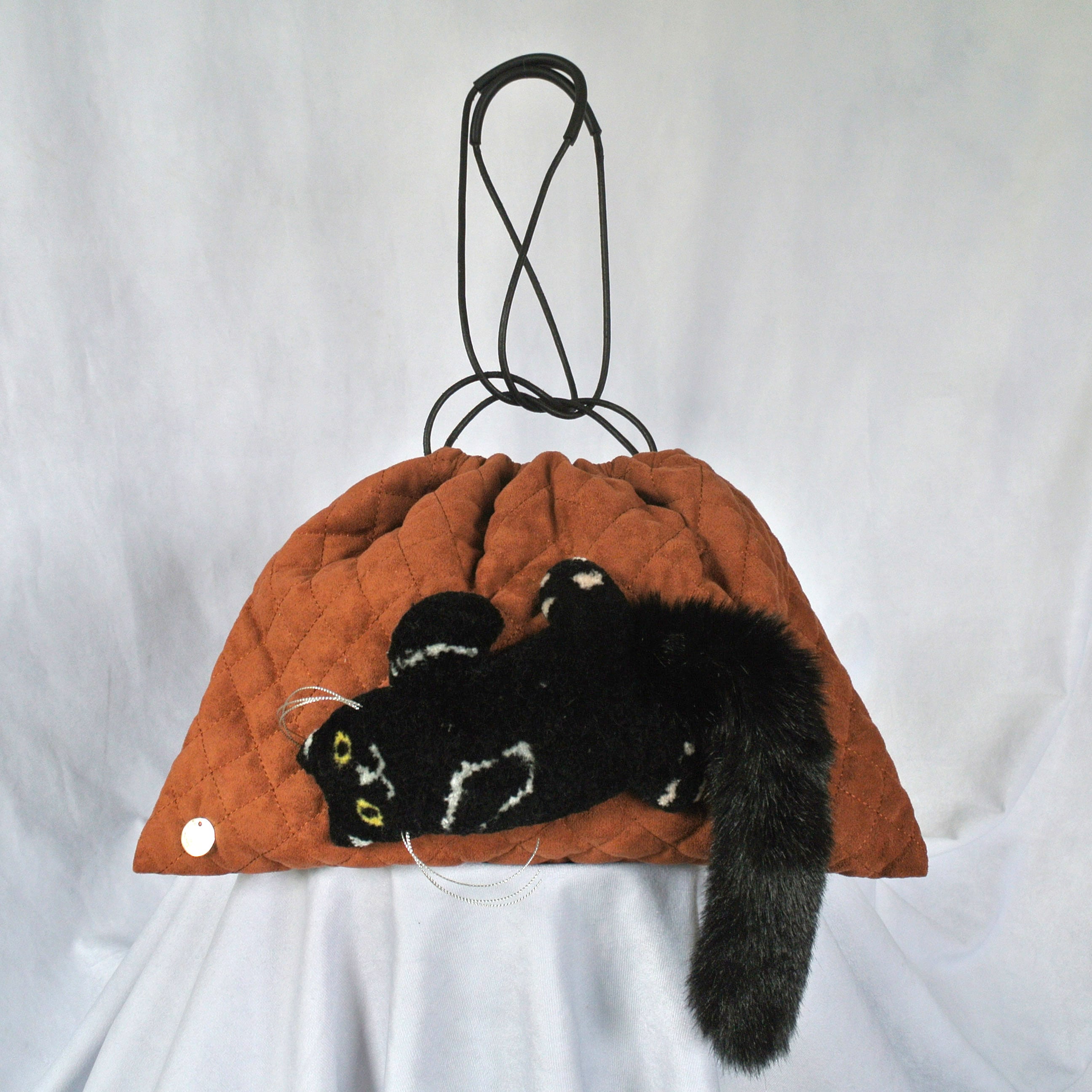 毛糸でモコモコに刺繍した猫ちゃんと、ふわふわなシッポがポイントな巾着バッグです。