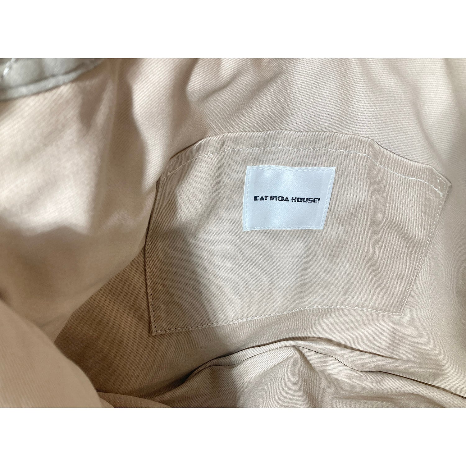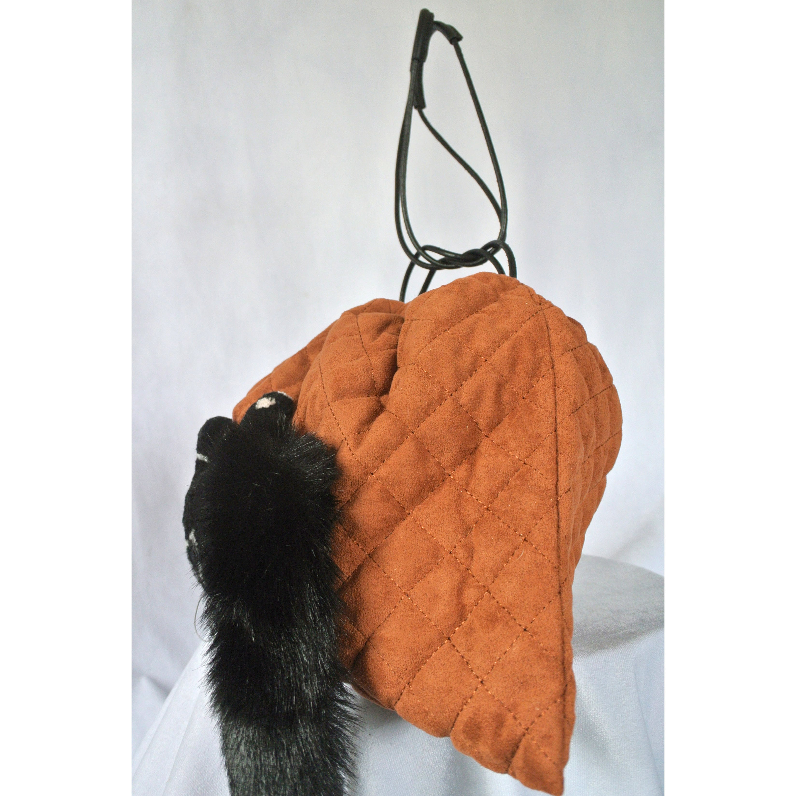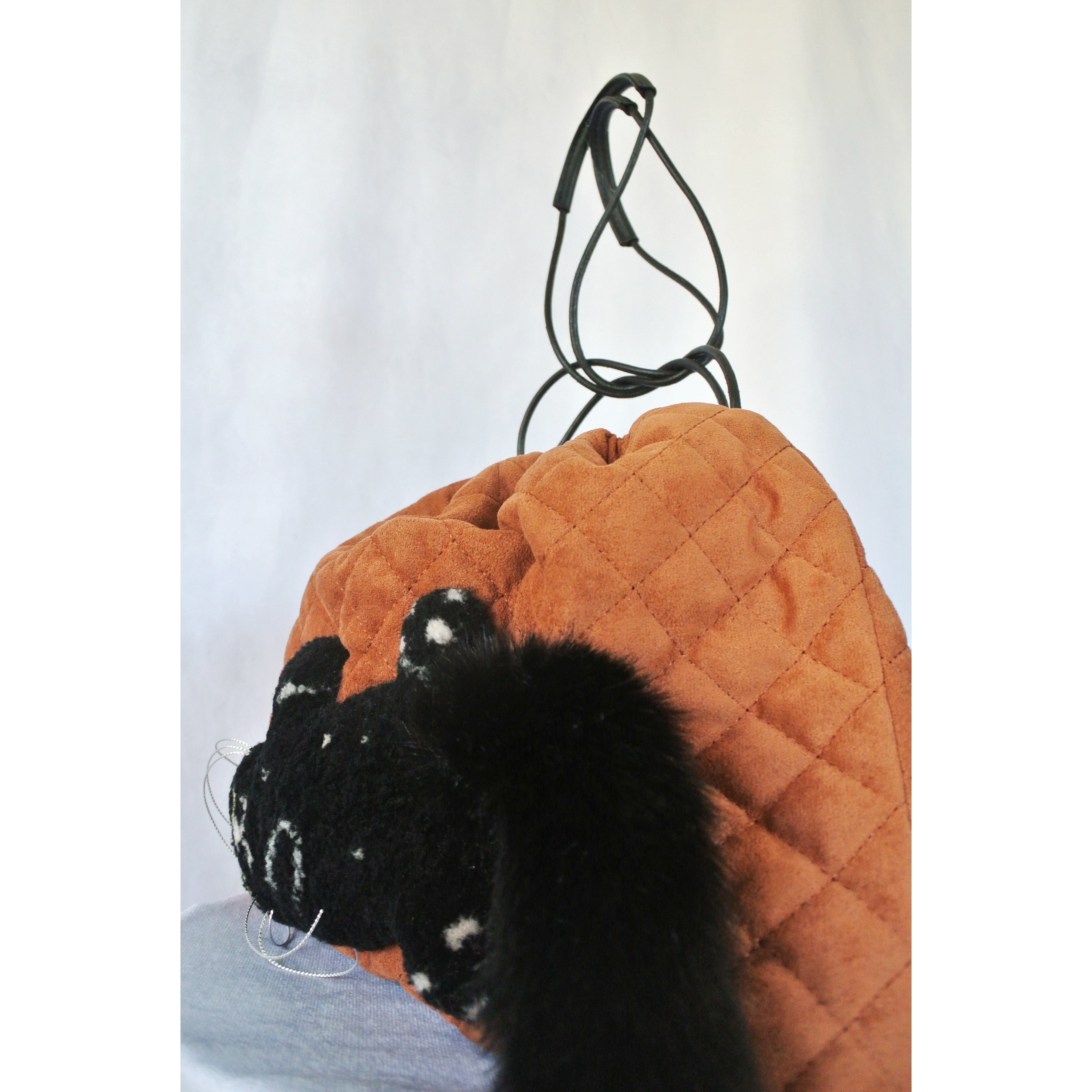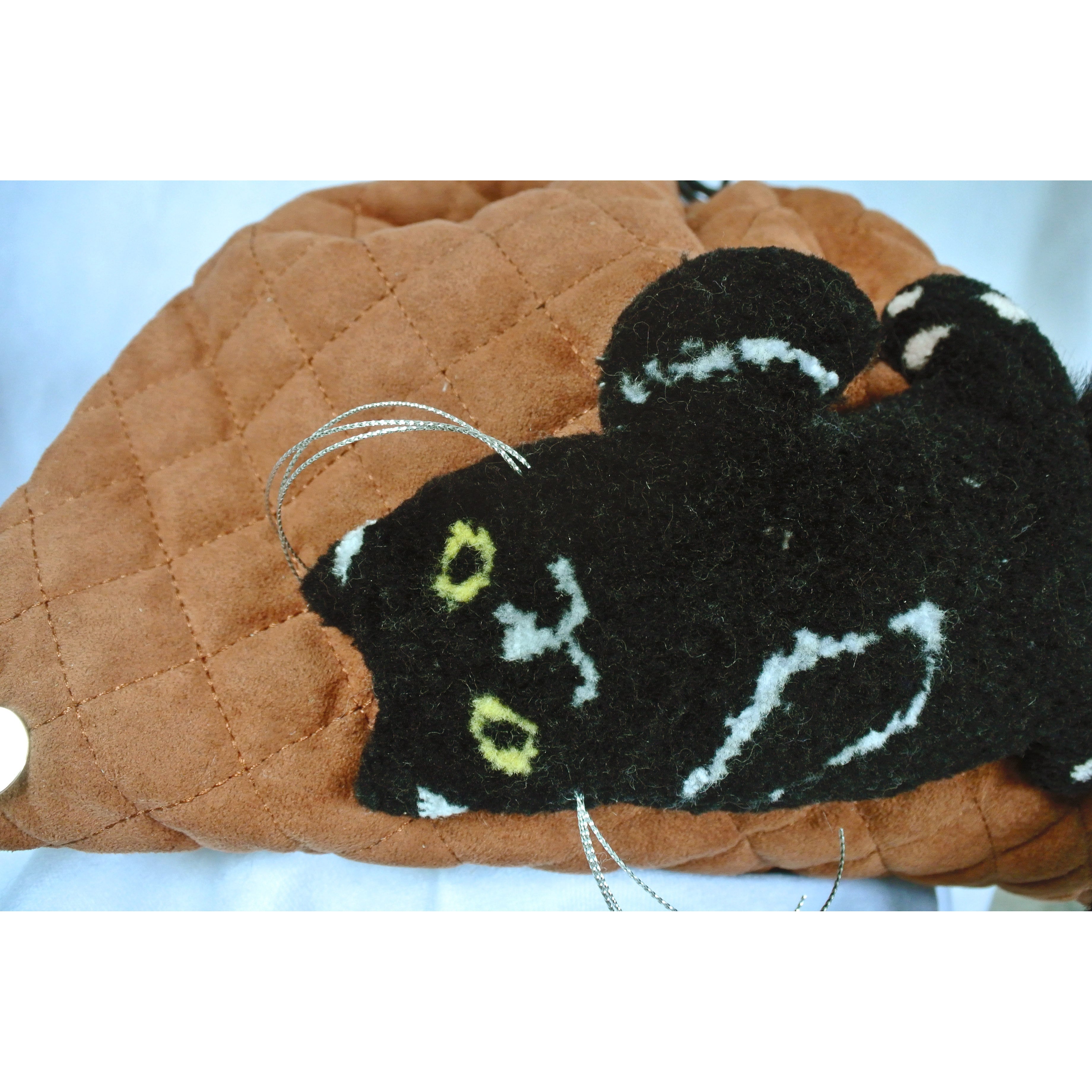 毛糸でモコモコに刺繍した猫ちゃんと、ふわふわなシッポがポイントな巾着バッグです。