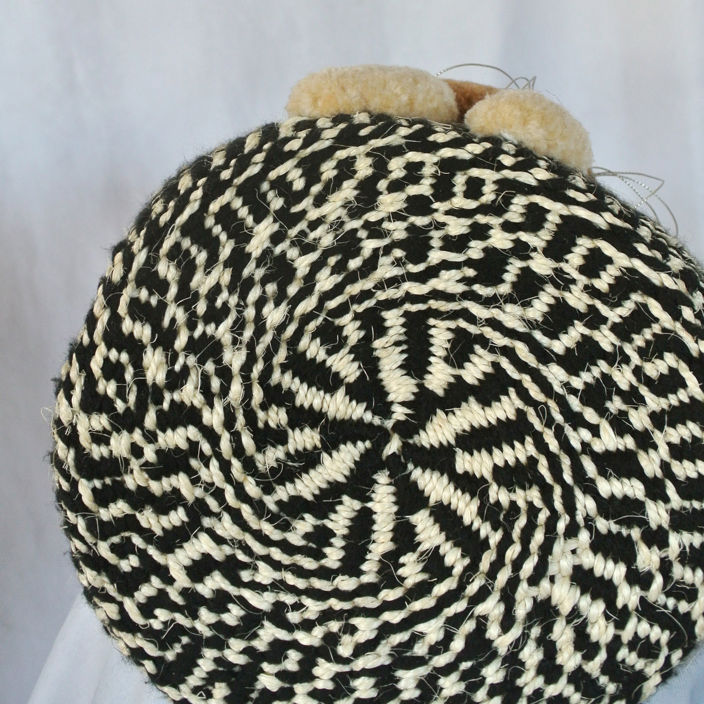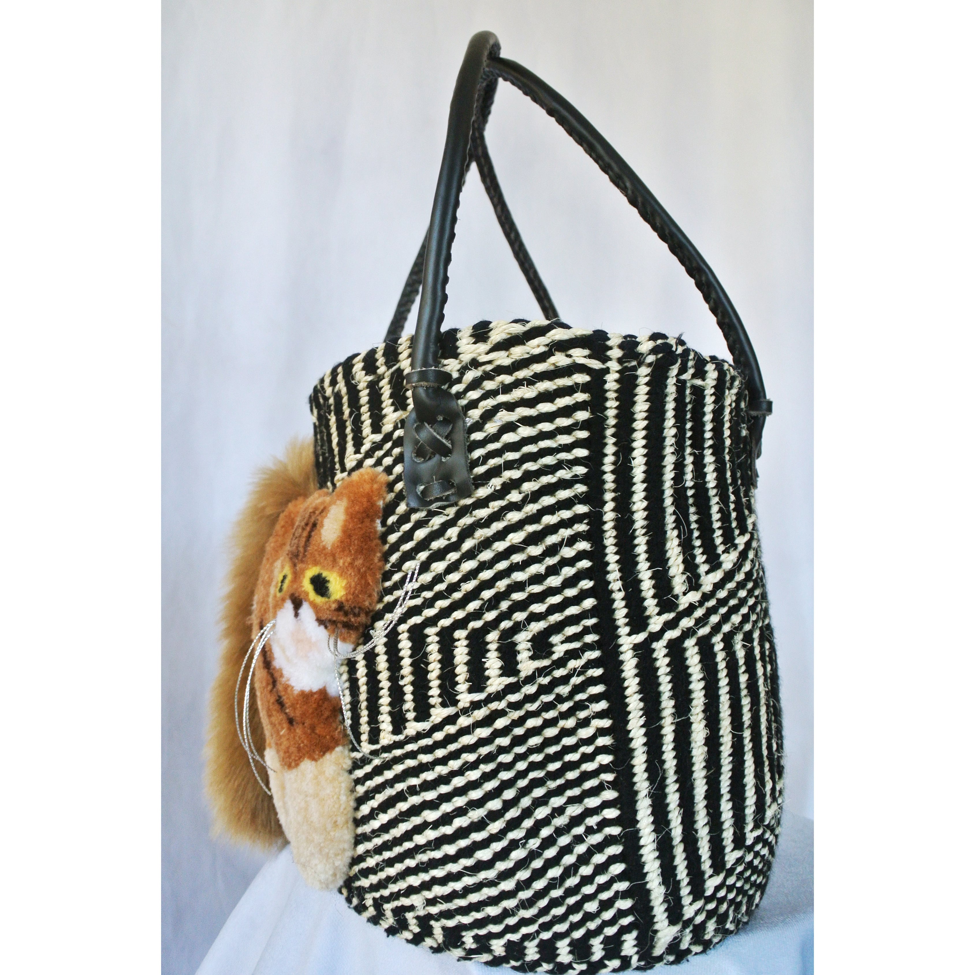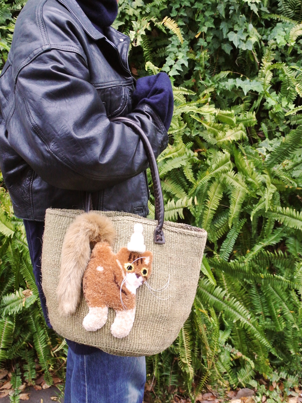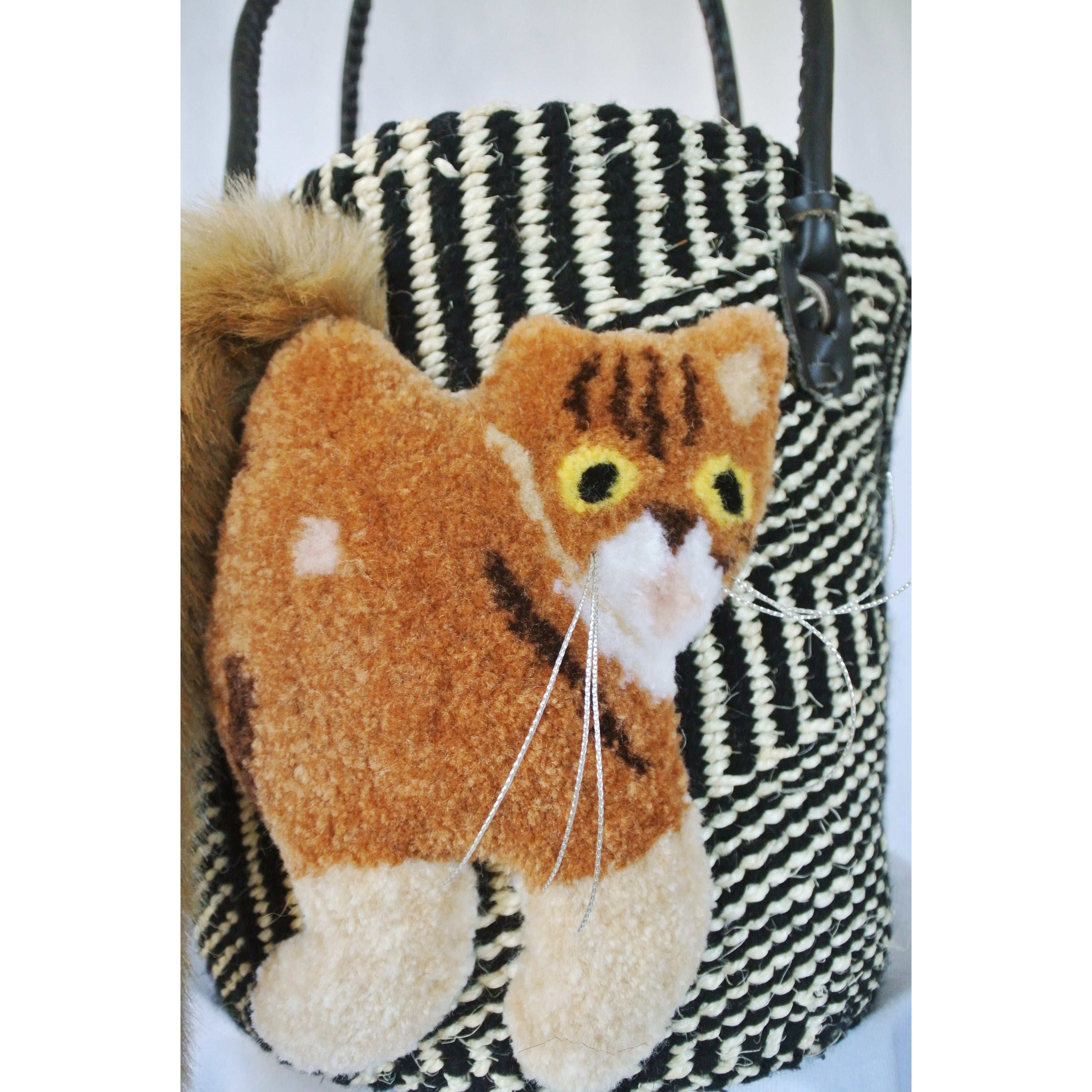 毛糸でモコモコに刺繍した猫ちゃんと、ふわふわロングなシッポがポイントのかごバッグです。
