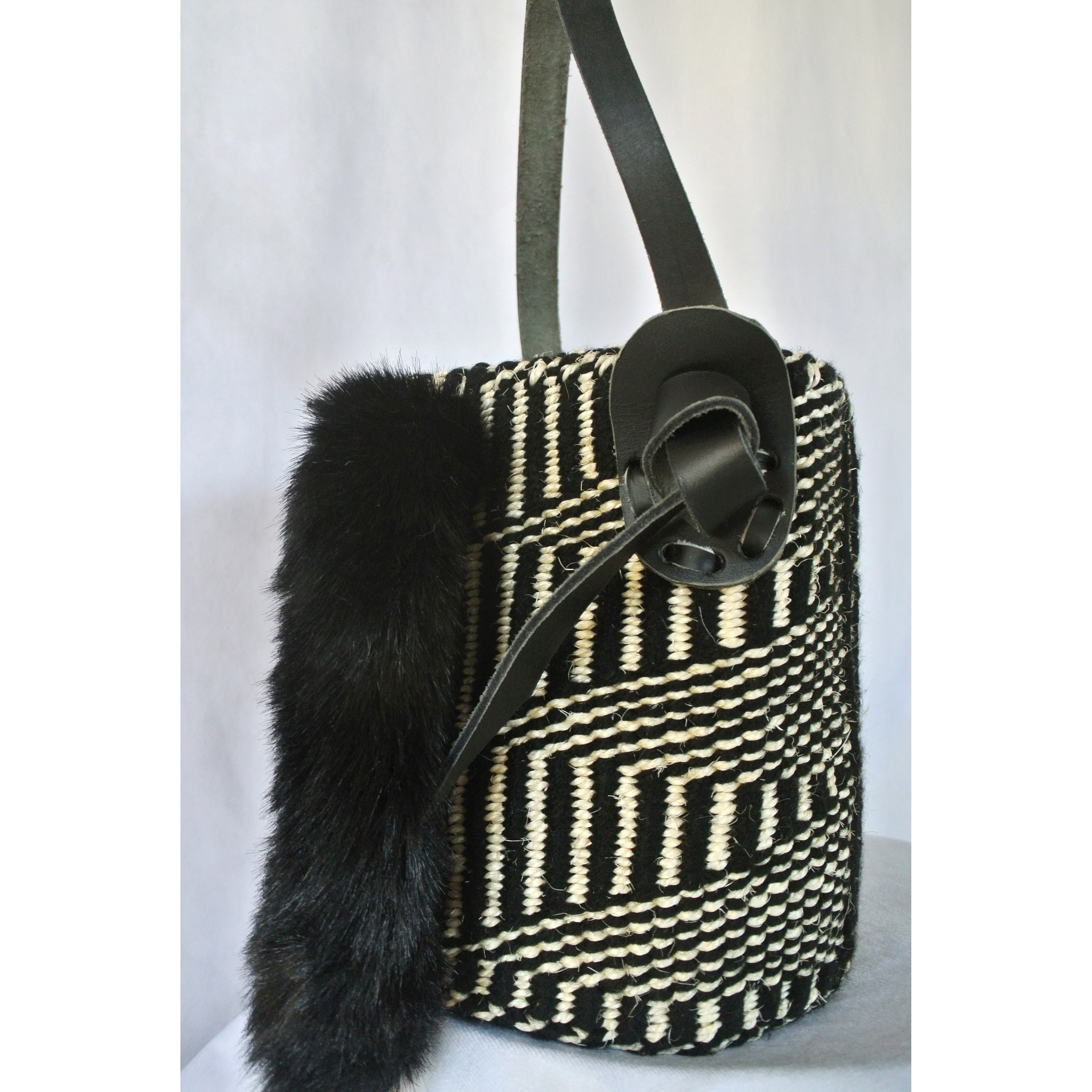 モコモコねこカゴバッグ サイザル×アクリル ショルダーVer. 白黒ブチ