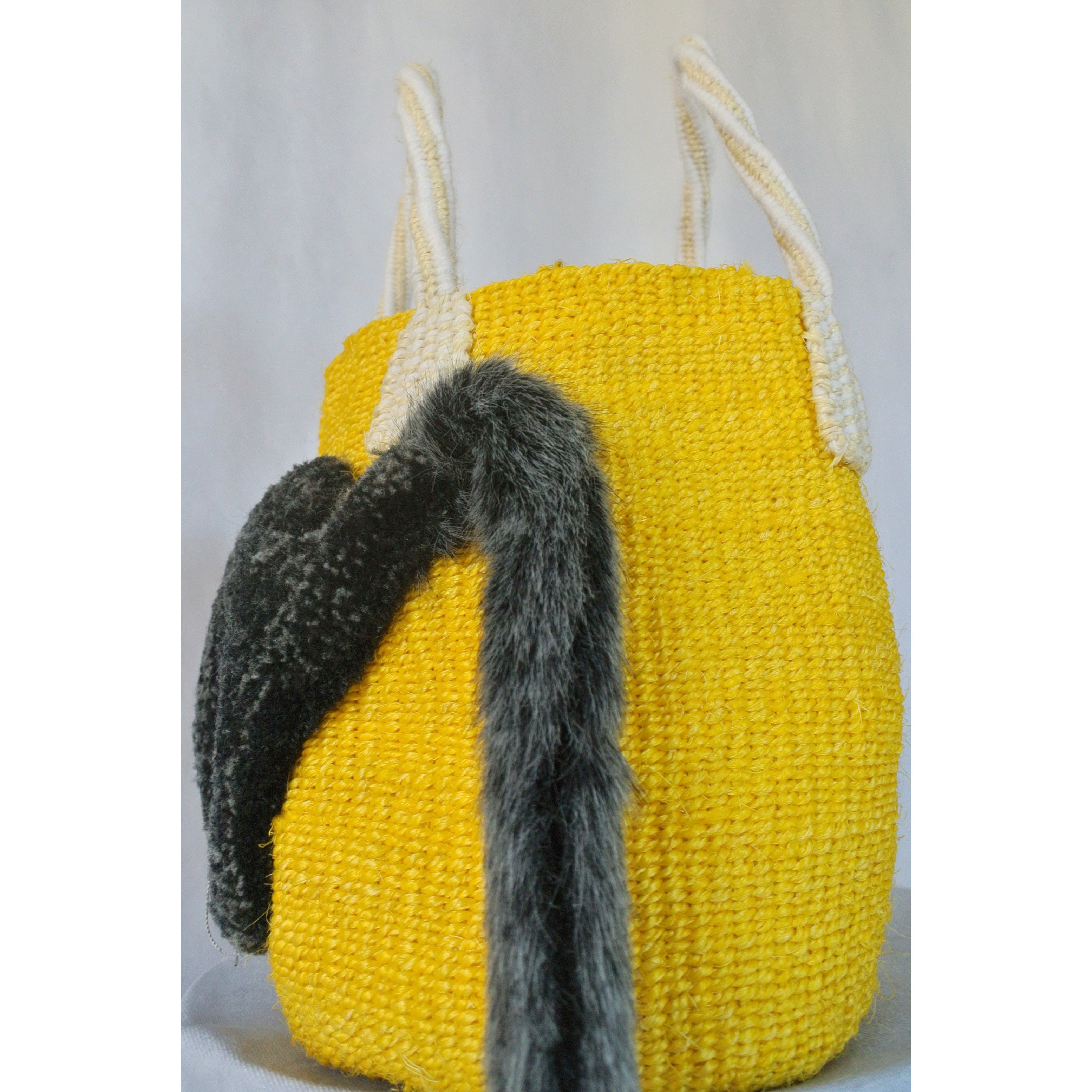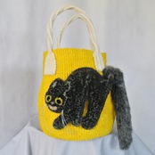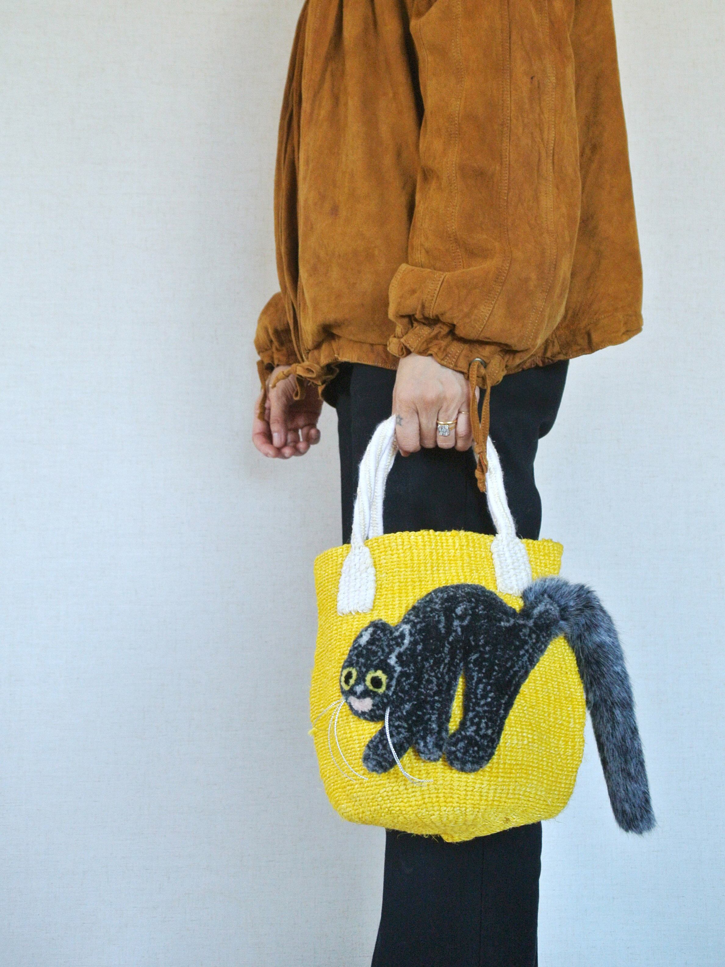 毛糸でモコモコに刺繍した猫ちゃんと、ふわふわロングなシッポがポイントのかごバッグです。