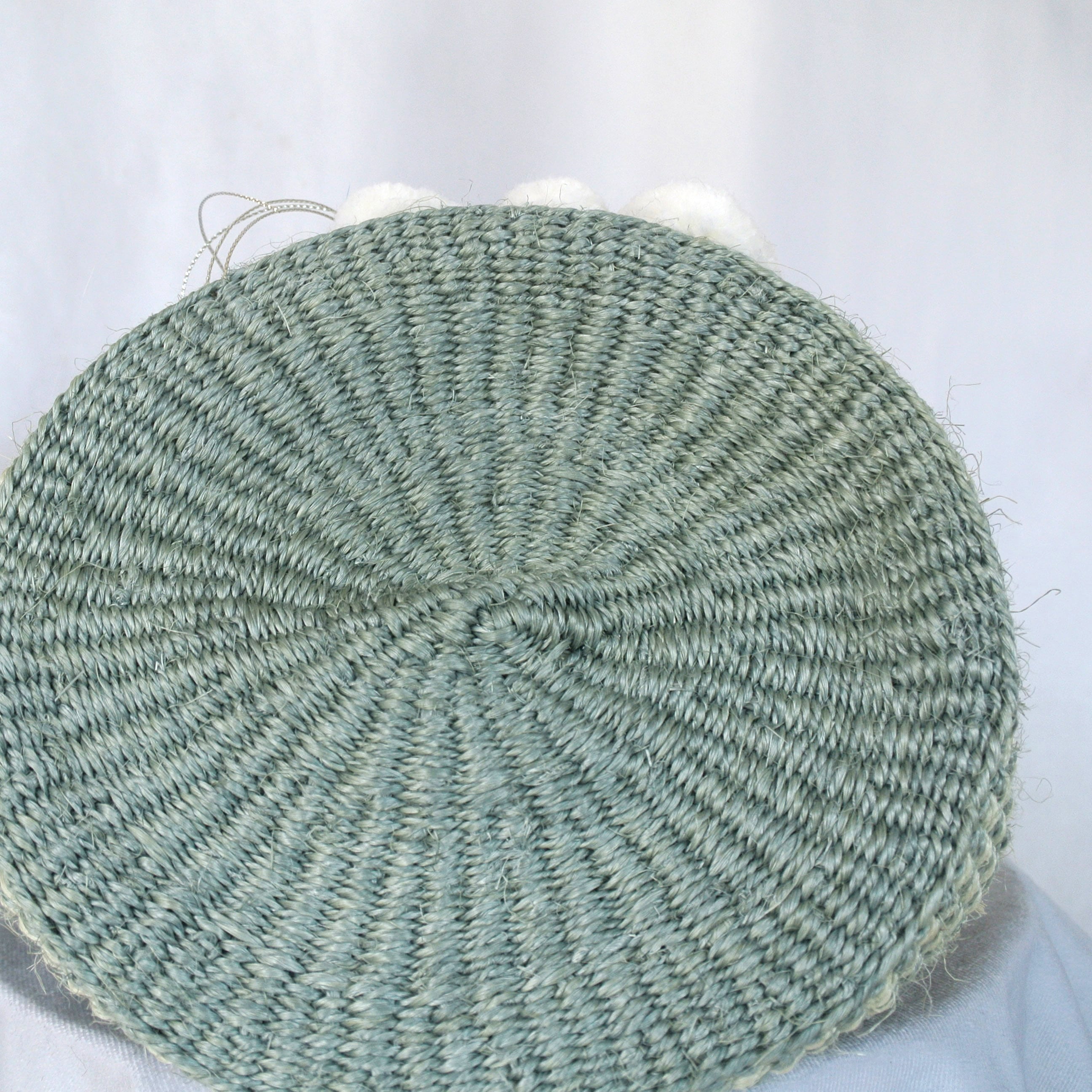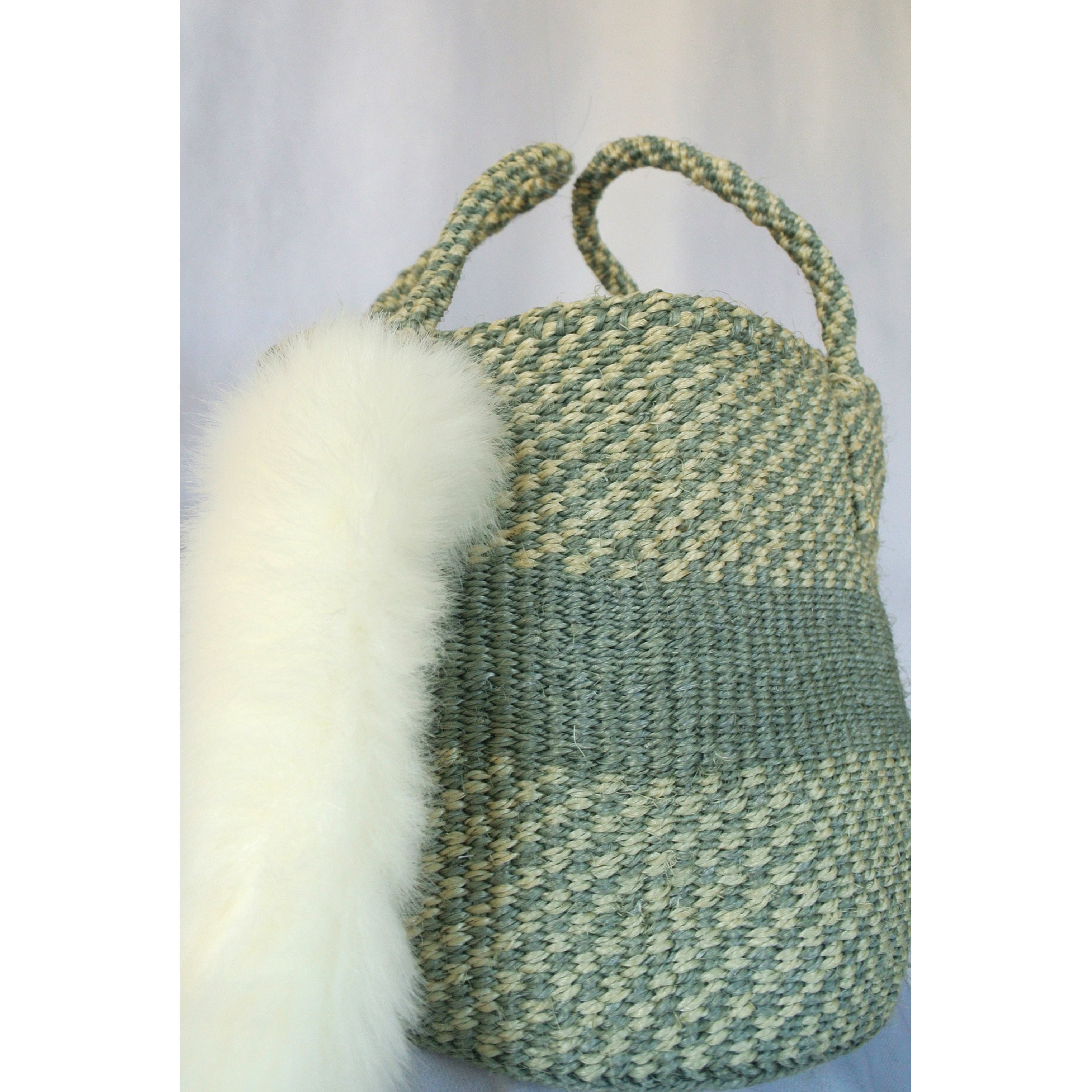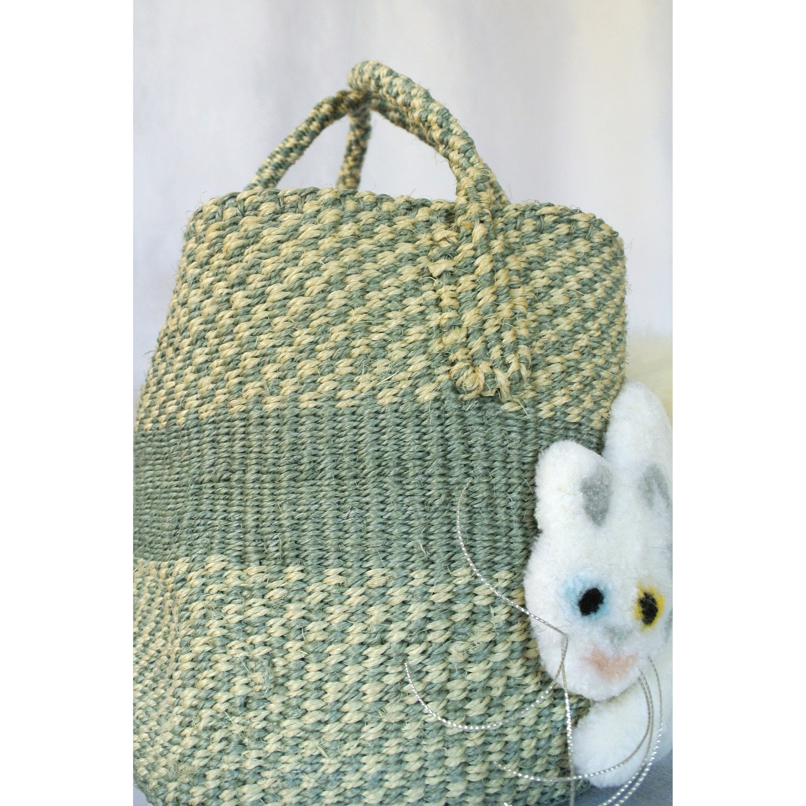 ブルーグレーとベージュのサイザル麻で編まれたバッグにオッドアイの白猫ちゃんがオンしています。