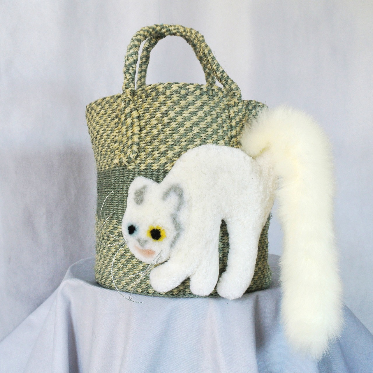 毛糸でモコモコに刺繍した猫ちゃんと、ふわふわロングなシッポがポイントのかごバッグです。小さめで持ちやすいサイズのカゴバッグです。