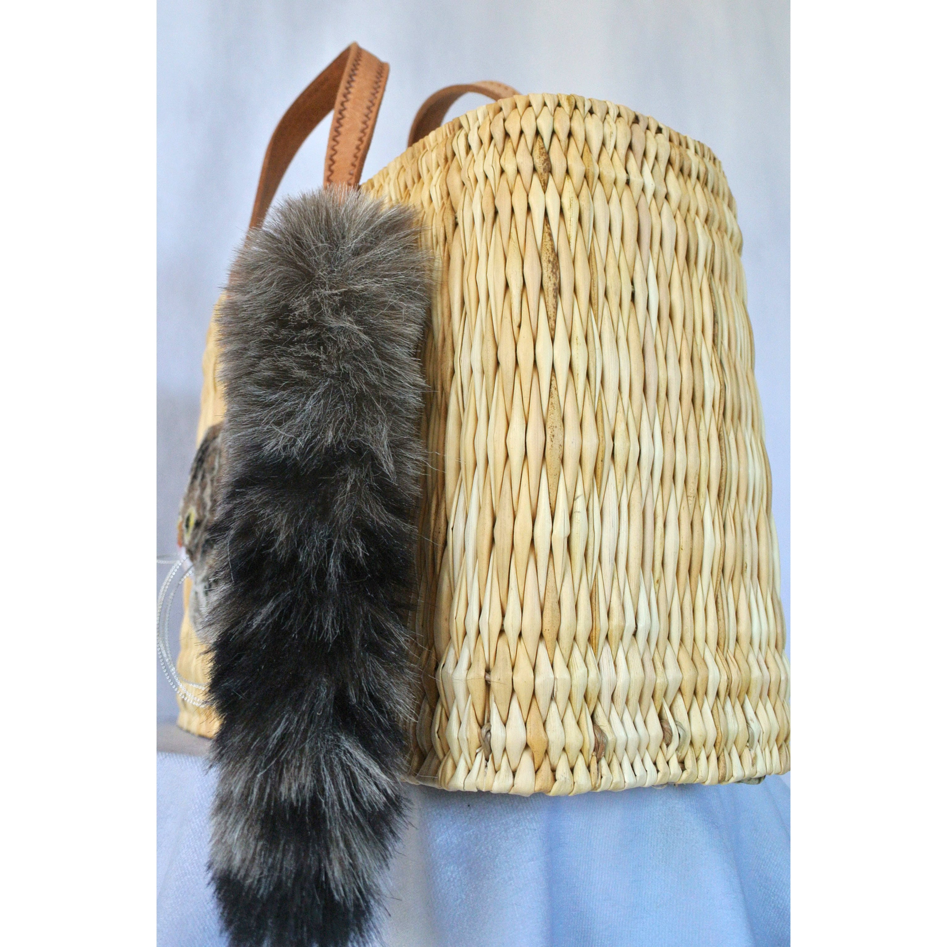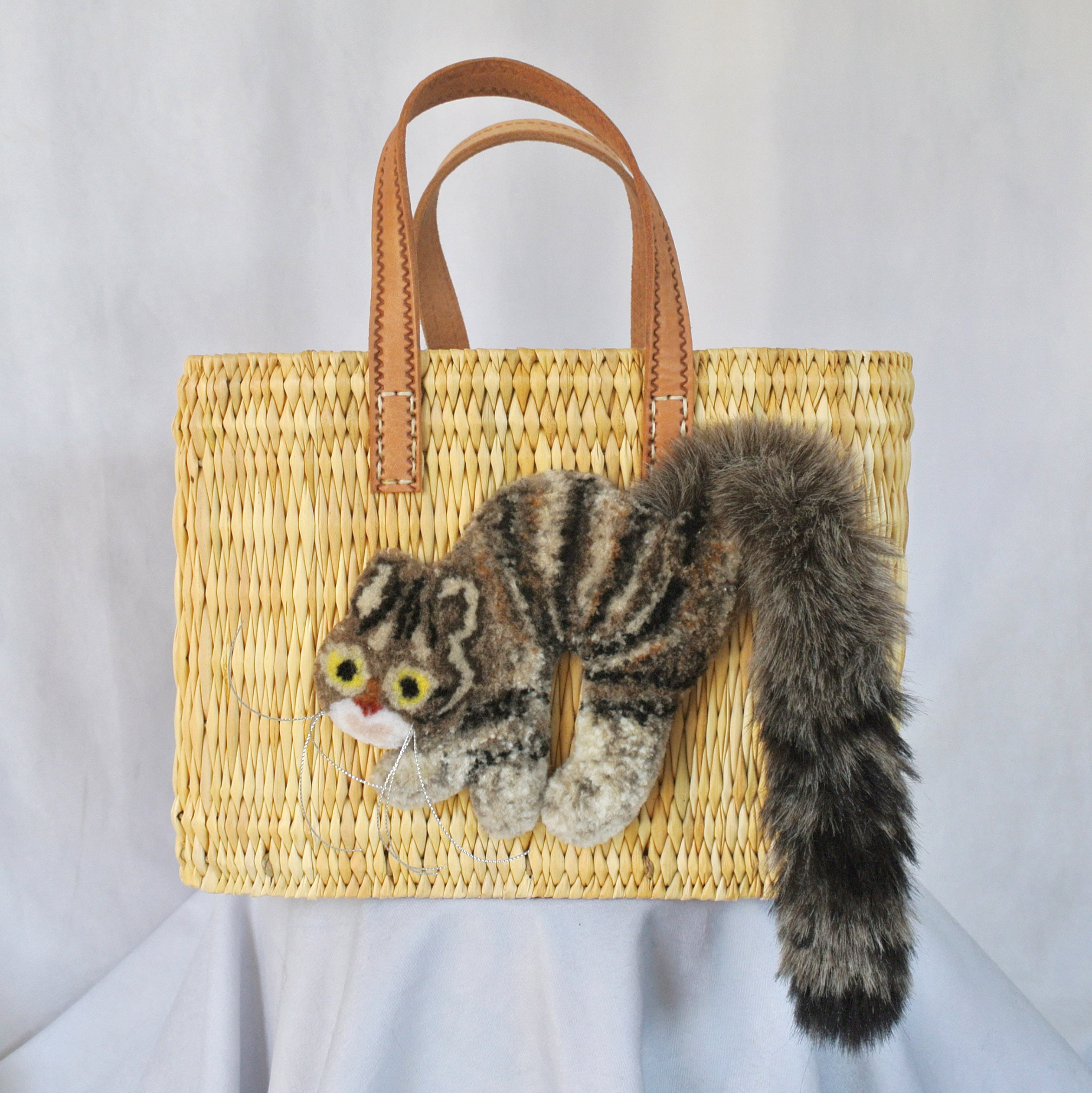 エレファントグラス(イネ科の水草)を編み上げた本体はしっかりと編まれており、自立します。毛糸でモコモコに刺繍した猫ちゃんと、ふわふわロングなシッポがポイントのかごバッグです。