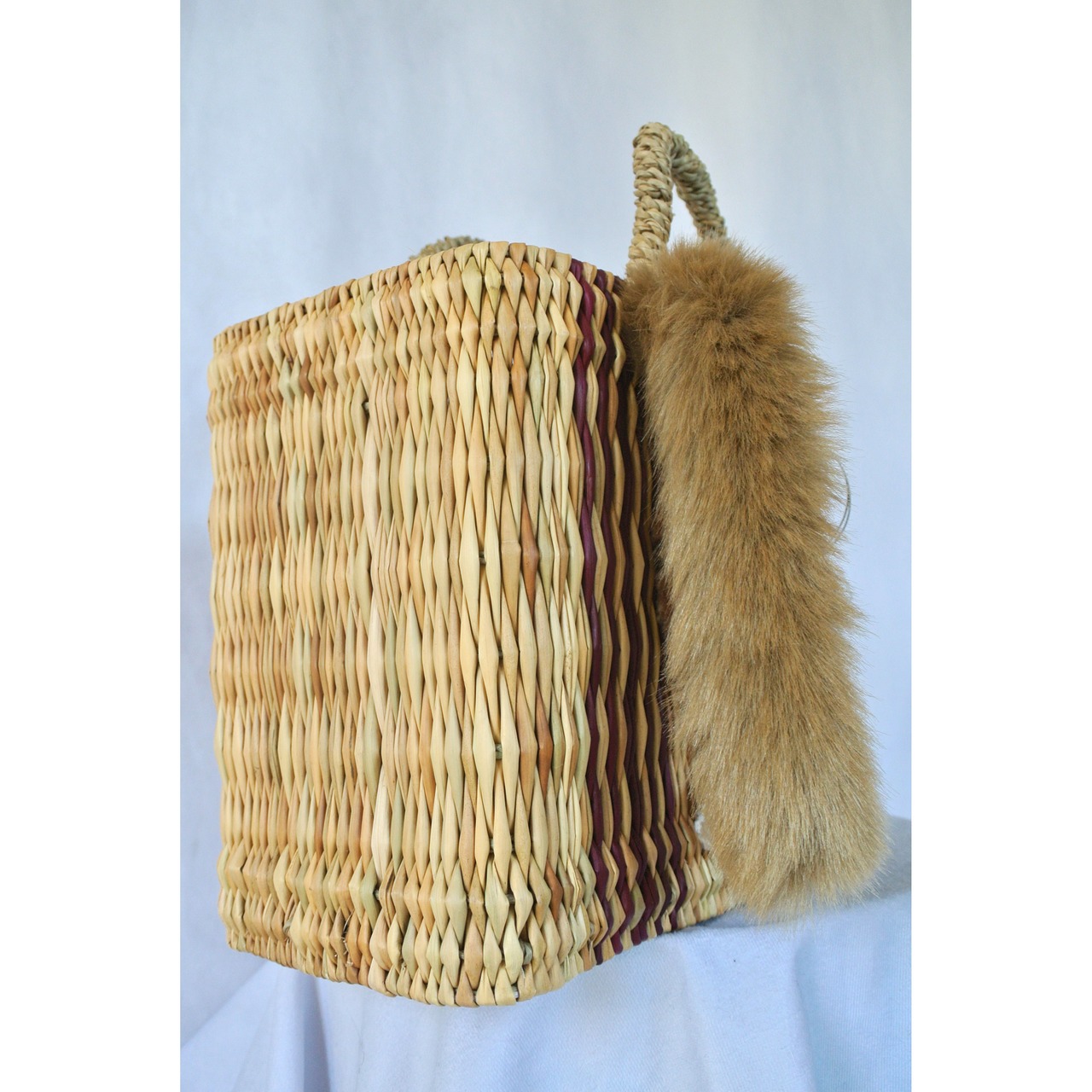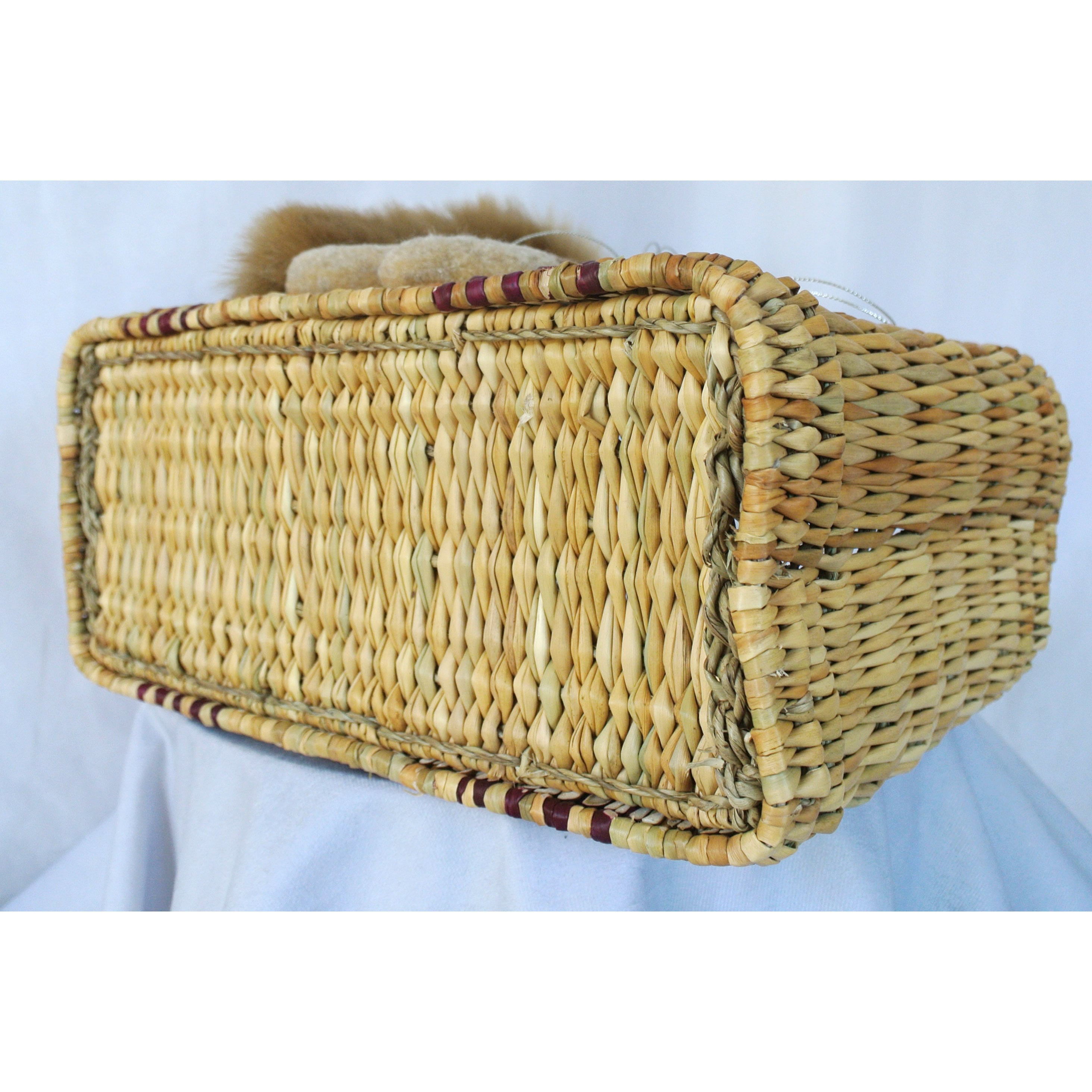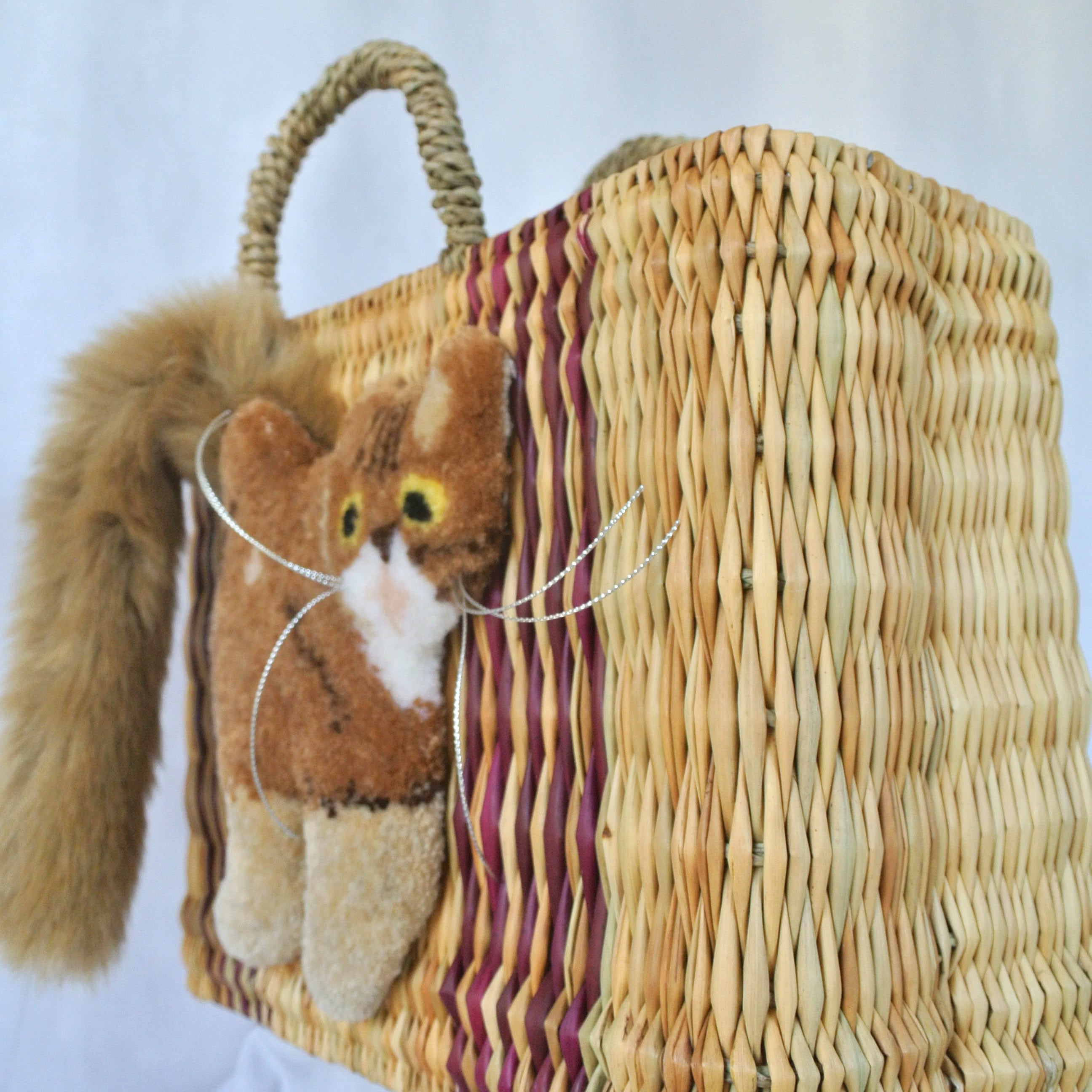 エレファントグラス(イネ科の水草)を編み上げた本体はしっかりと編まれており、自立します。毛糸でモコモコに刺繍した猫ちゃんと、ふわふわロングなシッポがポイントのかごバッグです。