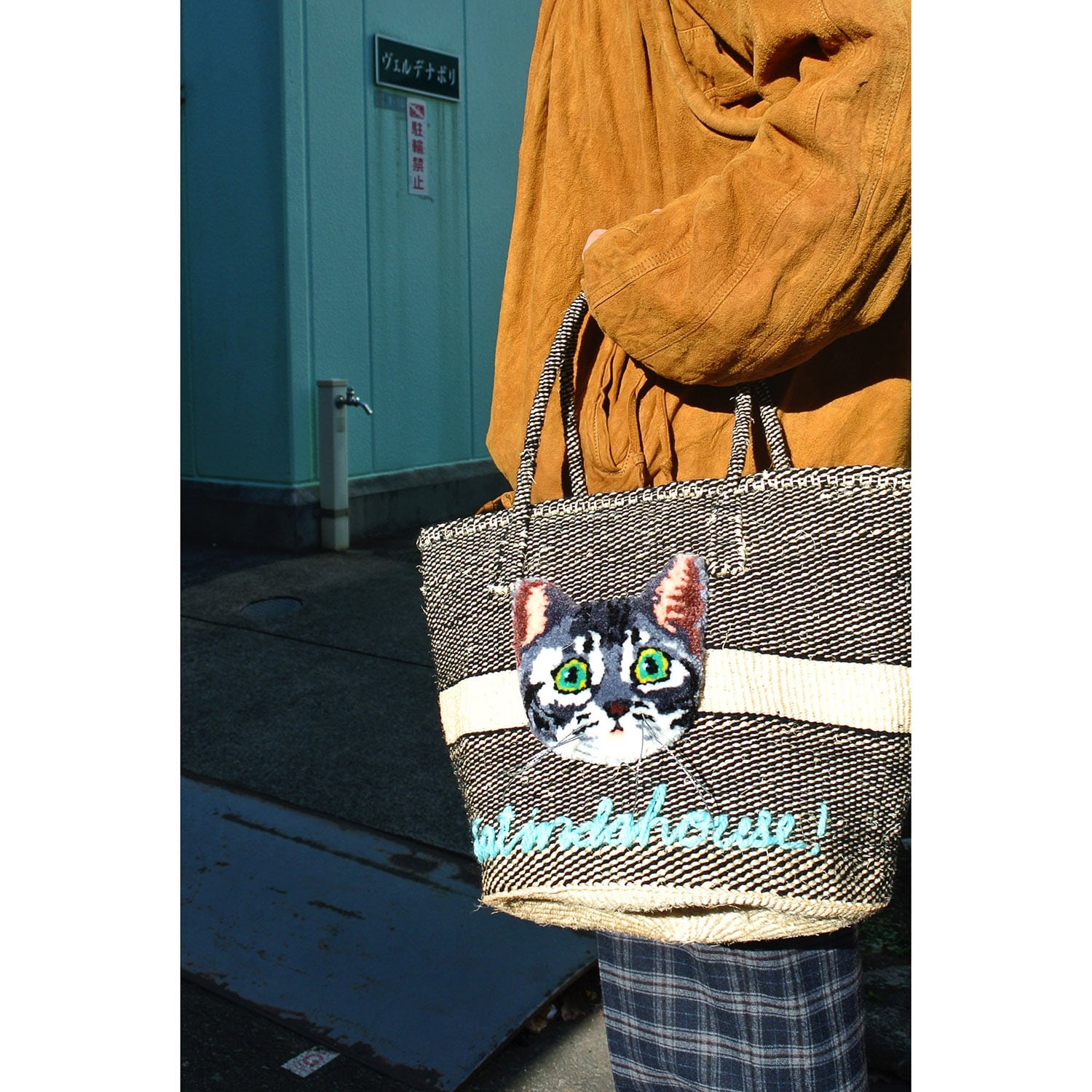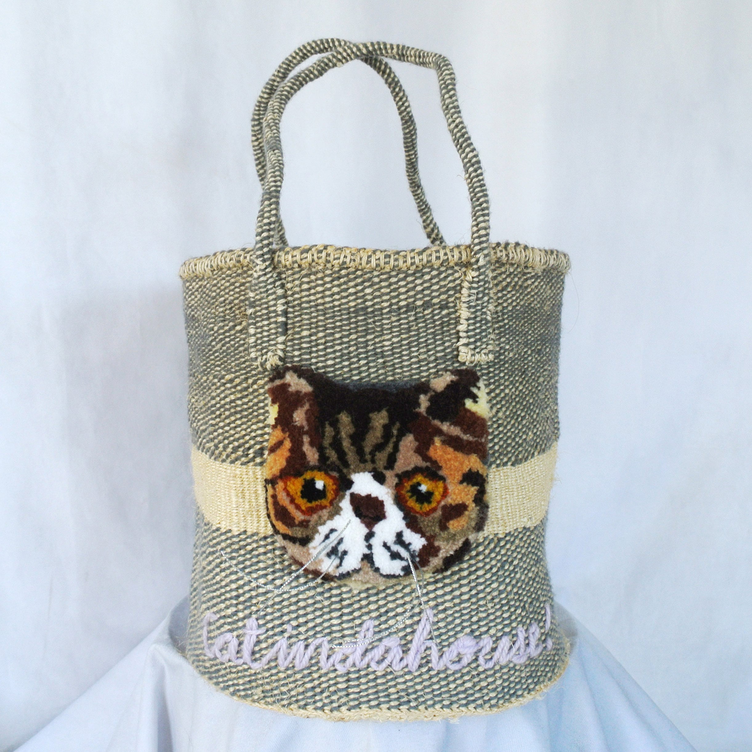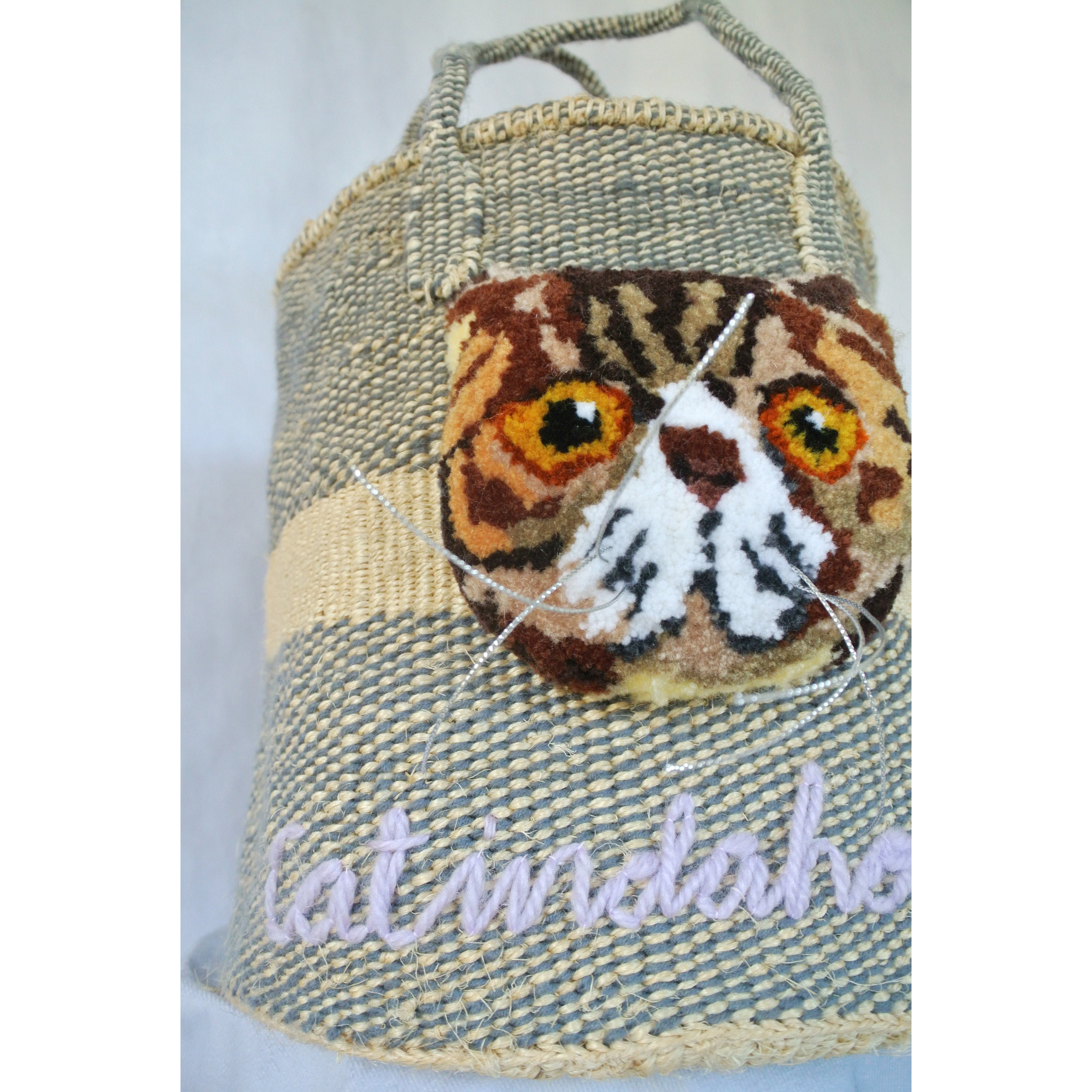 素朴な風合いのサイザルかごに、毛糸でモコモコに刺繍したcat faceを縫い付けました。