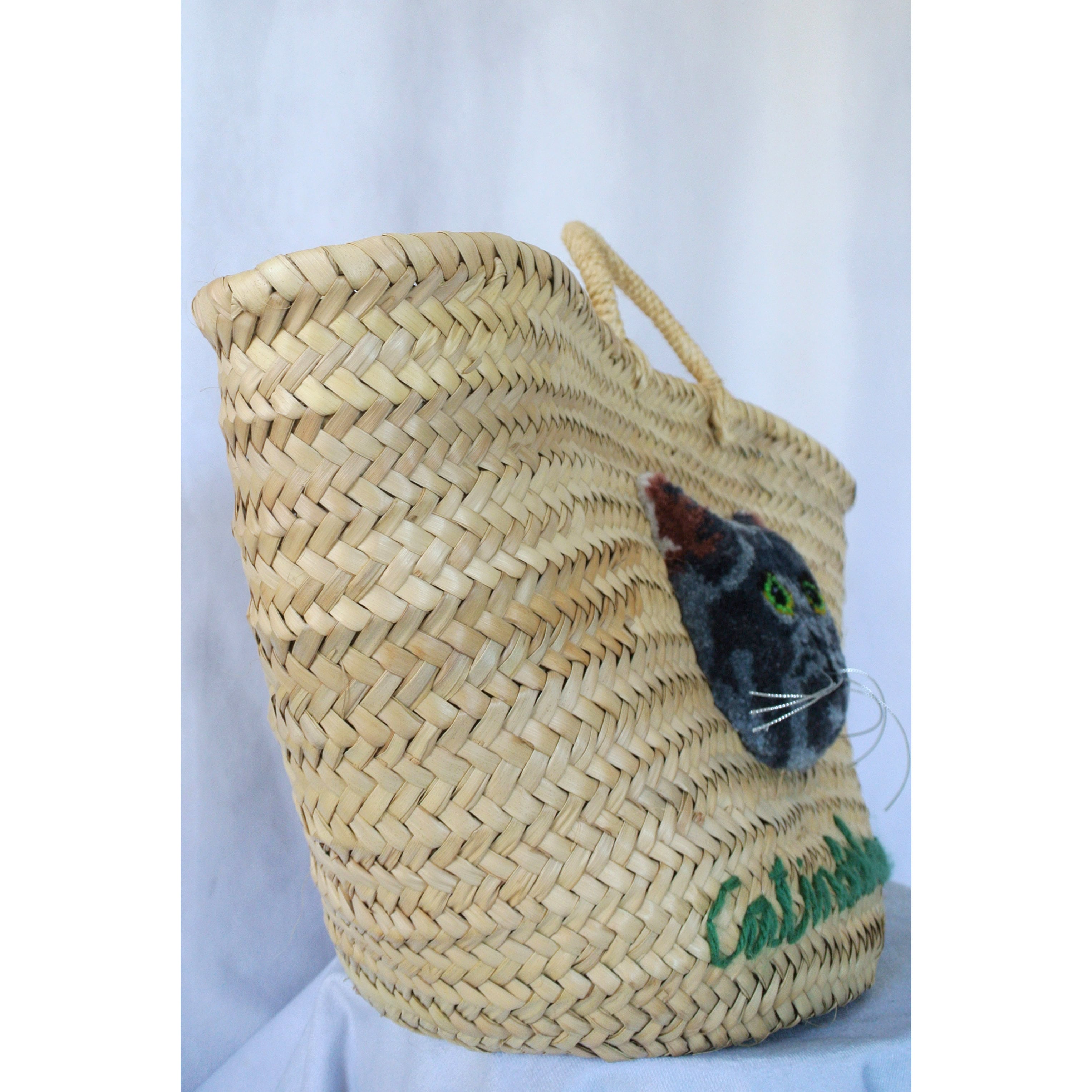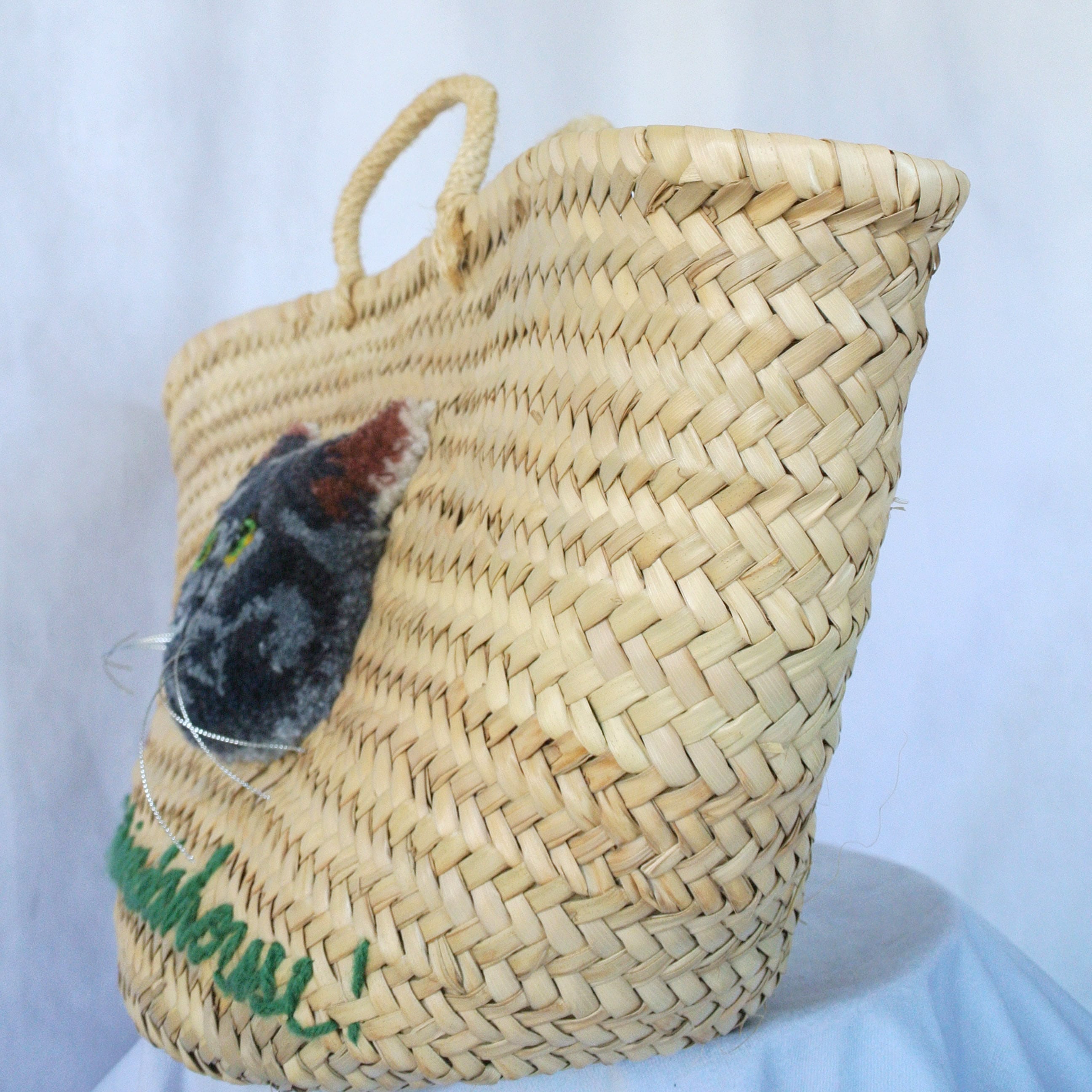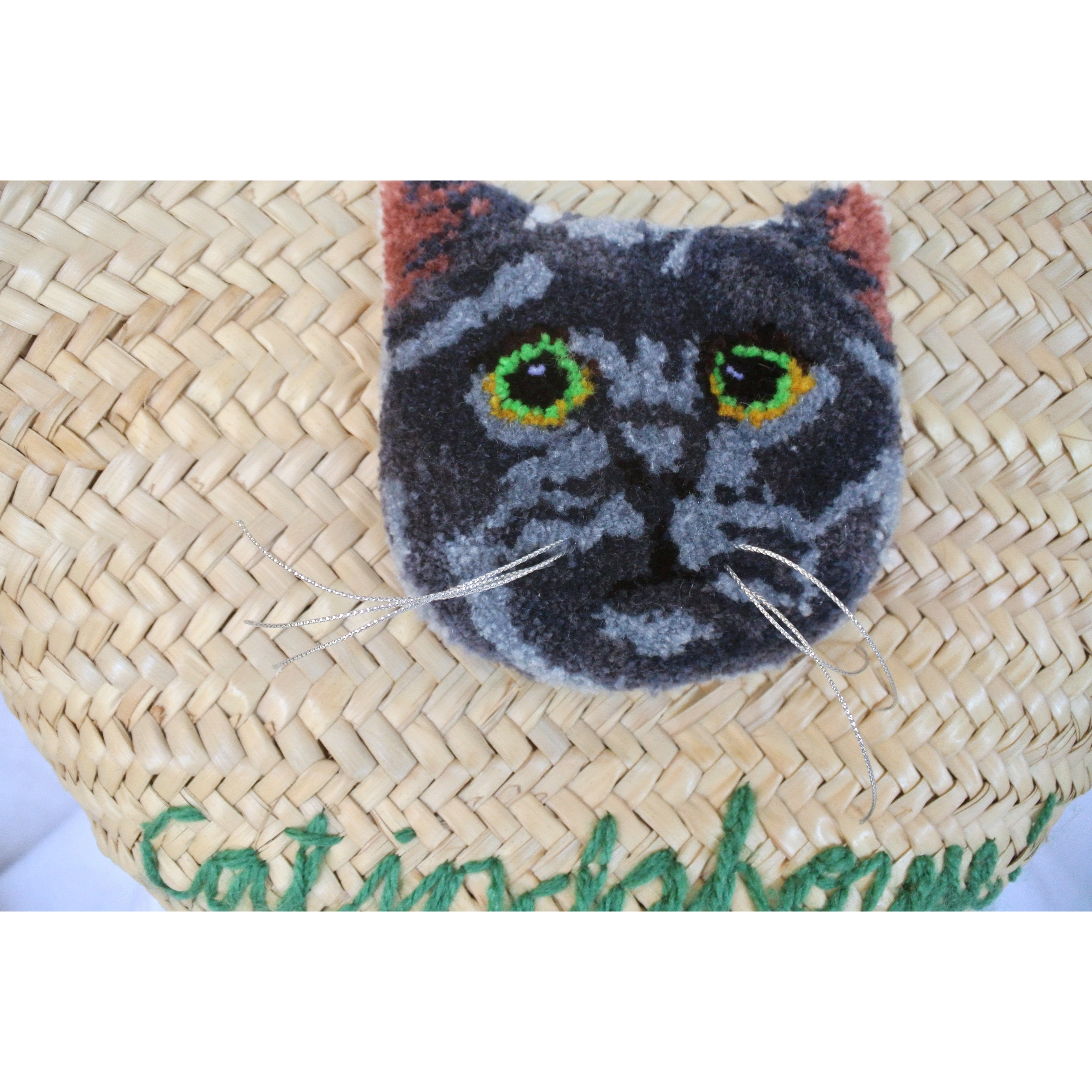素朴な風合いのモロッコ製のマルシェかごに、毛糸でモコモコに刺繍したネコを縫い付けました。