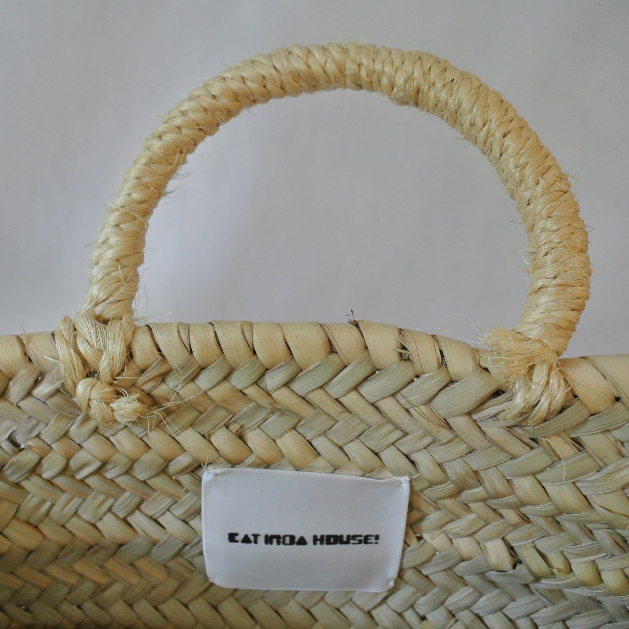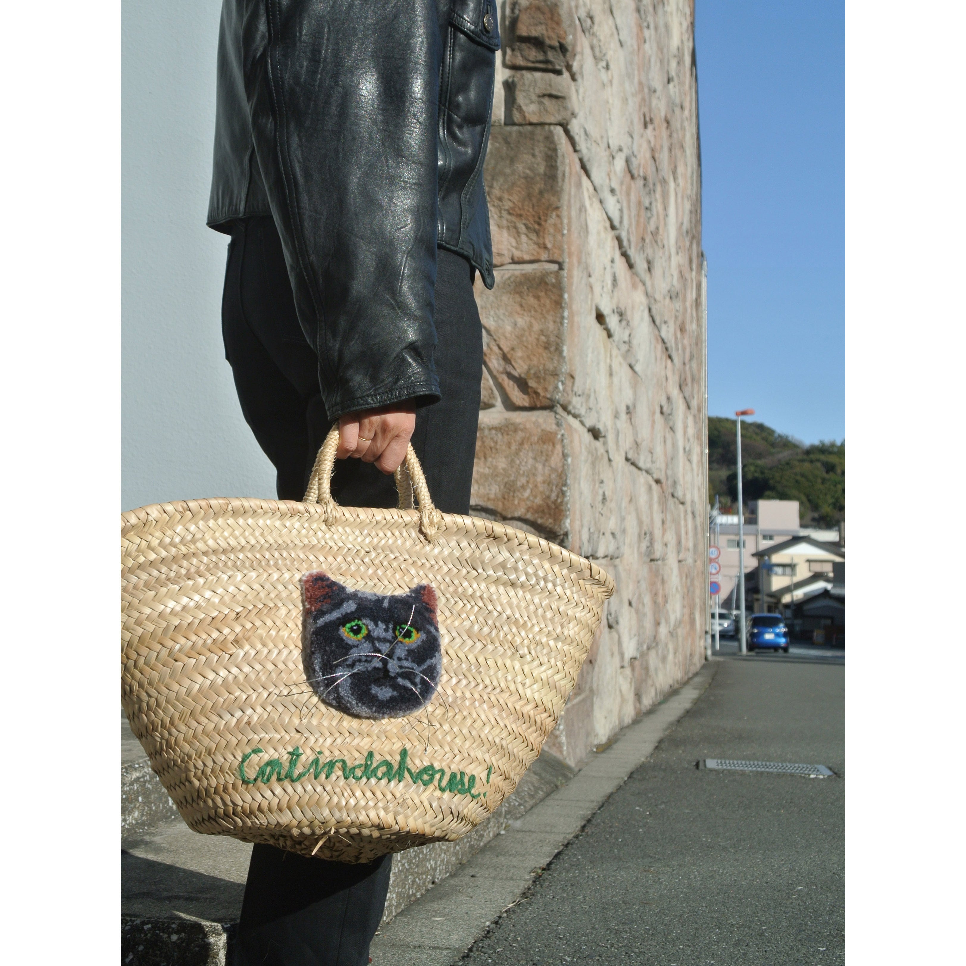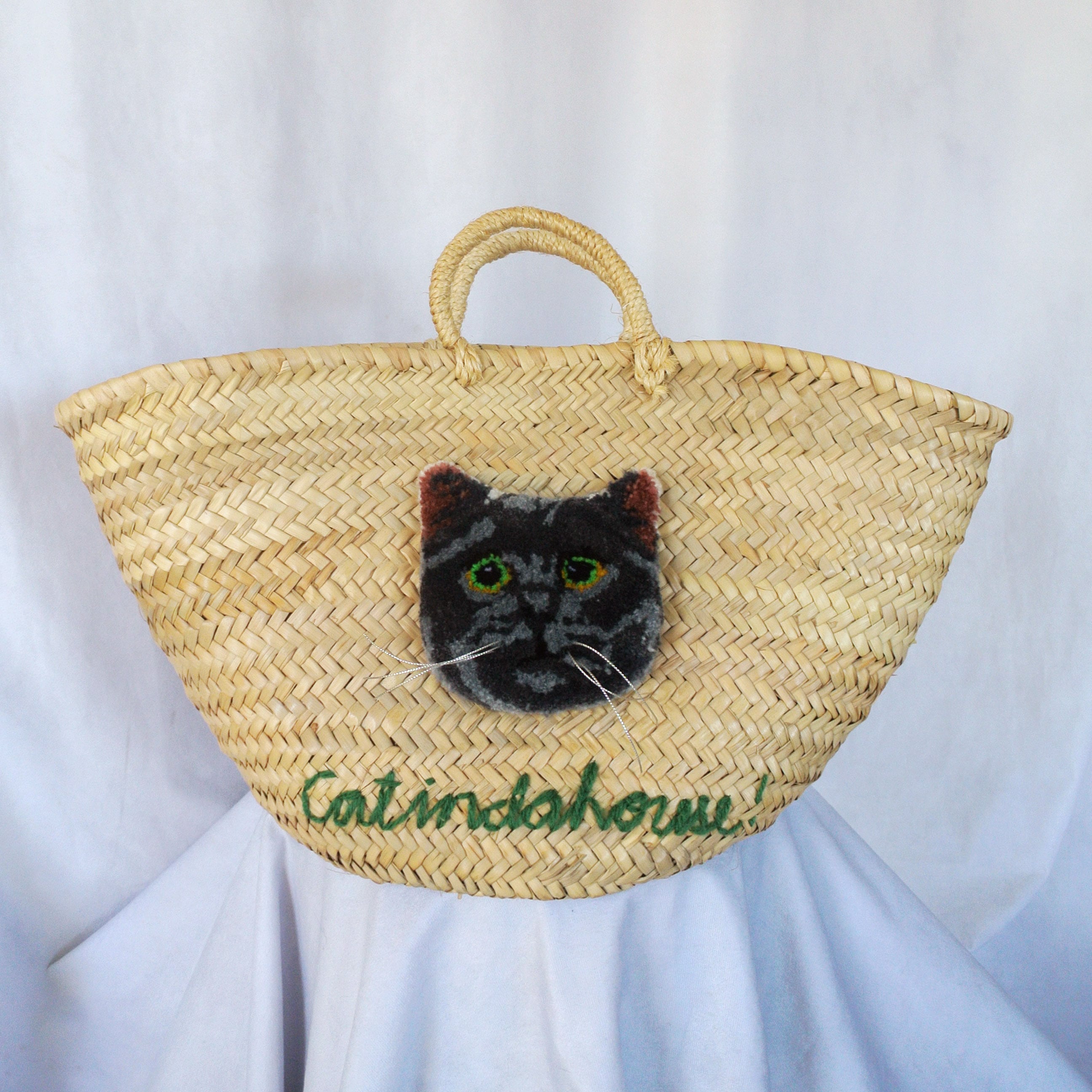 素朴な風合いのモロッコ製のマルシェかごに、毛糸でモコモコに刺繍したネコを縫い付けました。