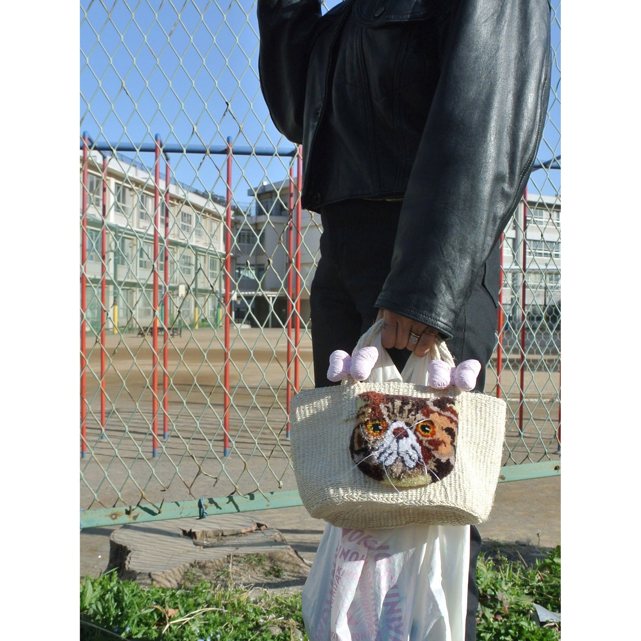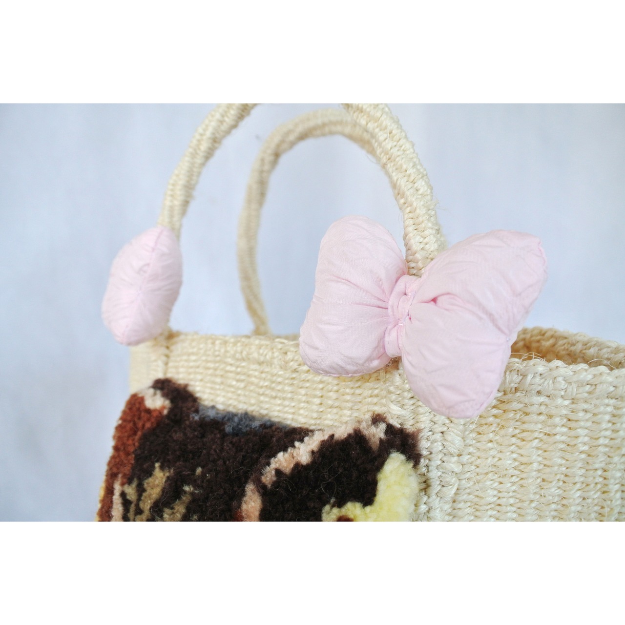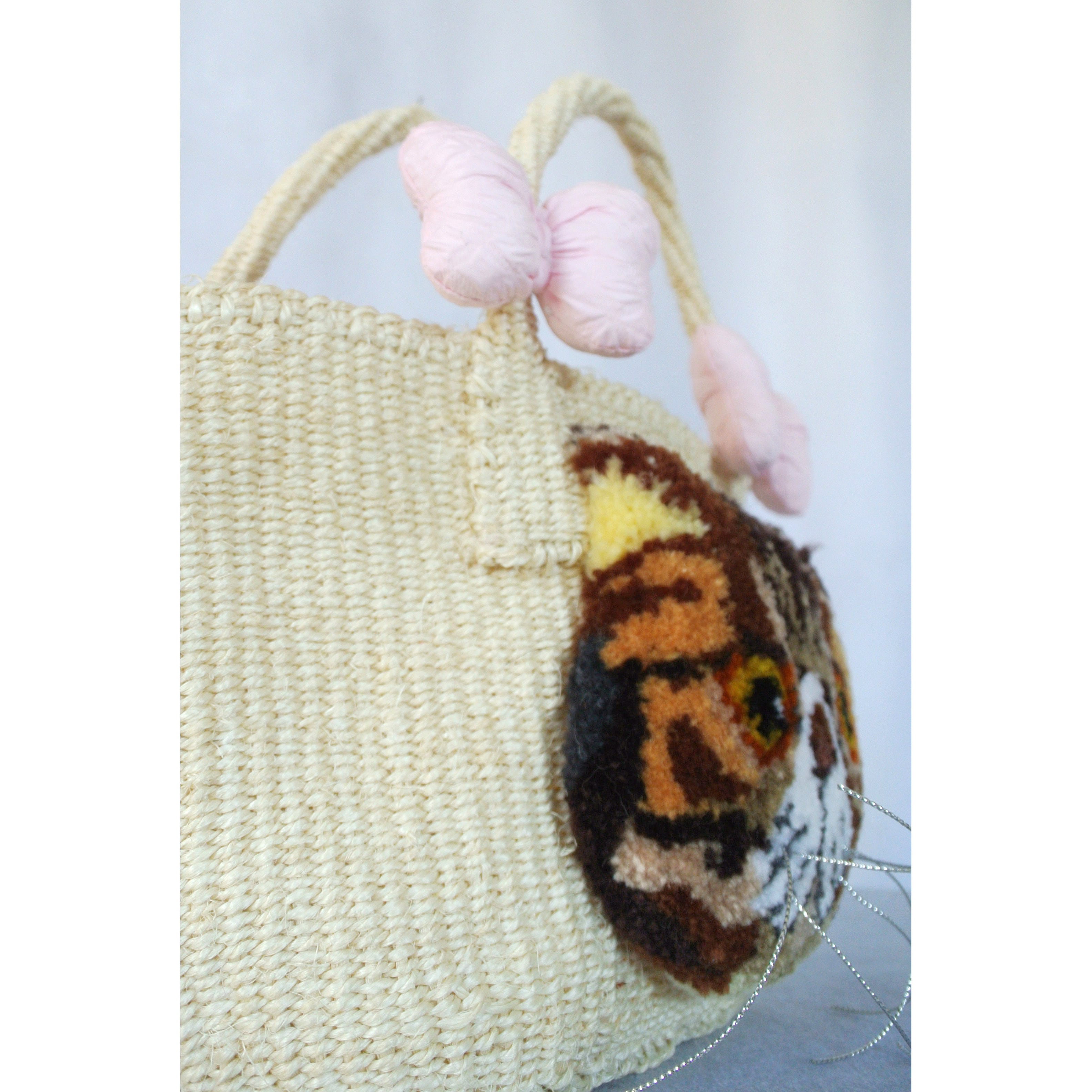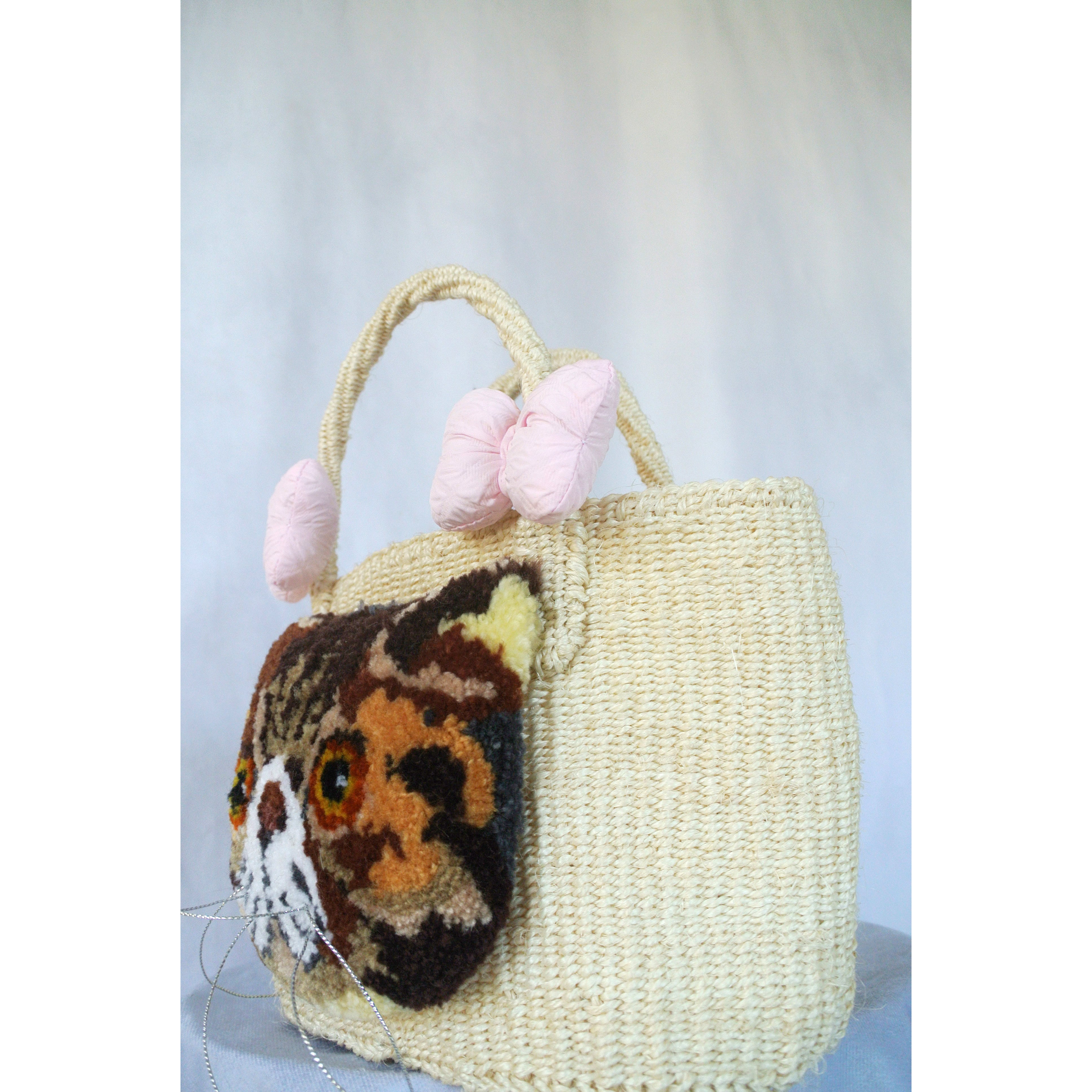 ミニサイズのプリミティブなサイザルかごに、毛糸でモコモコに刺繍したネコとプクプクリボンを縫い付けました。