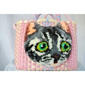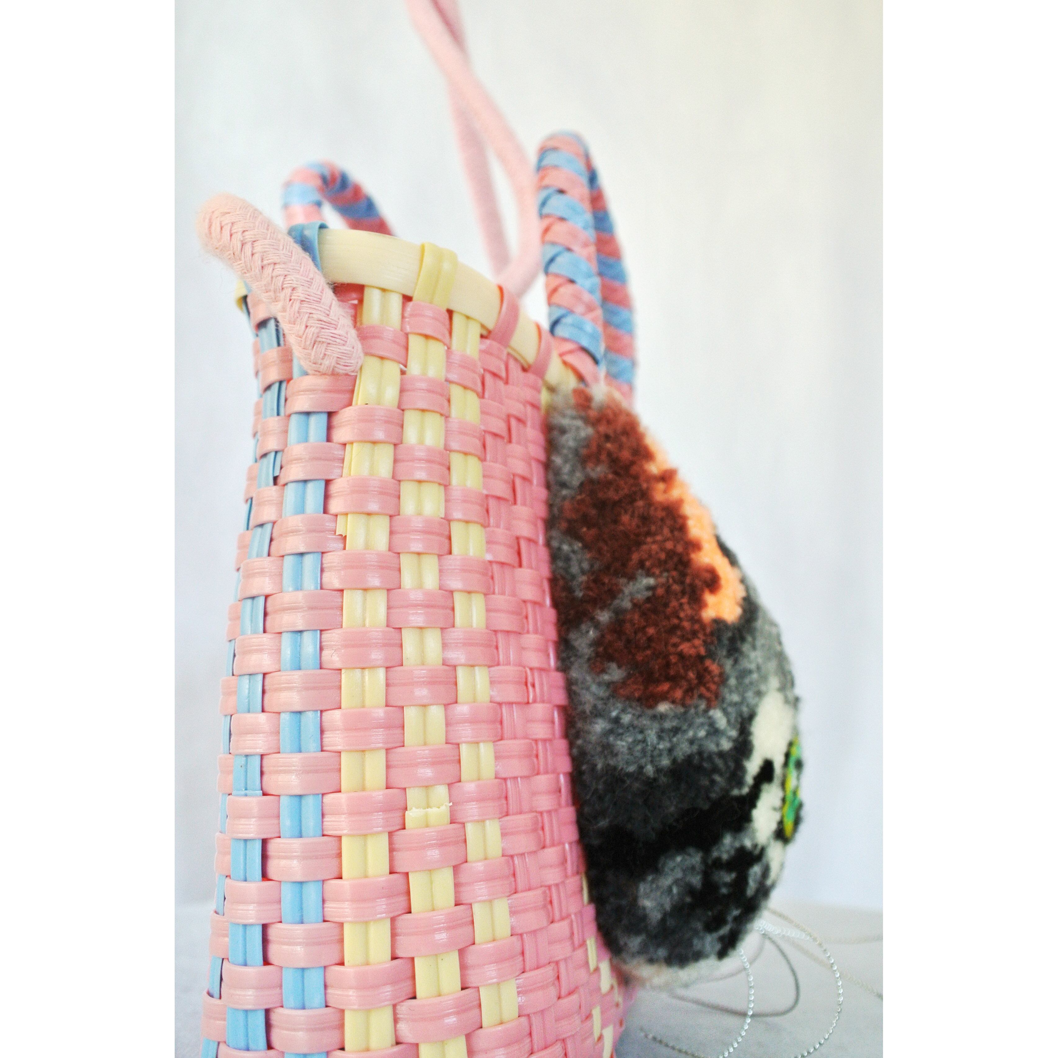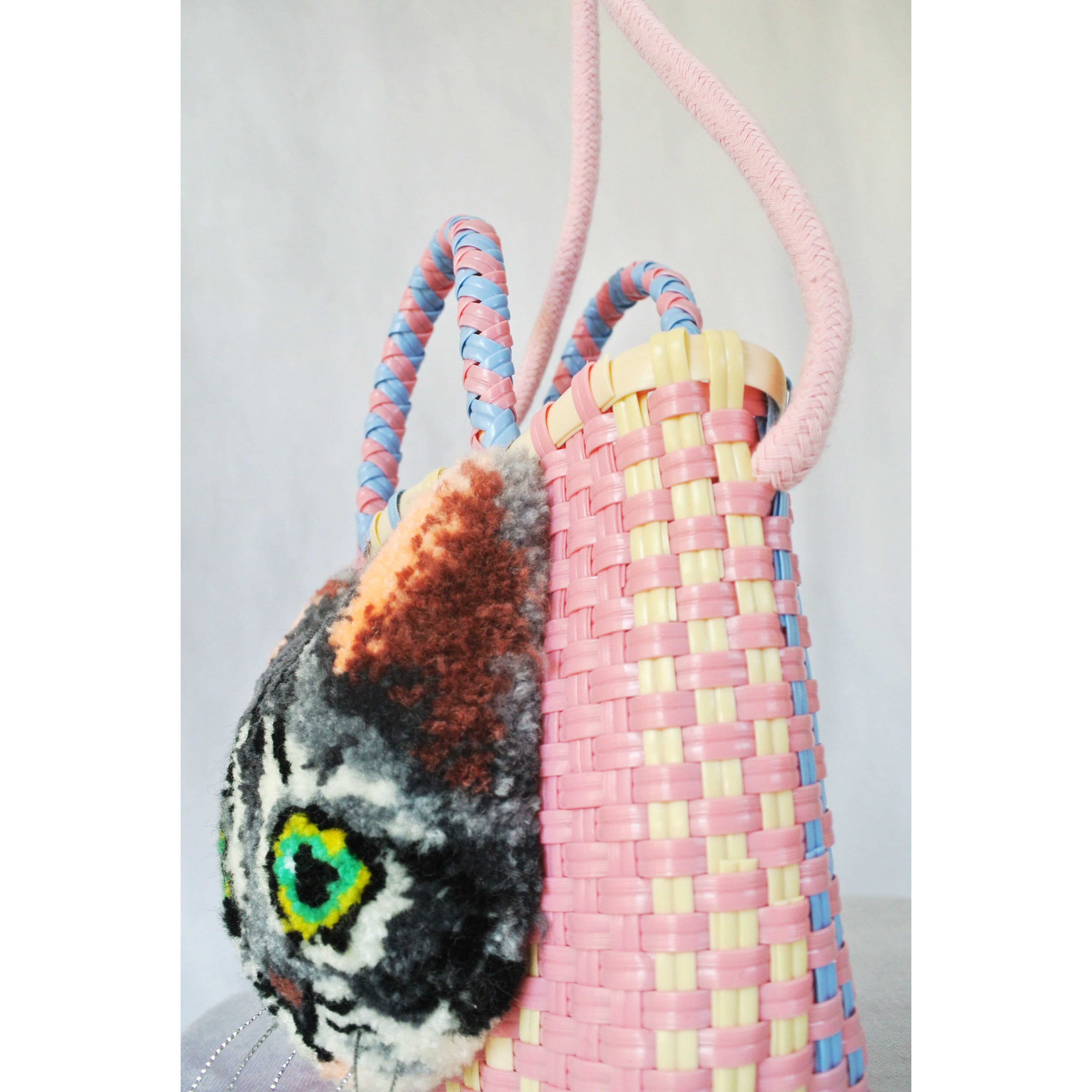 A fluffy, embroidered cat is sewn onto a woven plastic basket.