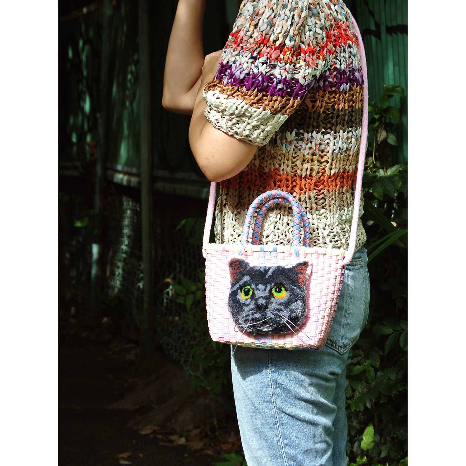 プラスティックで編んだかごに、毛糸でモコモコに刺繍したネコを縫い付けました。