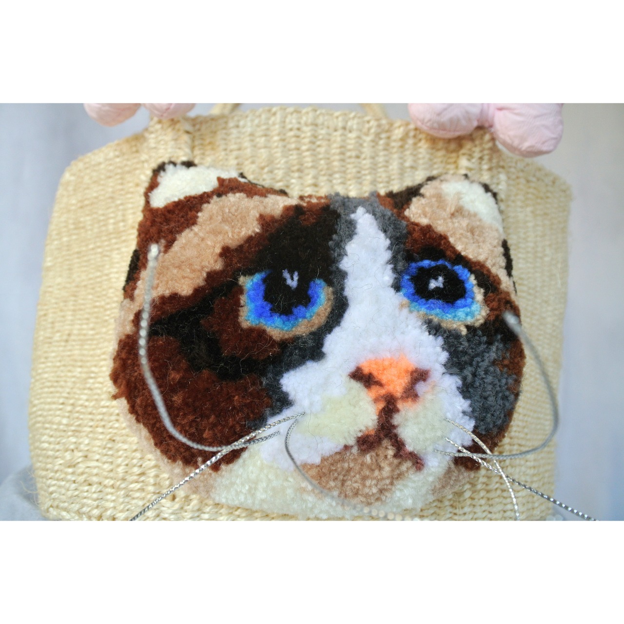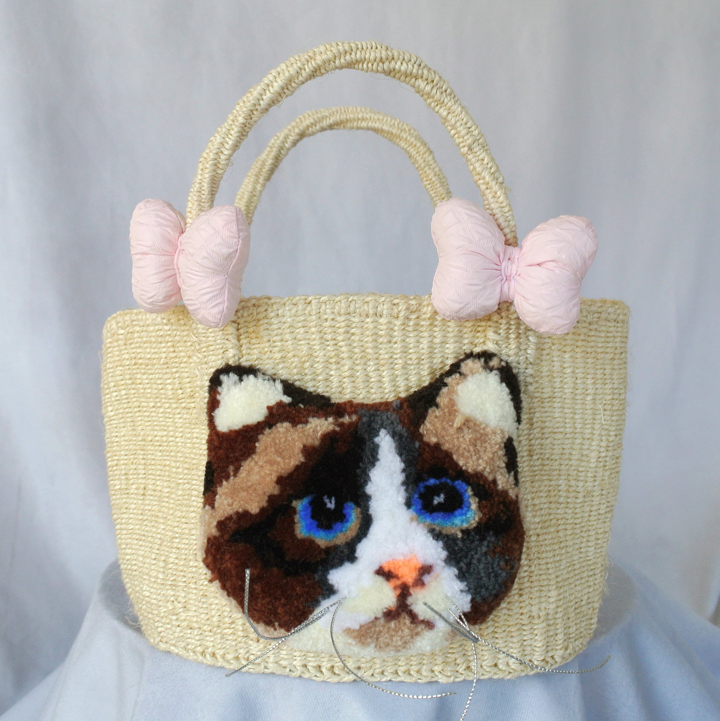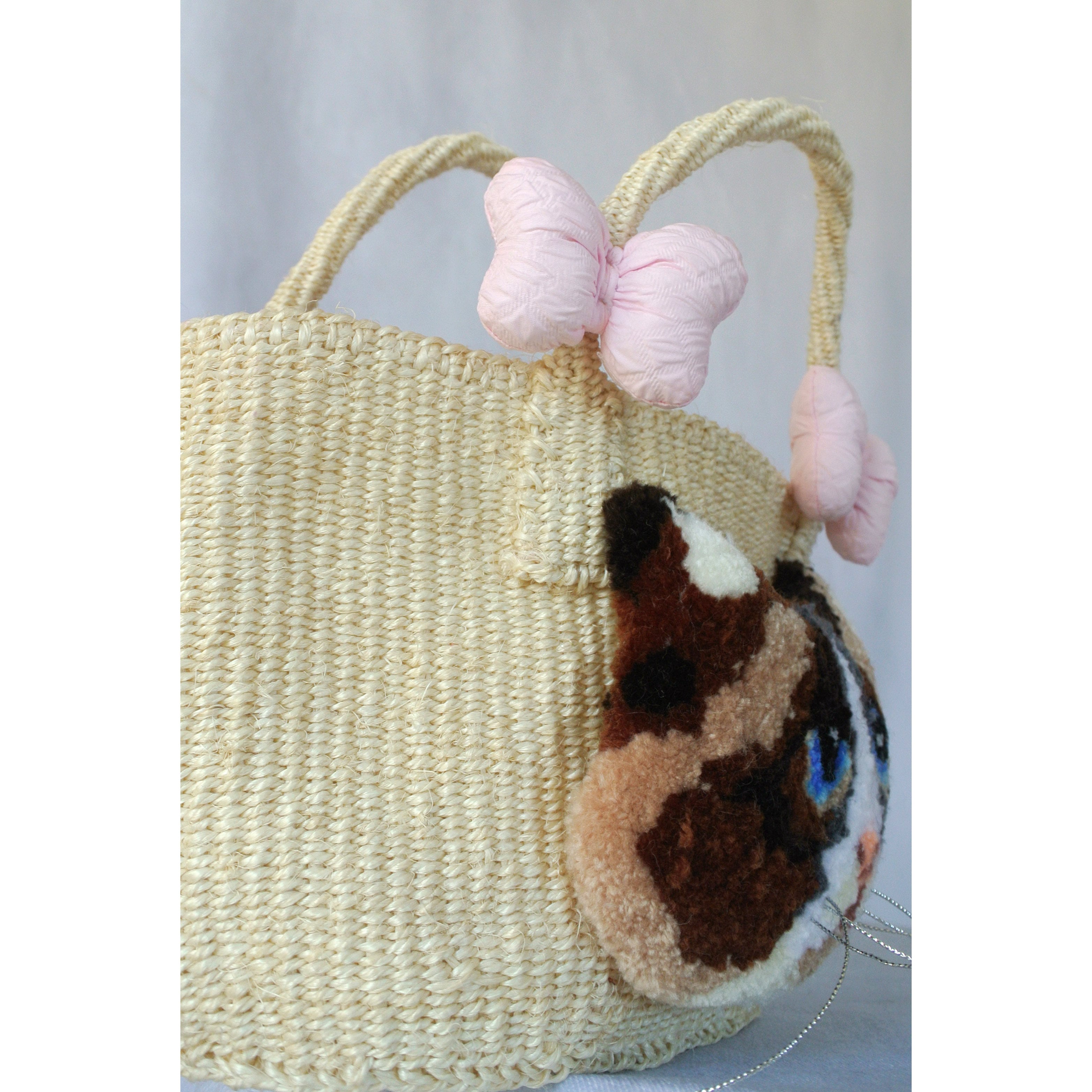 ミニサイズのプリミティブなサイザルかごに、毛糸でモコモコに刺繍したネコとプクプクリボンを縫い付けました。