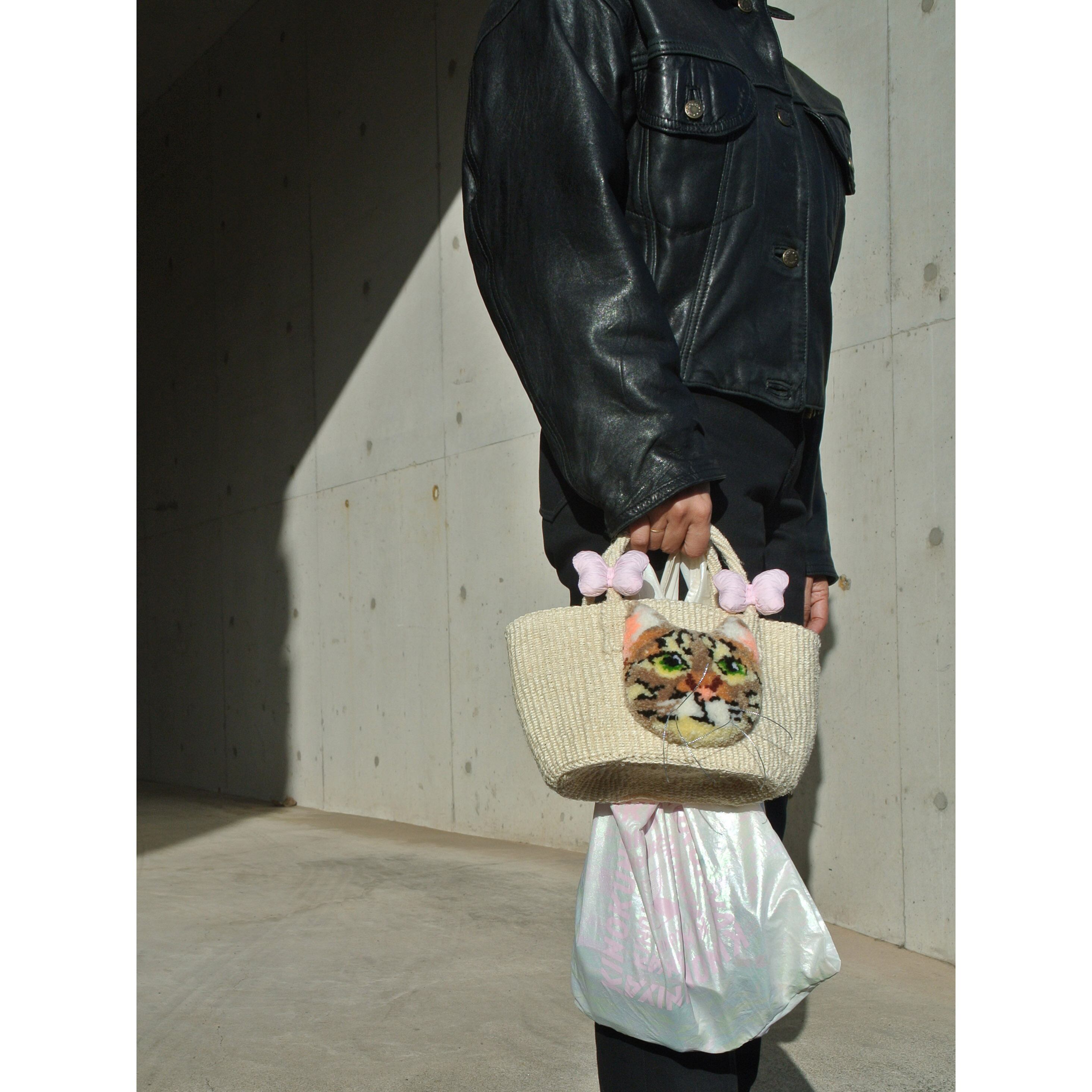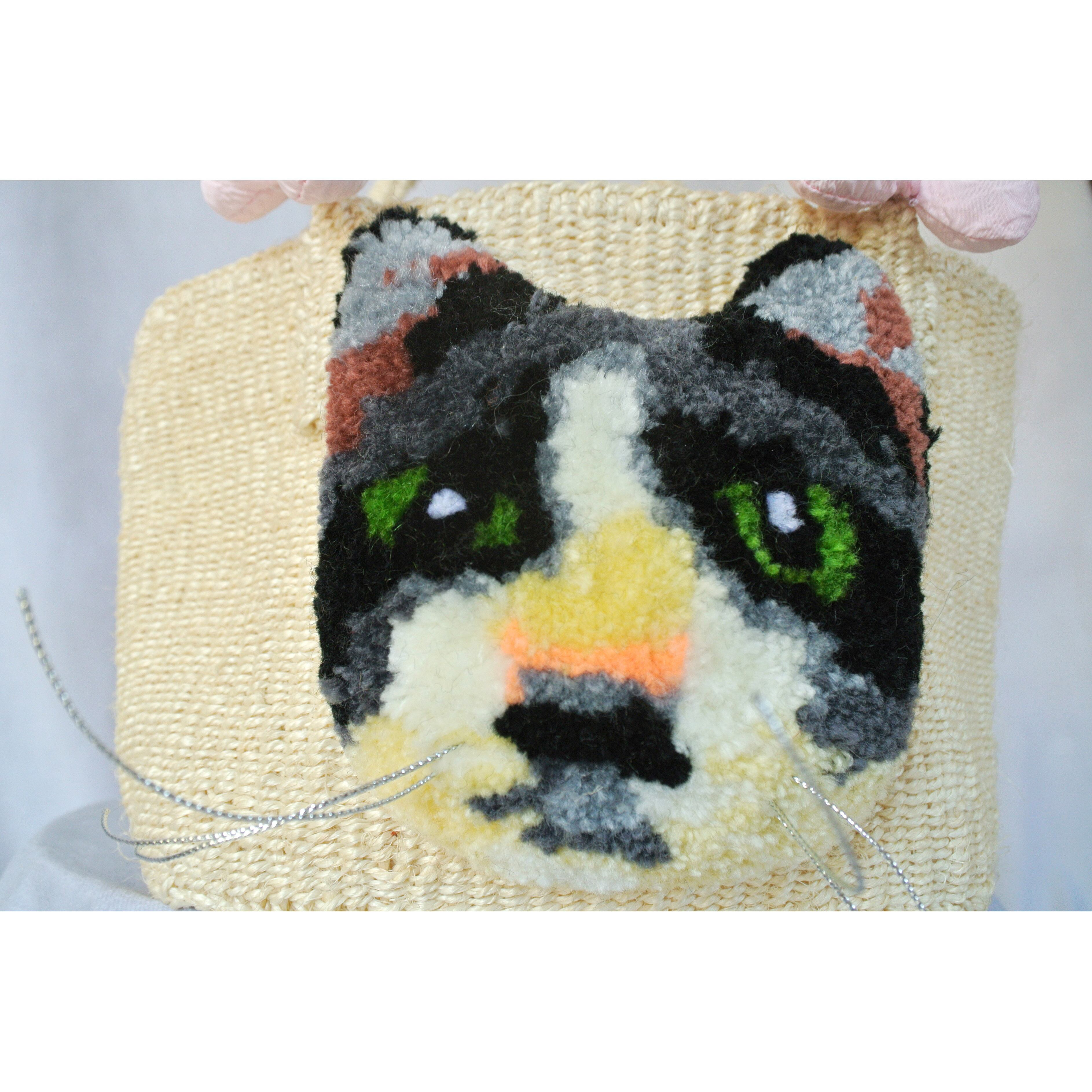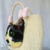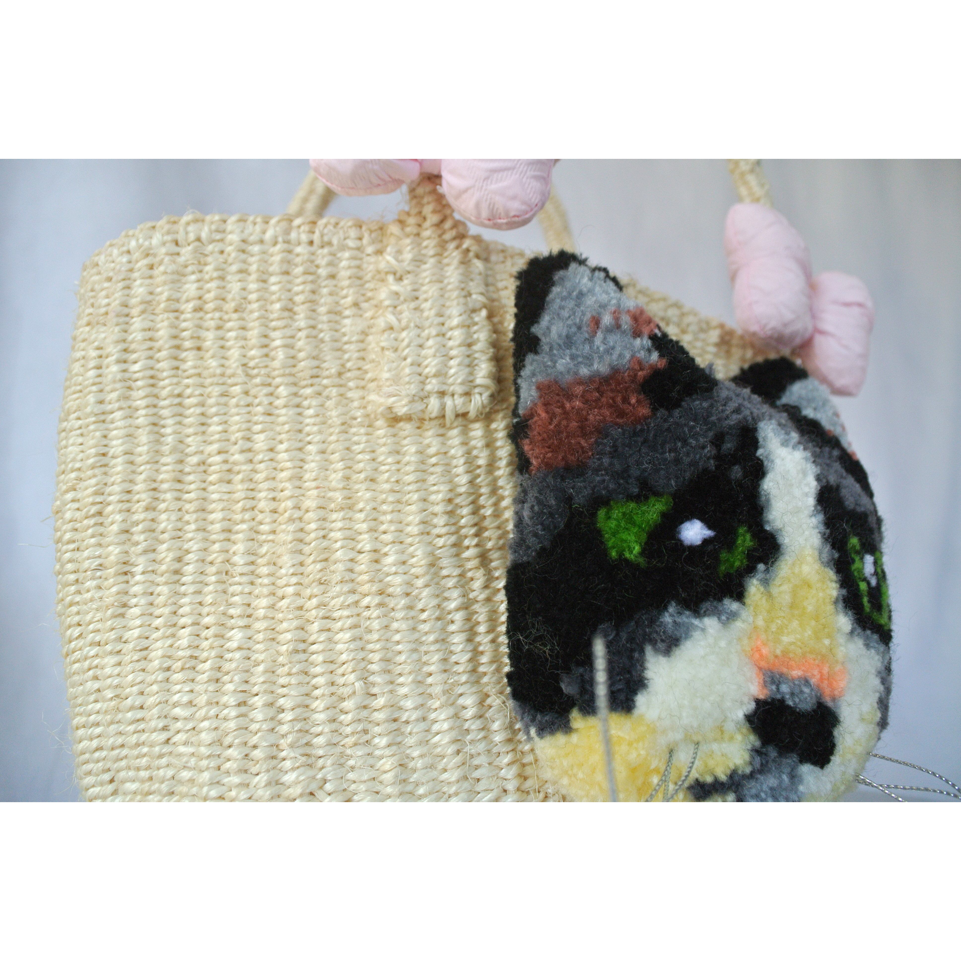 ミニサイズのプリミティブなサイザルかごに、毛糸でモコモコに刺繍したネコとプクプクリボンを縫い付けました。