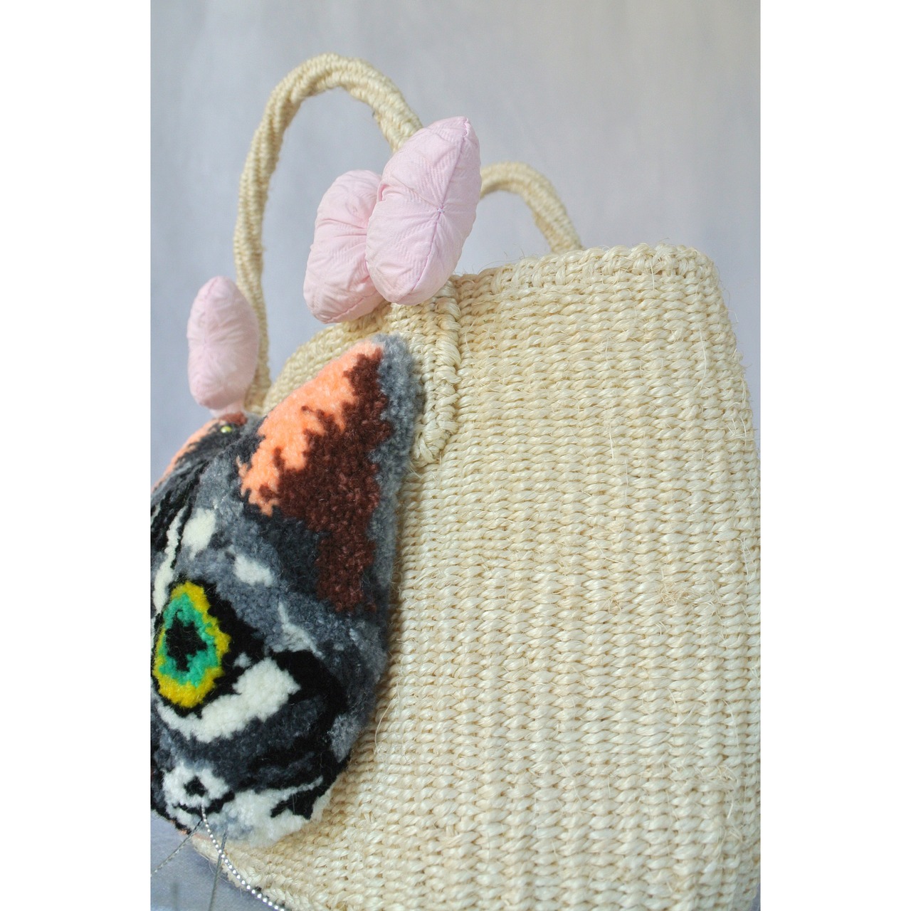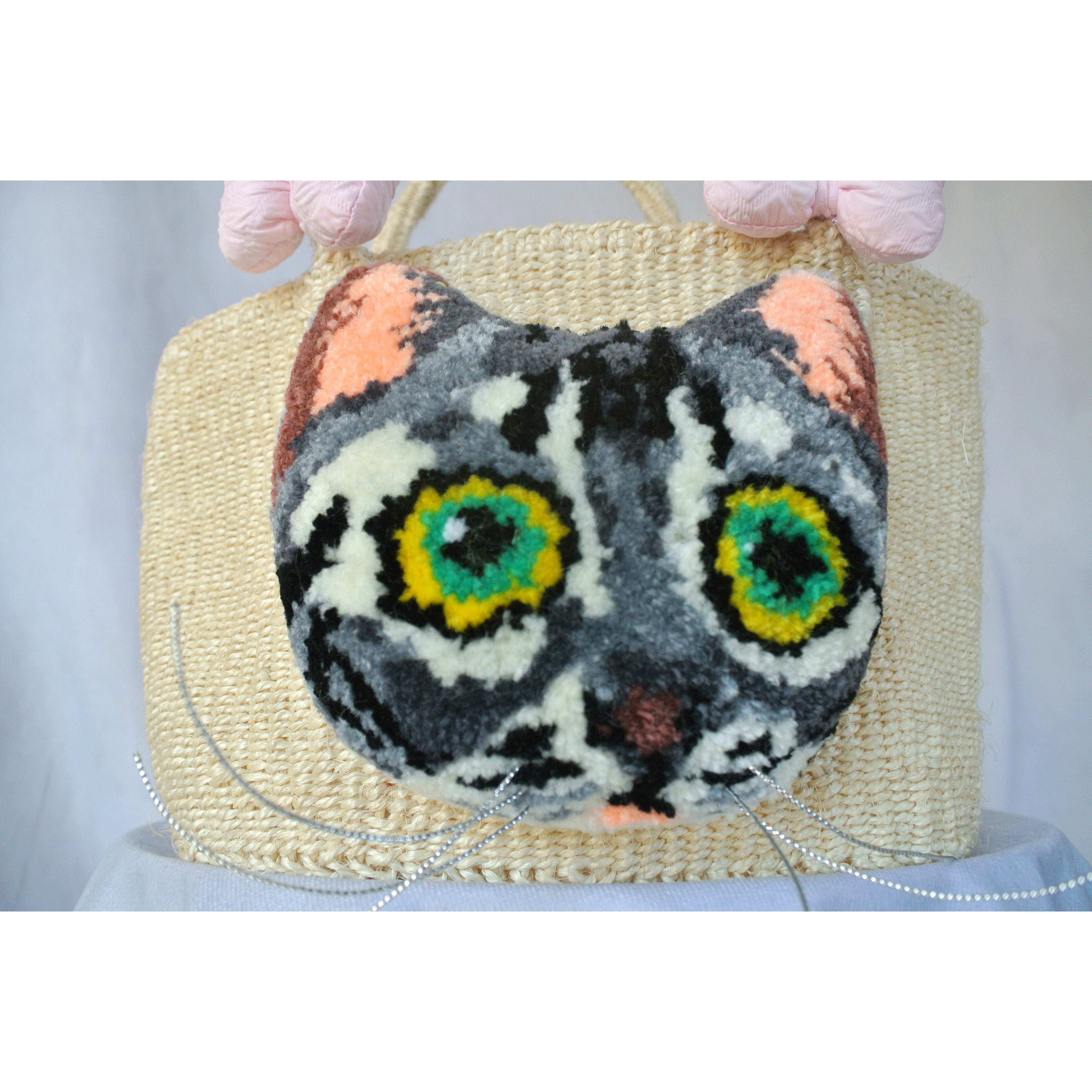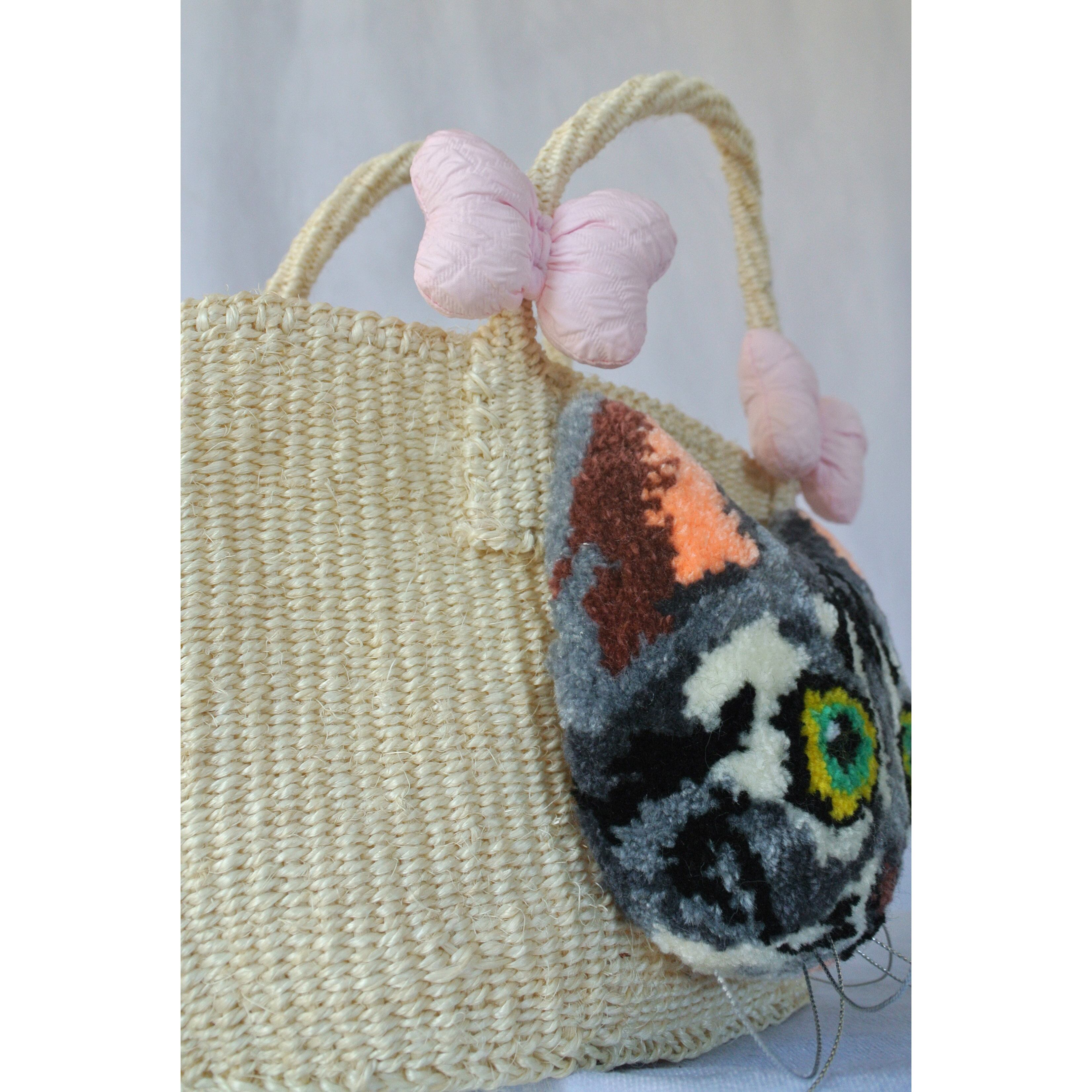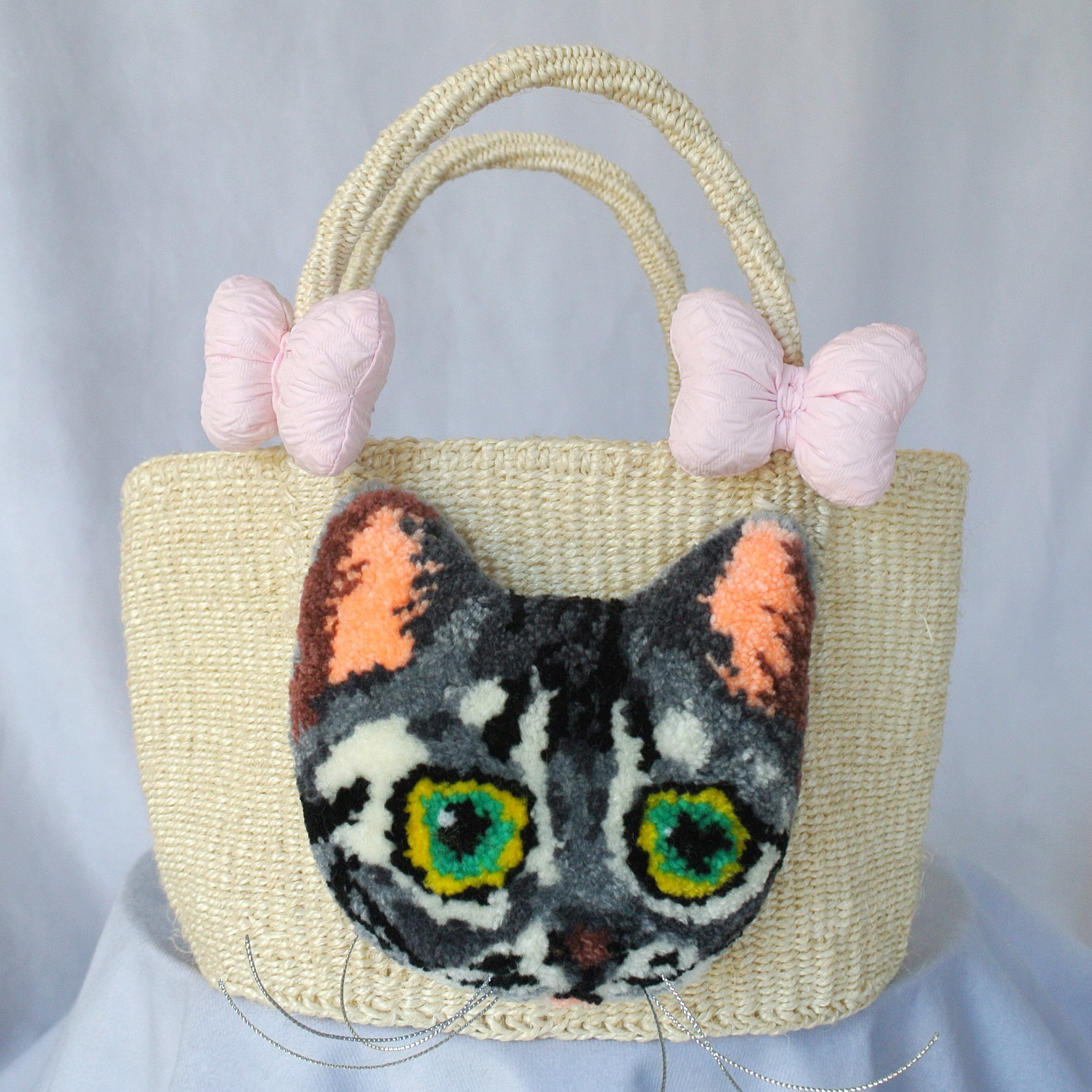 ミニサイズのプリミティブなサイザルかごに、毛糸でモコモコに刺繍したネコとプクプクリボンを縫い付けました。