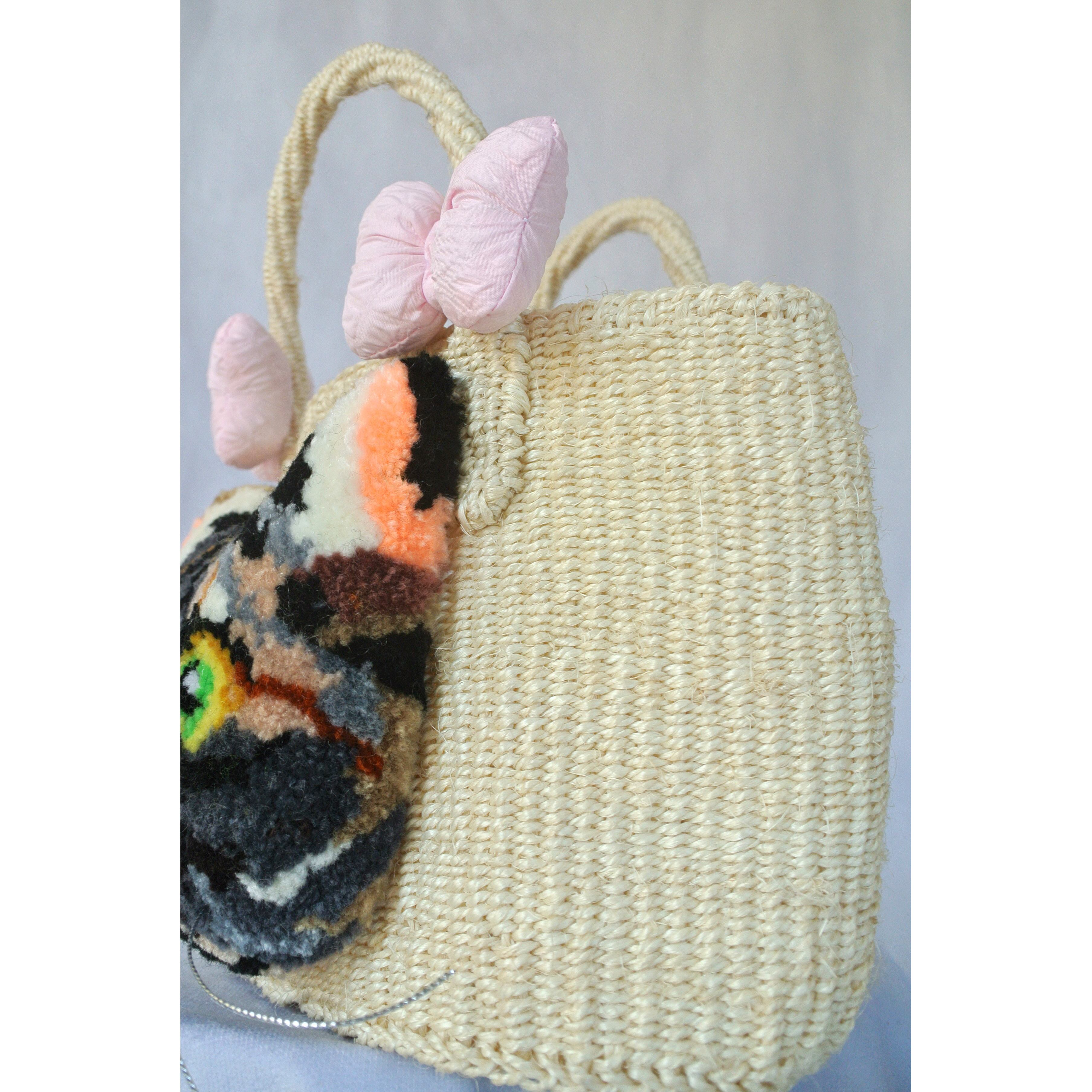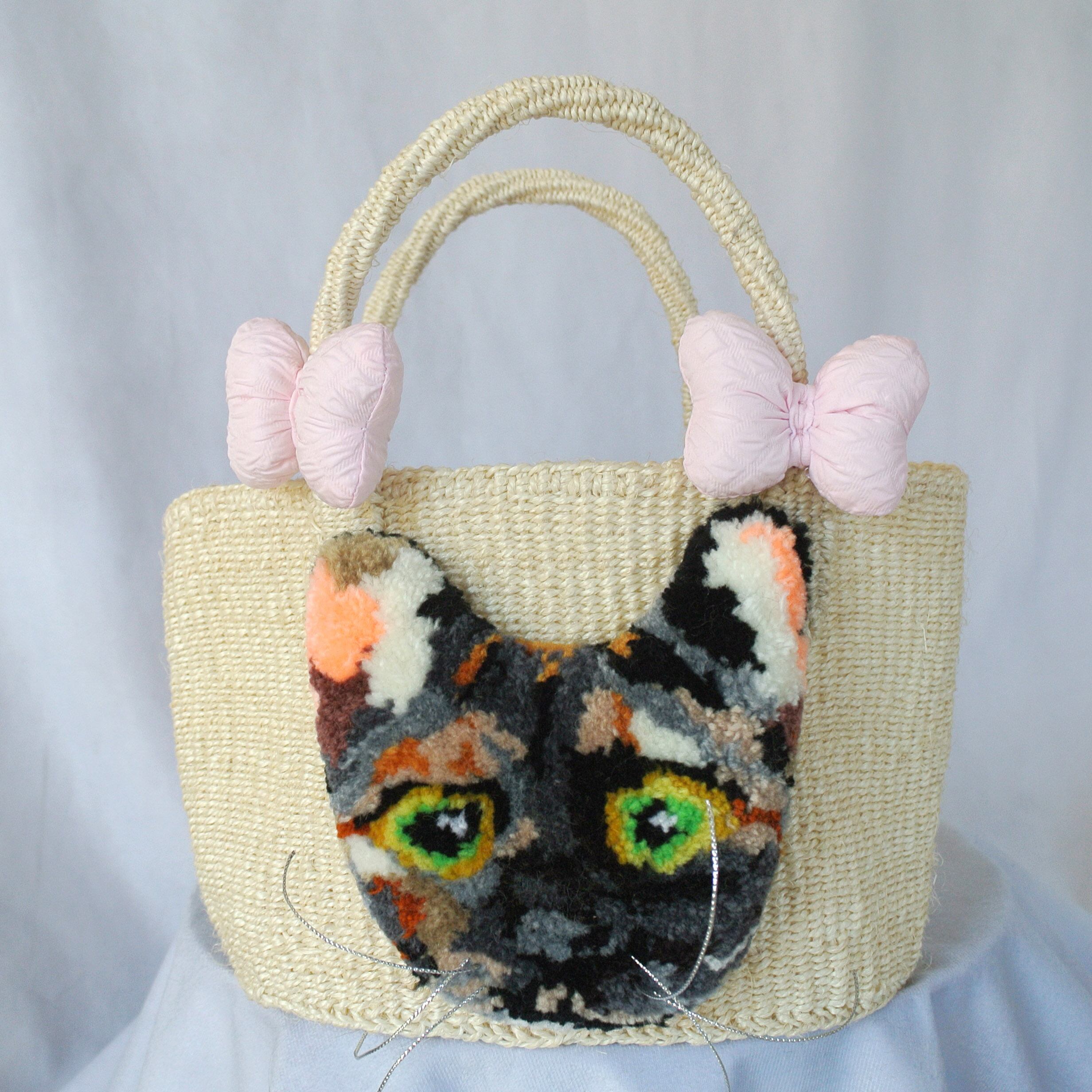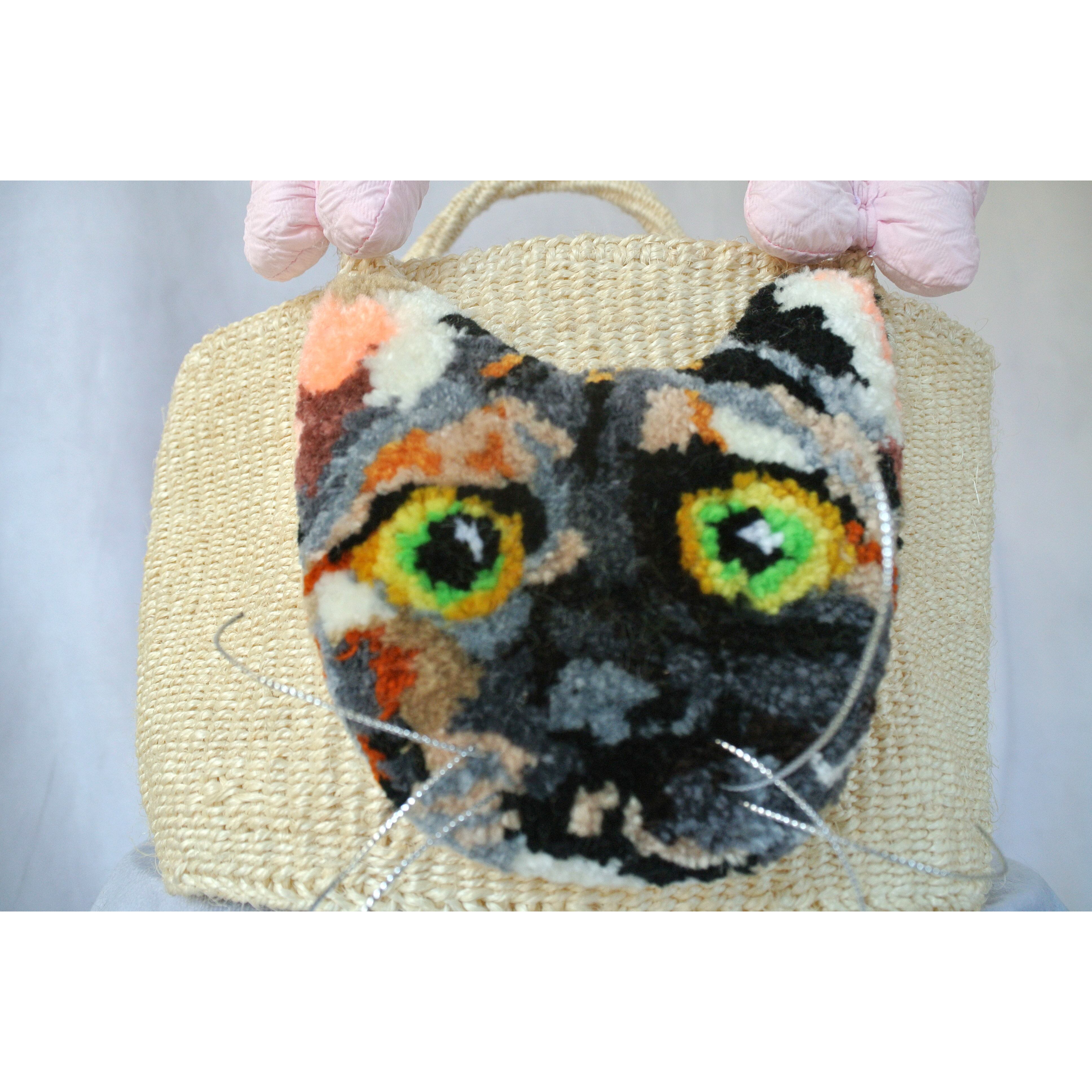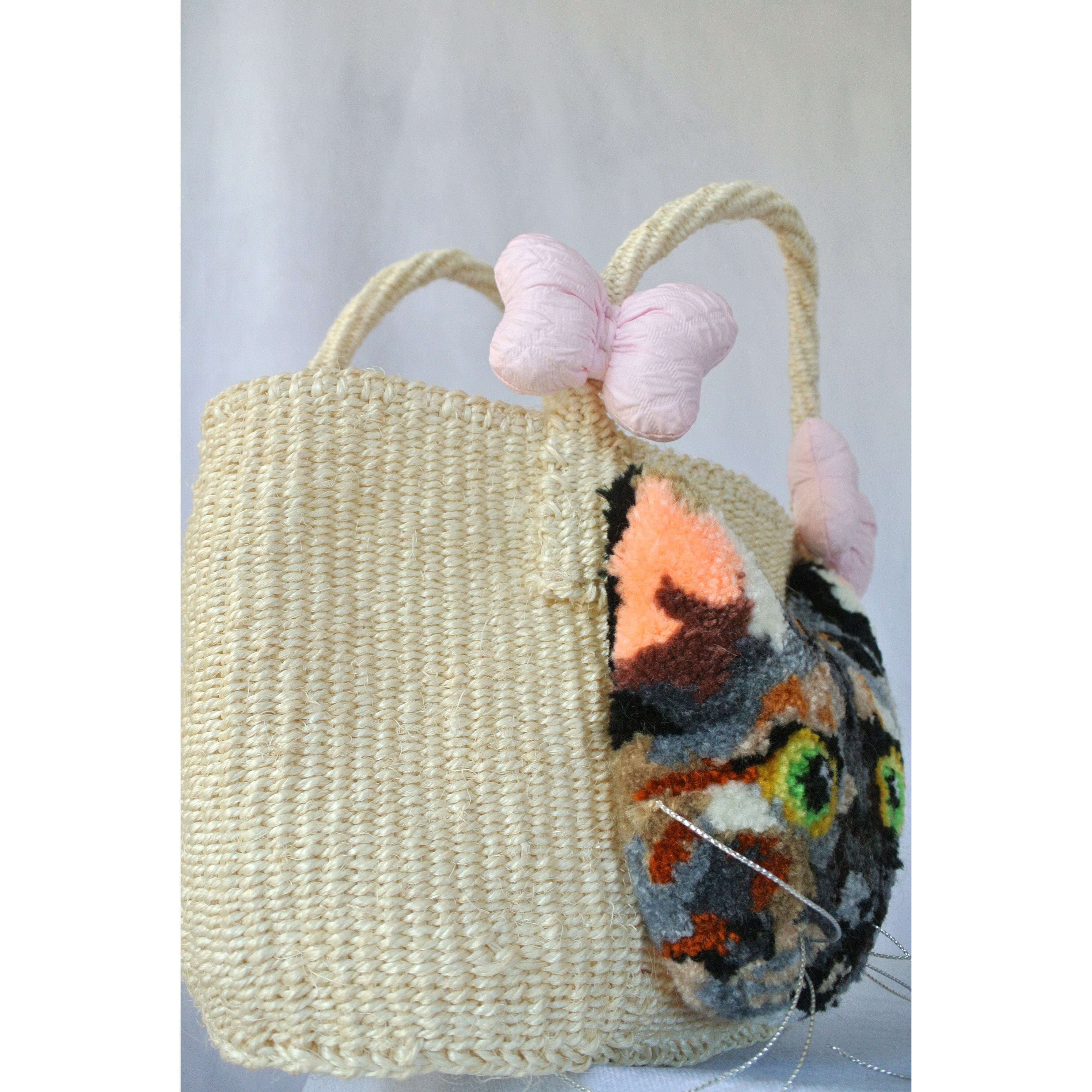 ミニサイズのプリミティブなサイザルかごに、毛糸でモコモコに刺繍したネコとプクプクリボンを縫い付けました。