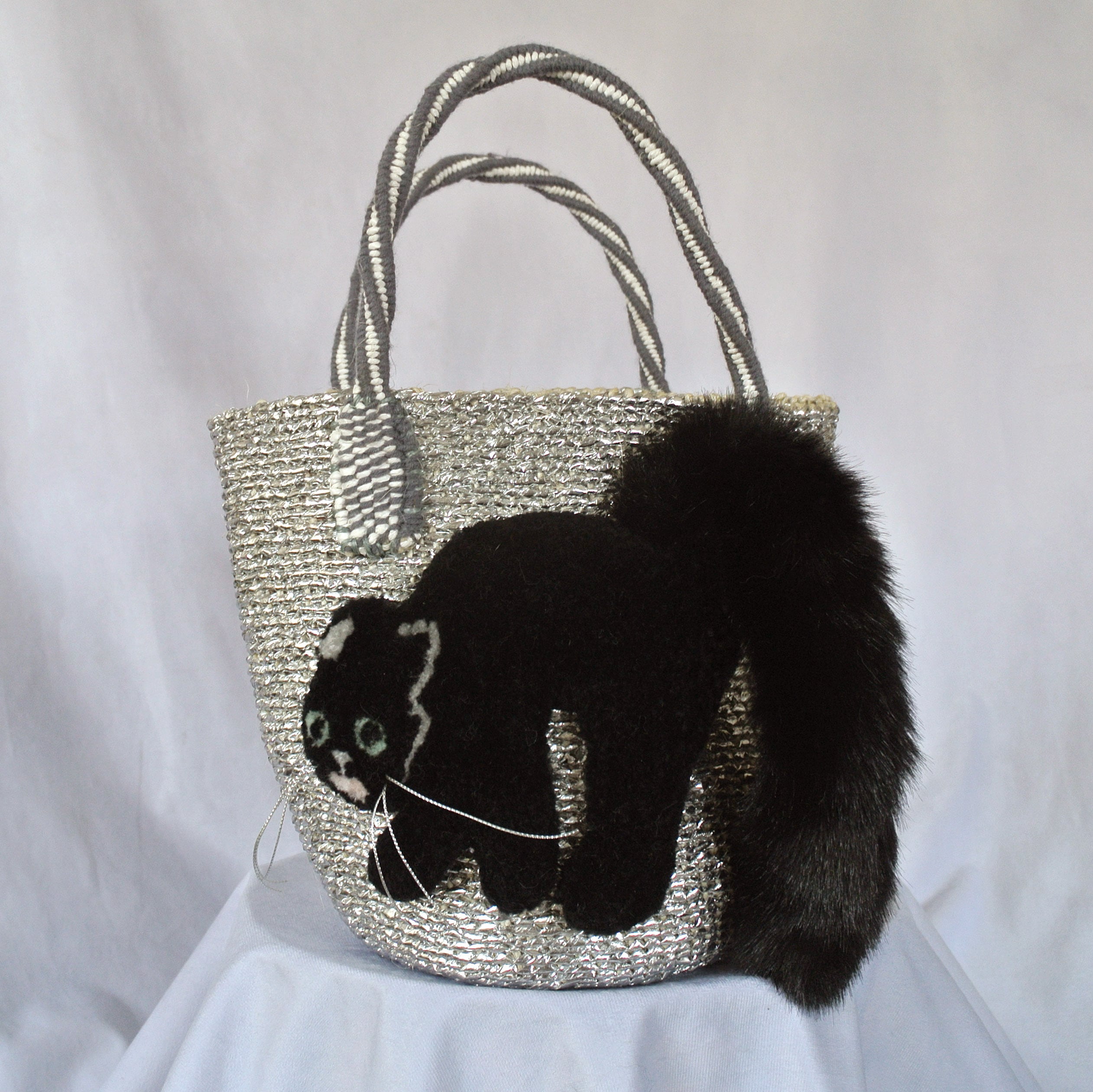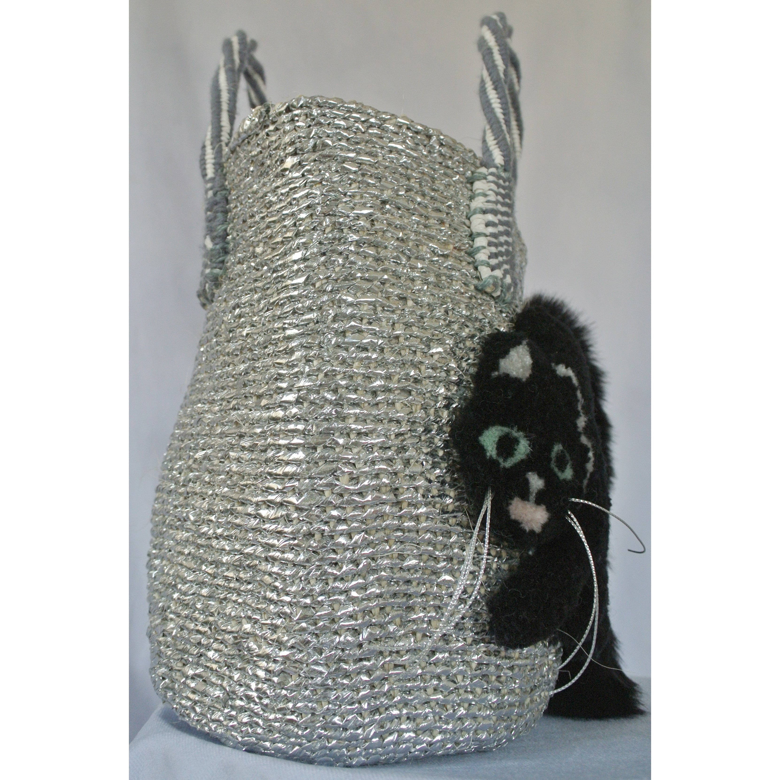 素材: ボディ:サイザル麻✖️プラスチックシルバーリボン、シッポ部分 アクリル/ナイロン、猫刺繍部分 アクリル/ウール