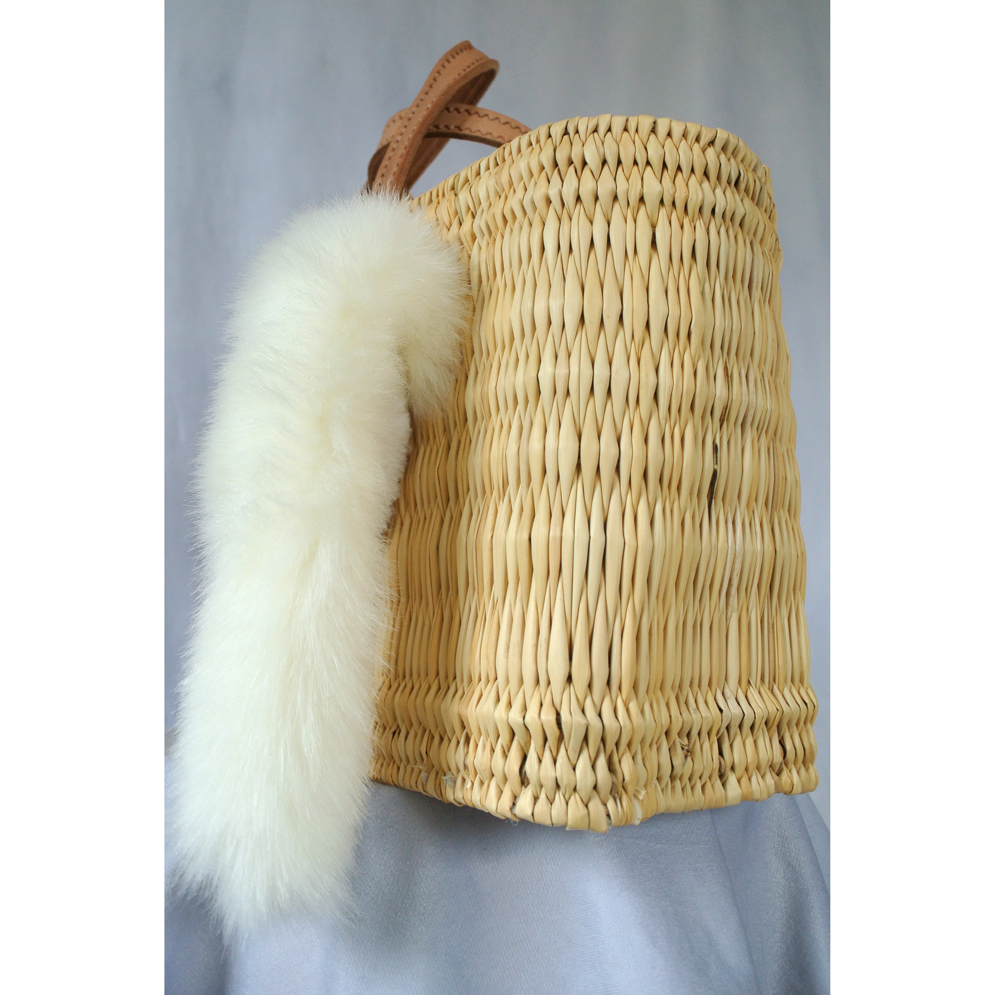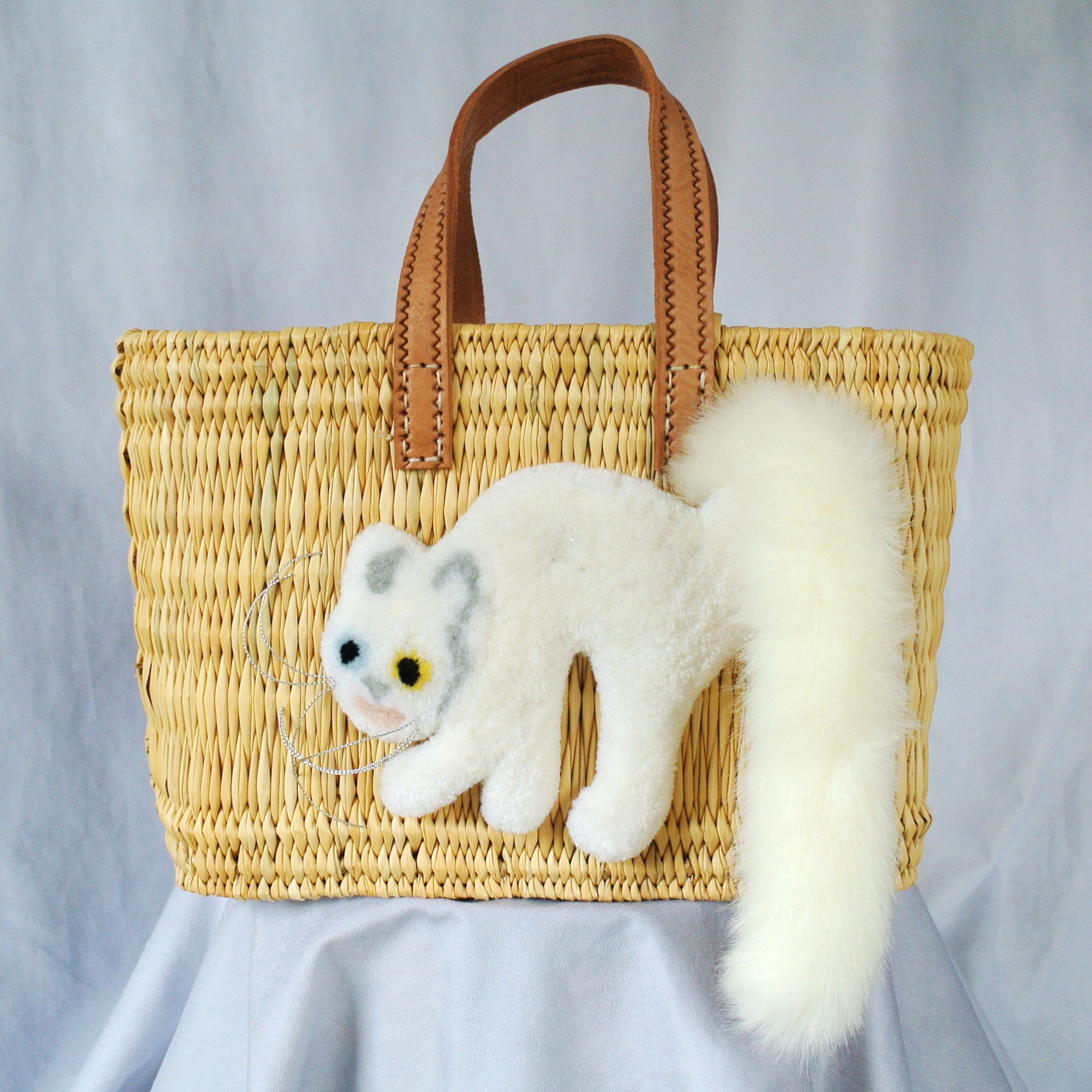 エレファントグラス(イネ科の水草)を編み上げた本体はしっかりと編まれており、自立します。毛糸でモコモコに刺繍した猫ちゃんと、ふわふわロングなシッポがポイントのかごバッグです。