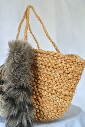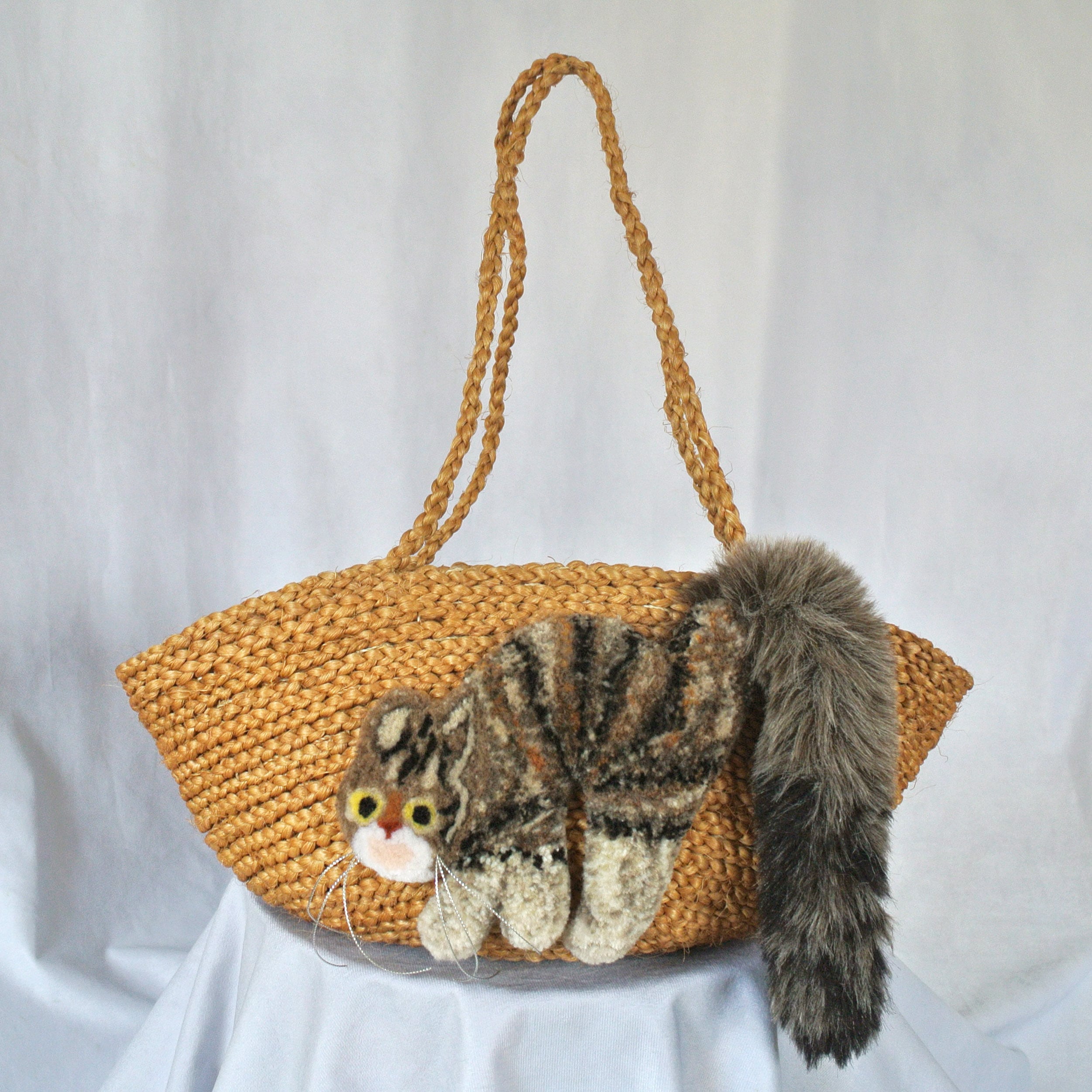 毛糸でモコモコに刺繍した猫ちゃんと、ふわふわロングなシッポがポイントのかごバッグです。