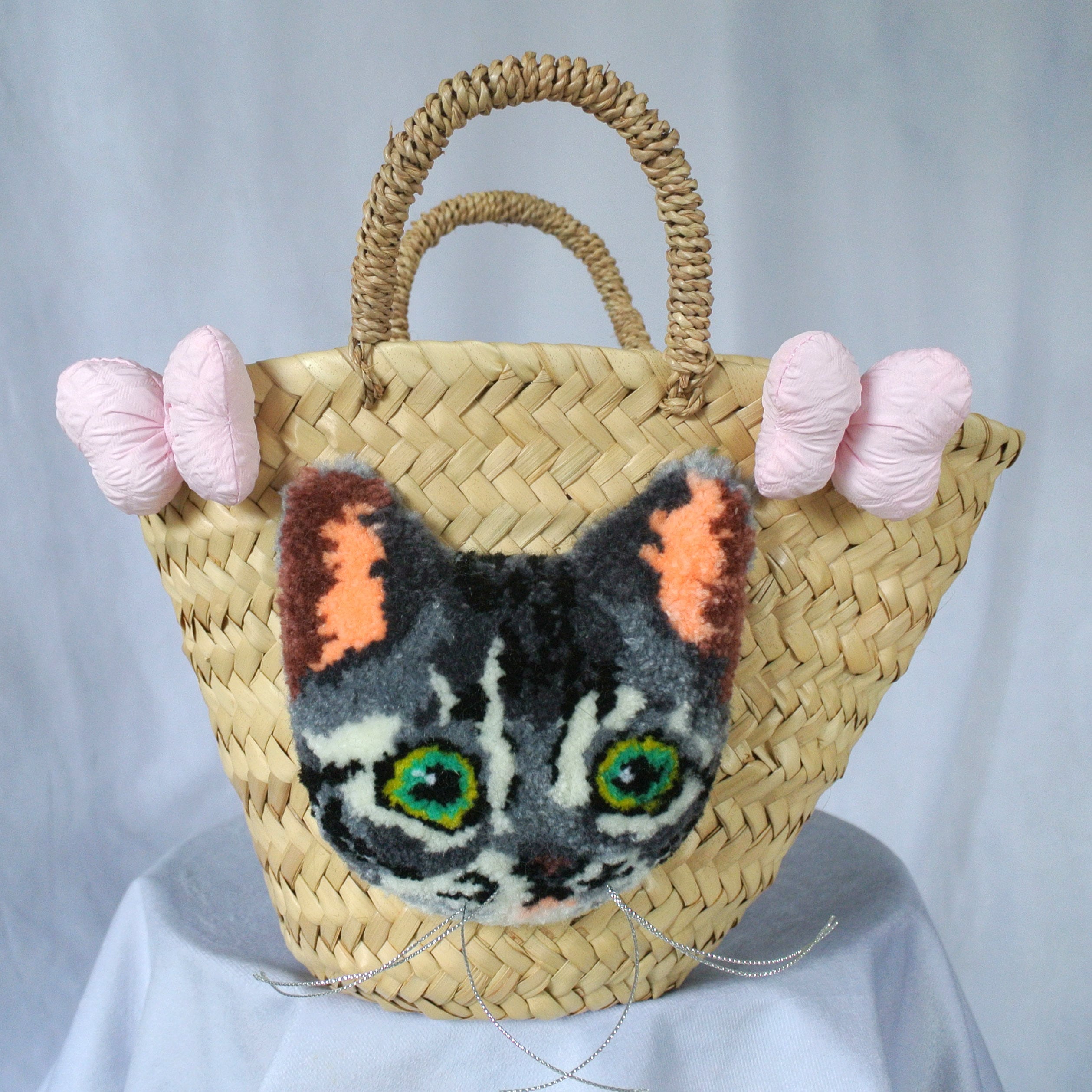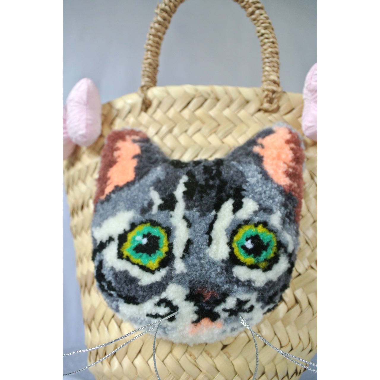 素朴な風合いのモロッコ製のマルシェかごに、毛糸でモコモコに刺繍したネコとプクプクリボンを縫い付けました。