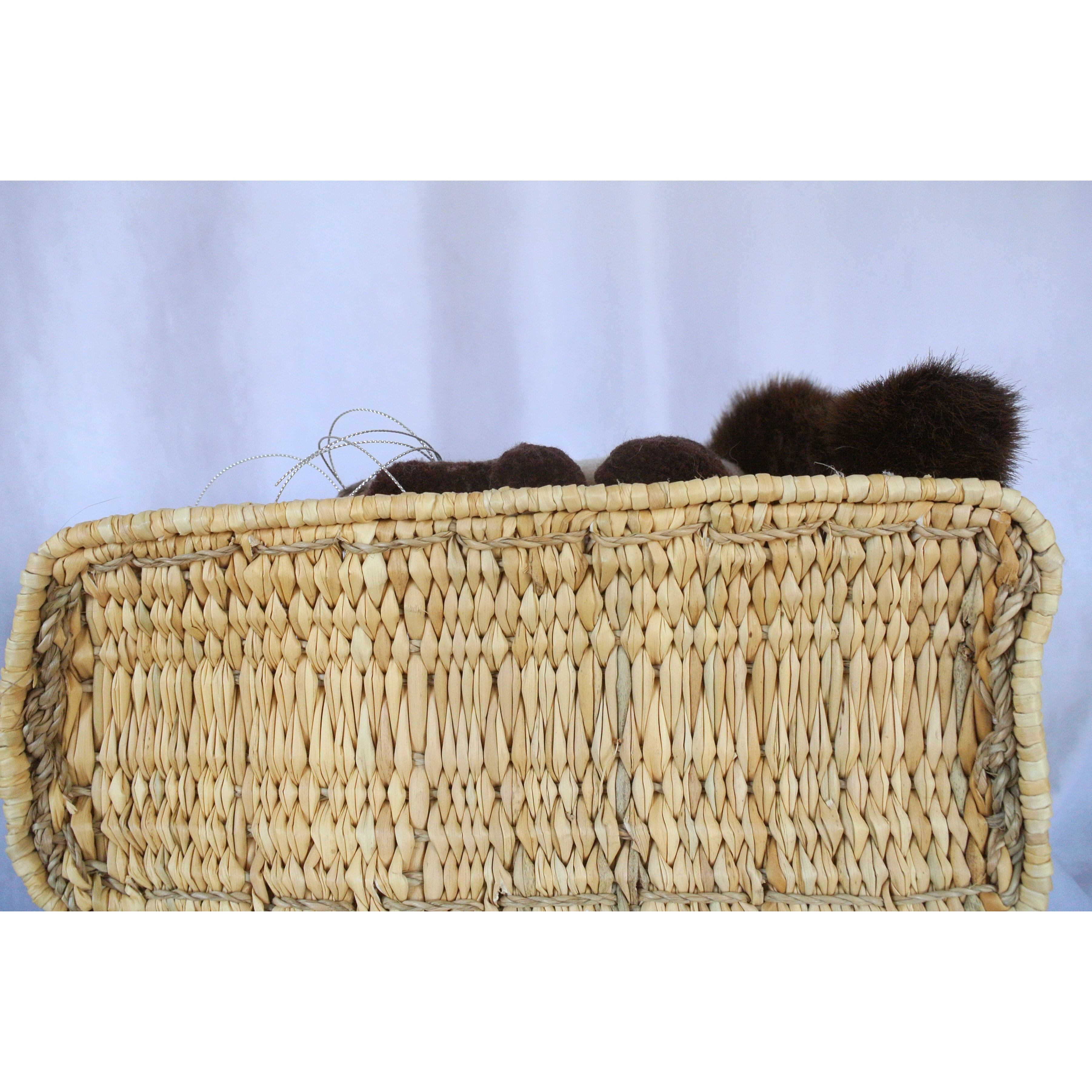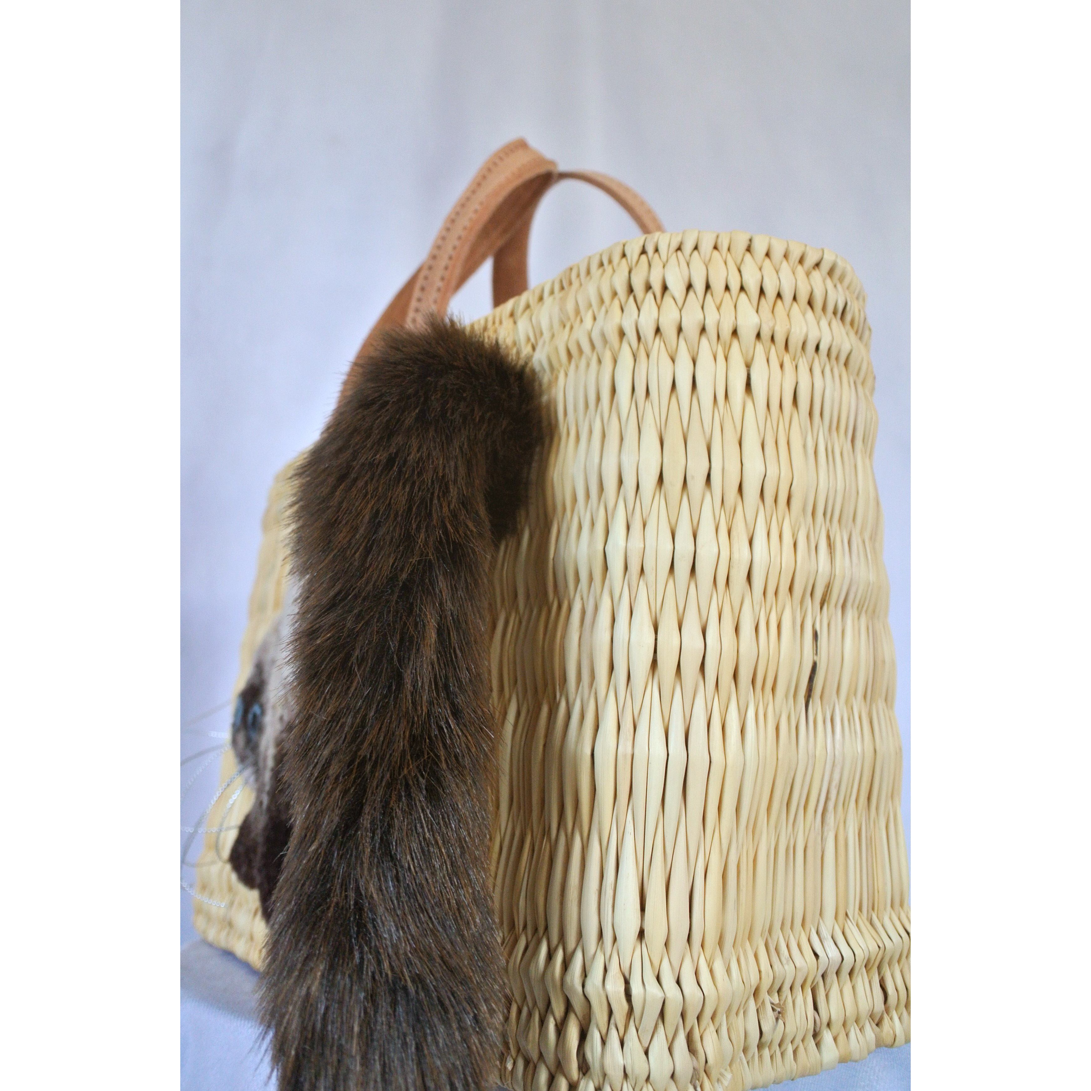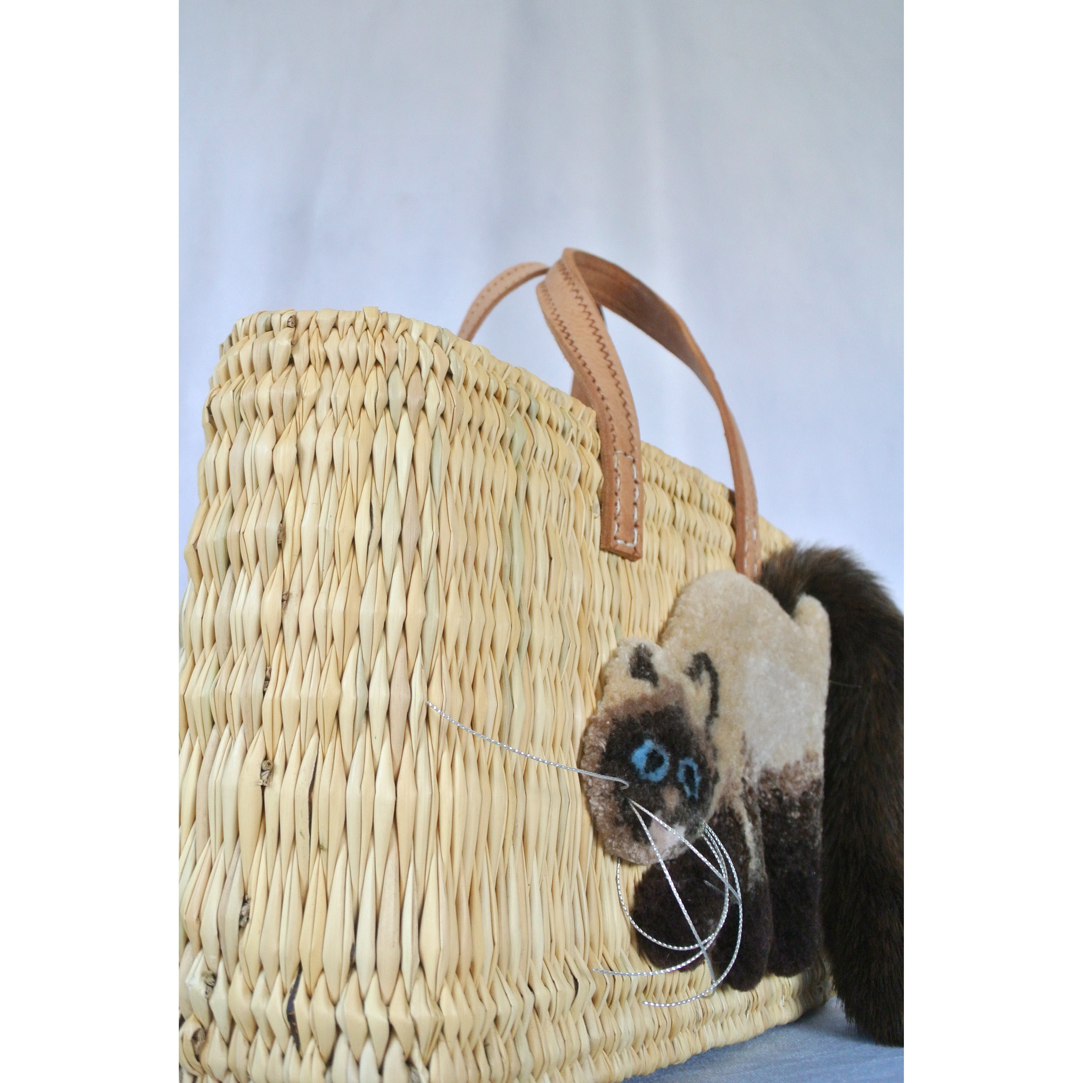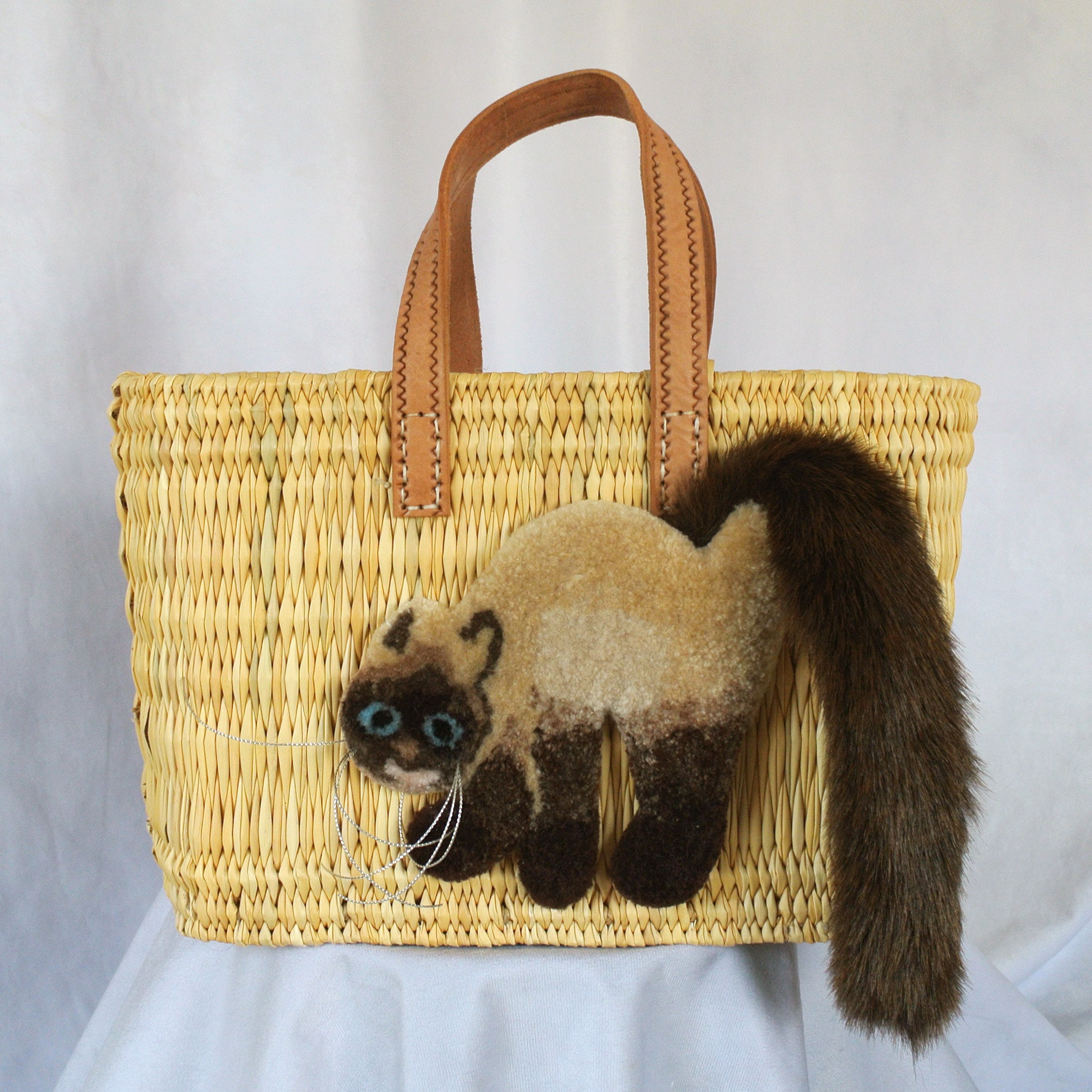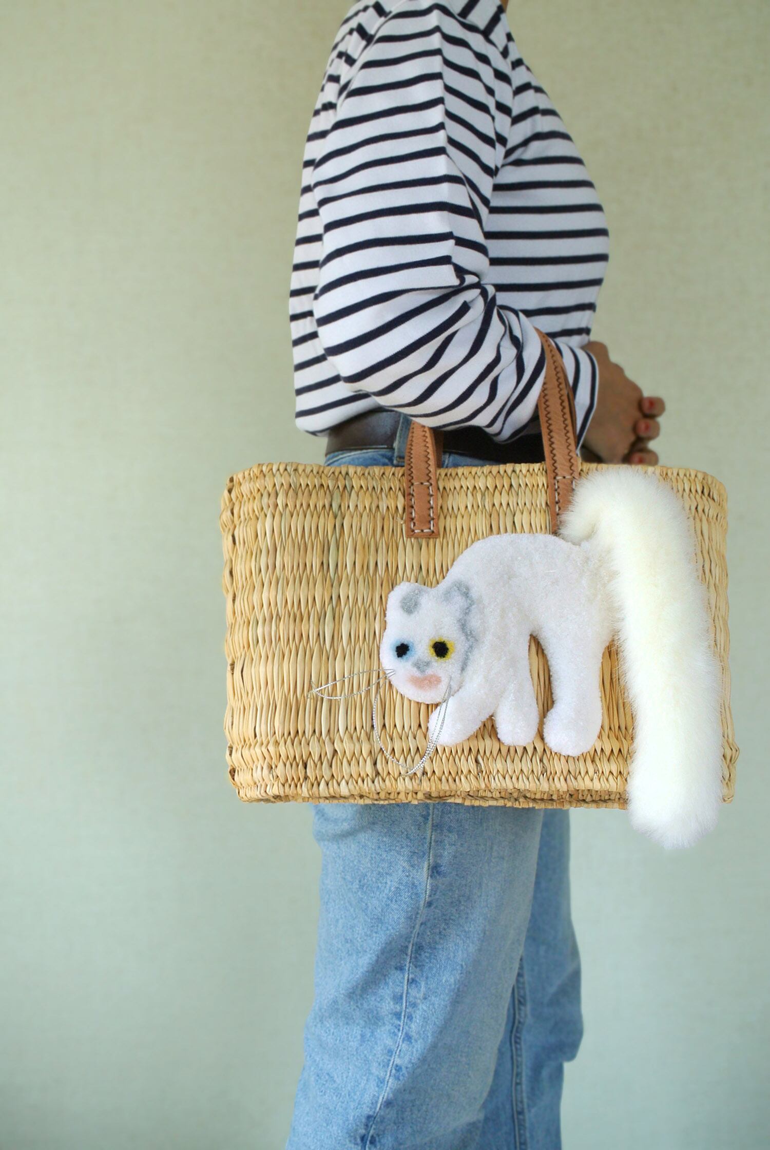 エレファントグラス(イネ科の水草)を編み上げた本体はしっかりと編まれており、自立します。毛糸でモコモコに刺繍した猫ちゃんと、ふわふわロングなシッポがポイントのかごバッグです。
