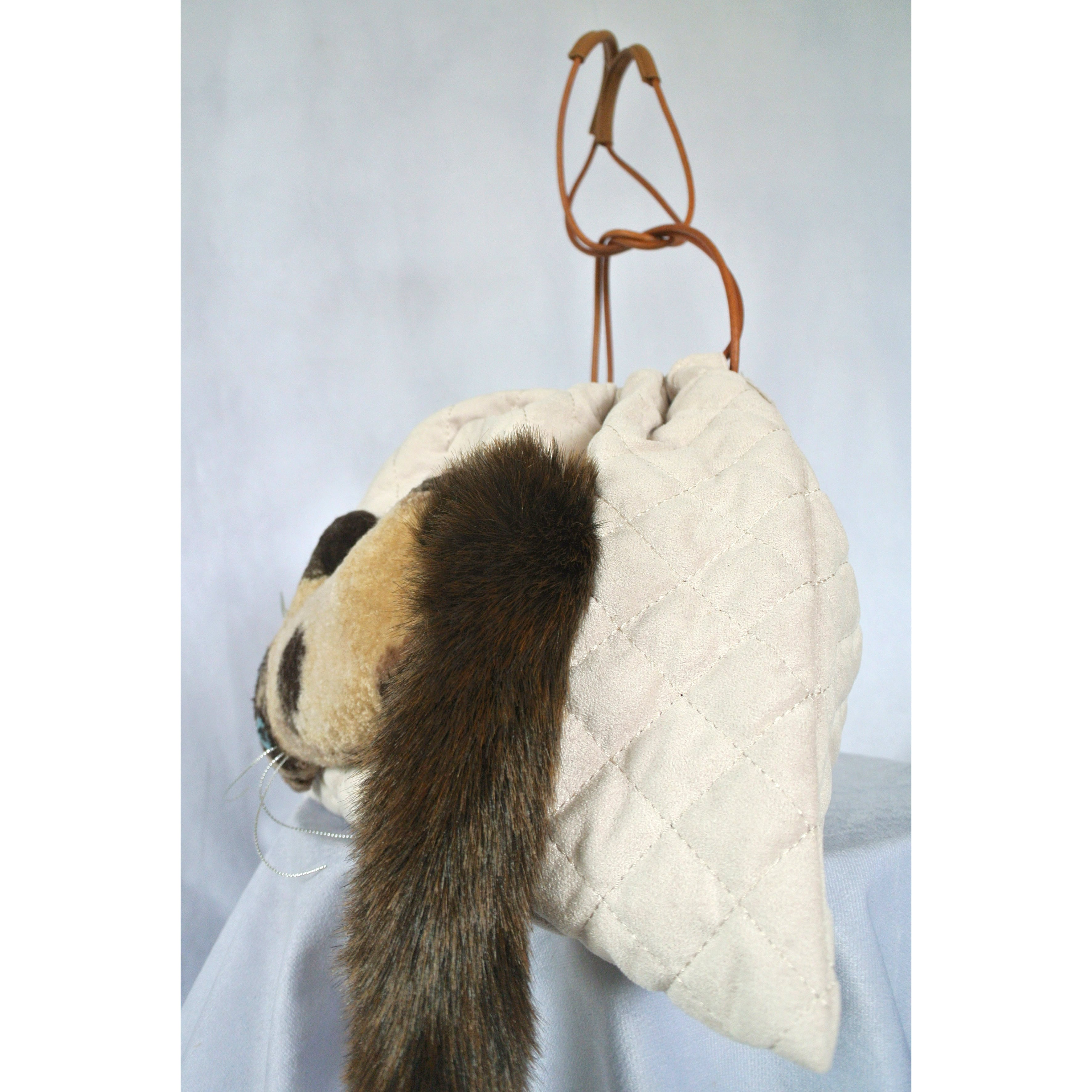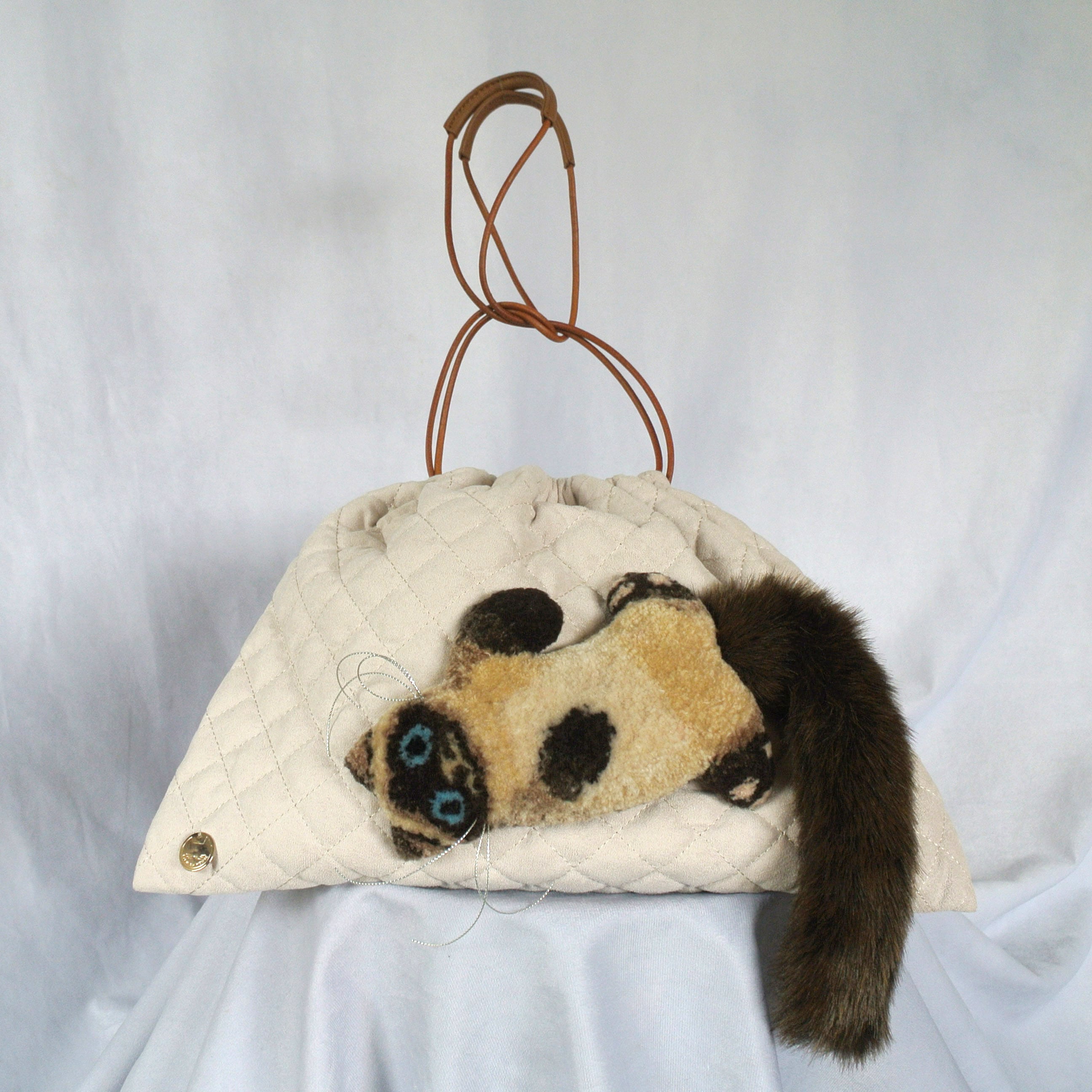 毛糸でモコモコに刺繍した猫ちゃんと、ふわふわなシッポがポイントな巾着バッグです。
