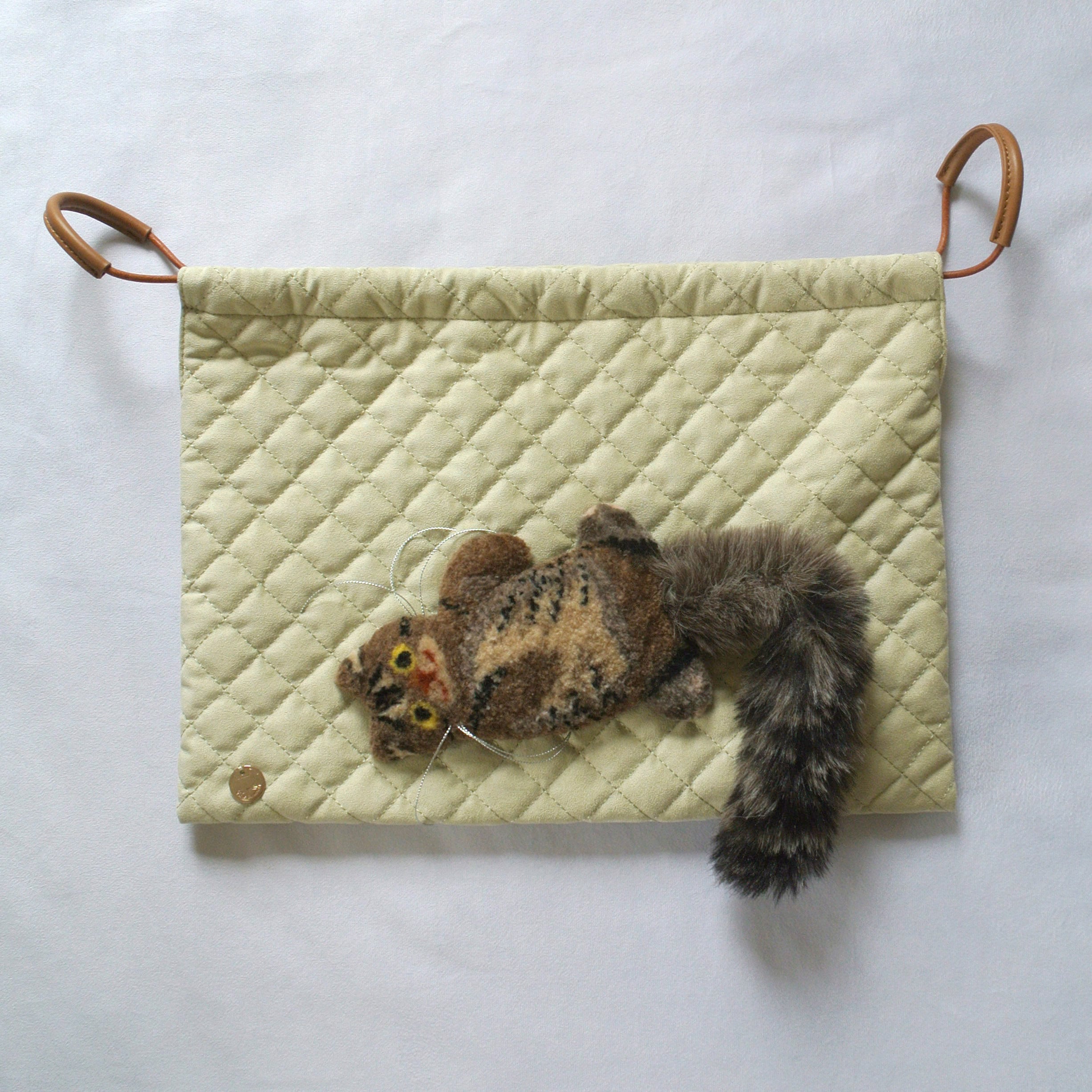 毛糸でモコモコに刺繍した猫ちゃんと、ふわふわなシッポがポイントな巾着バッグです。