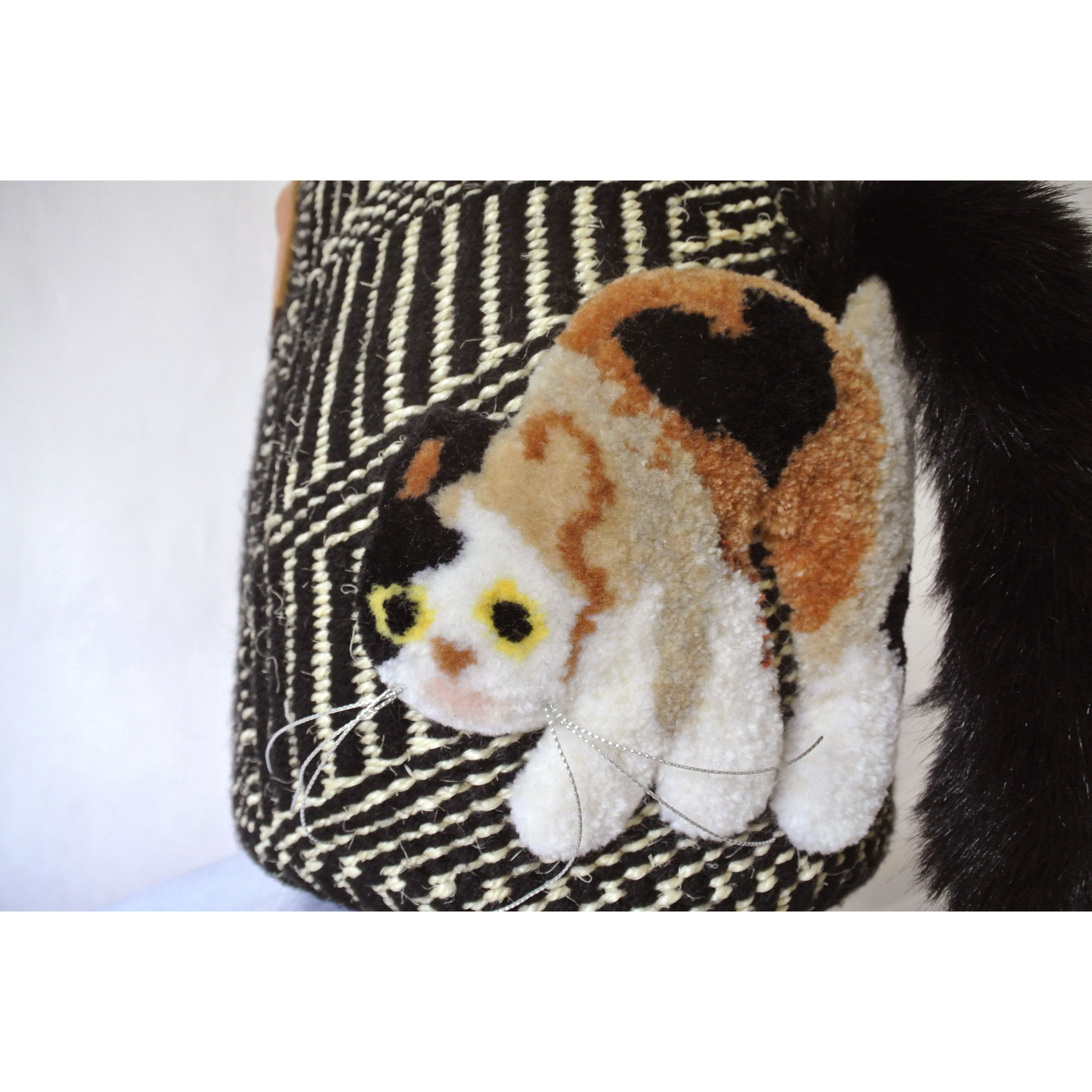 毛糸でモコモコに刺繍した猫ちゃんと、ふわふわロングなシッポがポイントのかごバッグです。