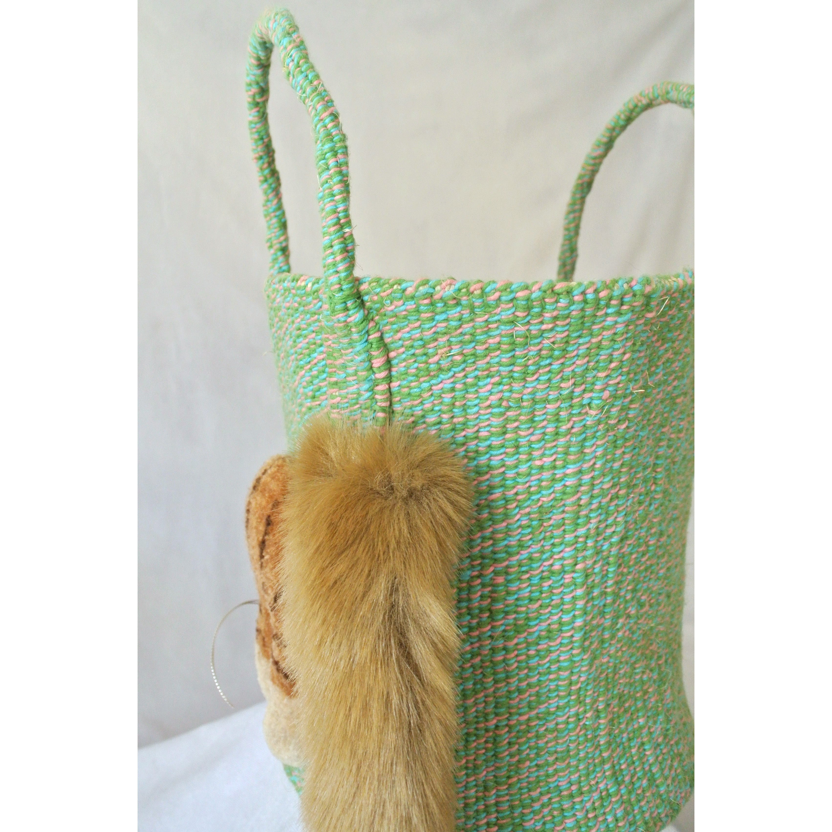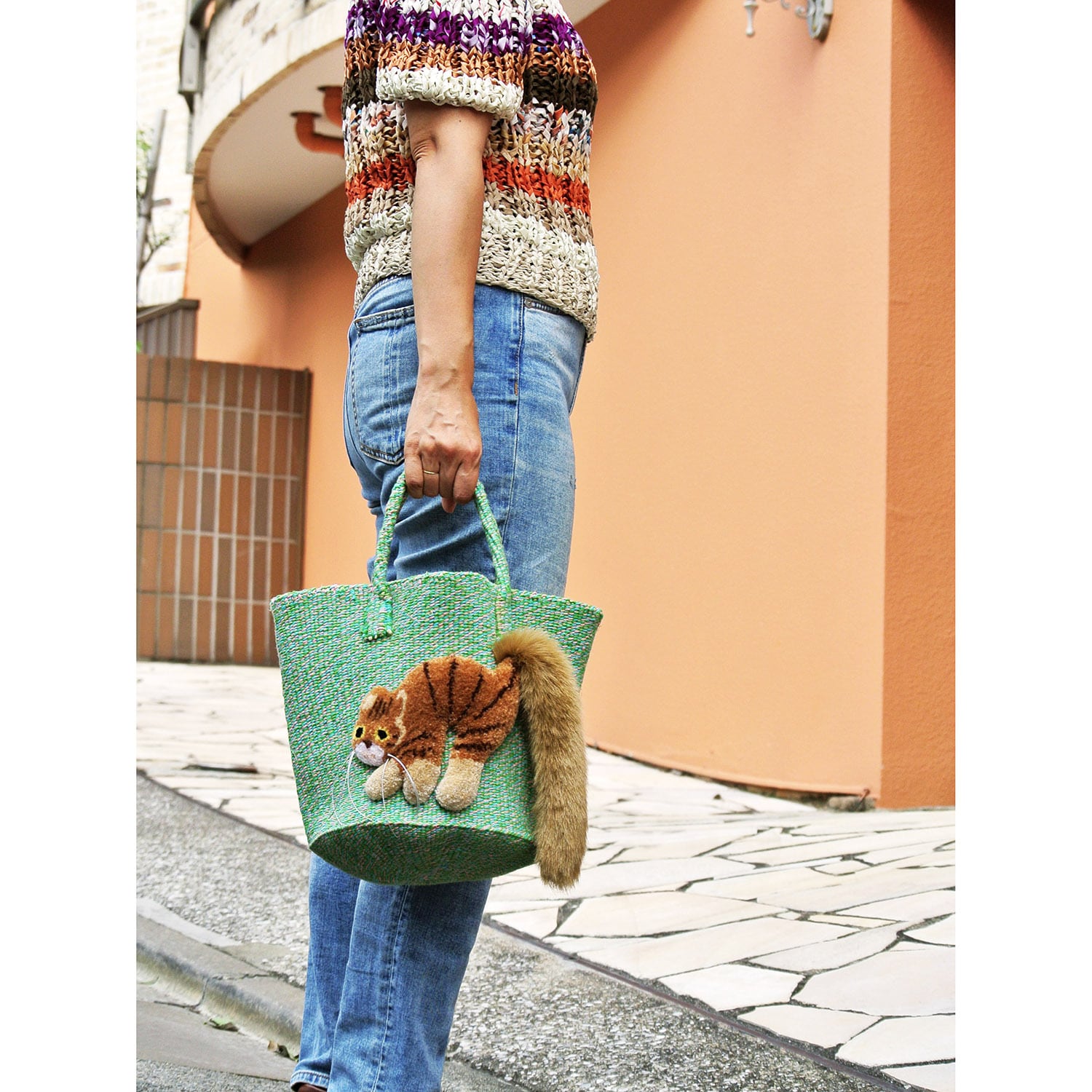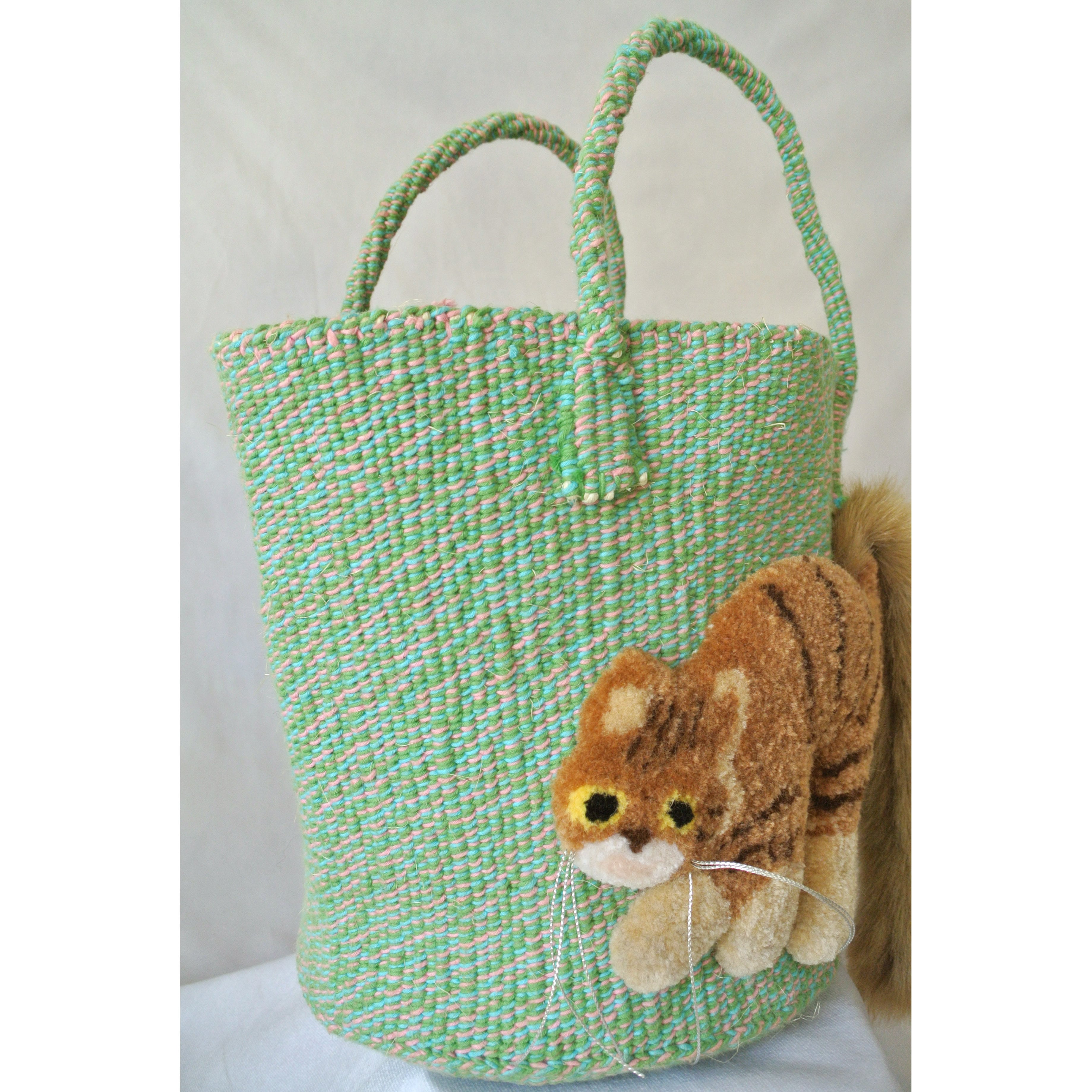 毛糸でモコモコに刺繍した猫ちゃんと、ふわふわロングなシッポがポイントのかごバッグです。