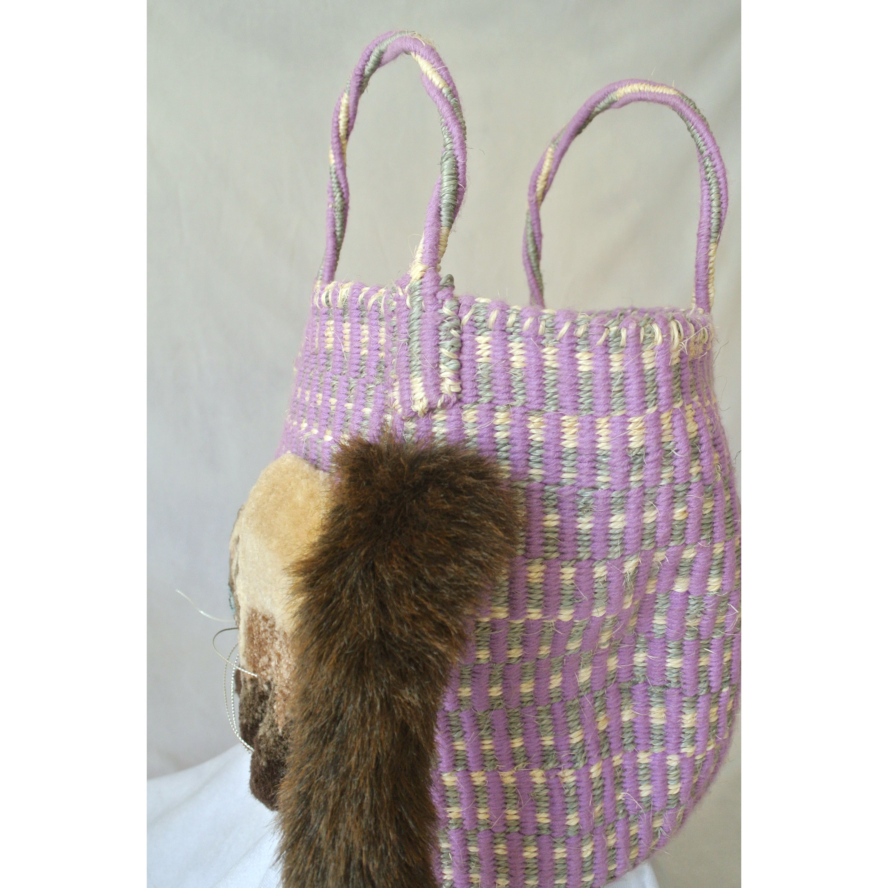 毛糸でモコモコに刺繍した猫ちゃんと、ふわふわロングなシッポがポイントのかごバッグです。
