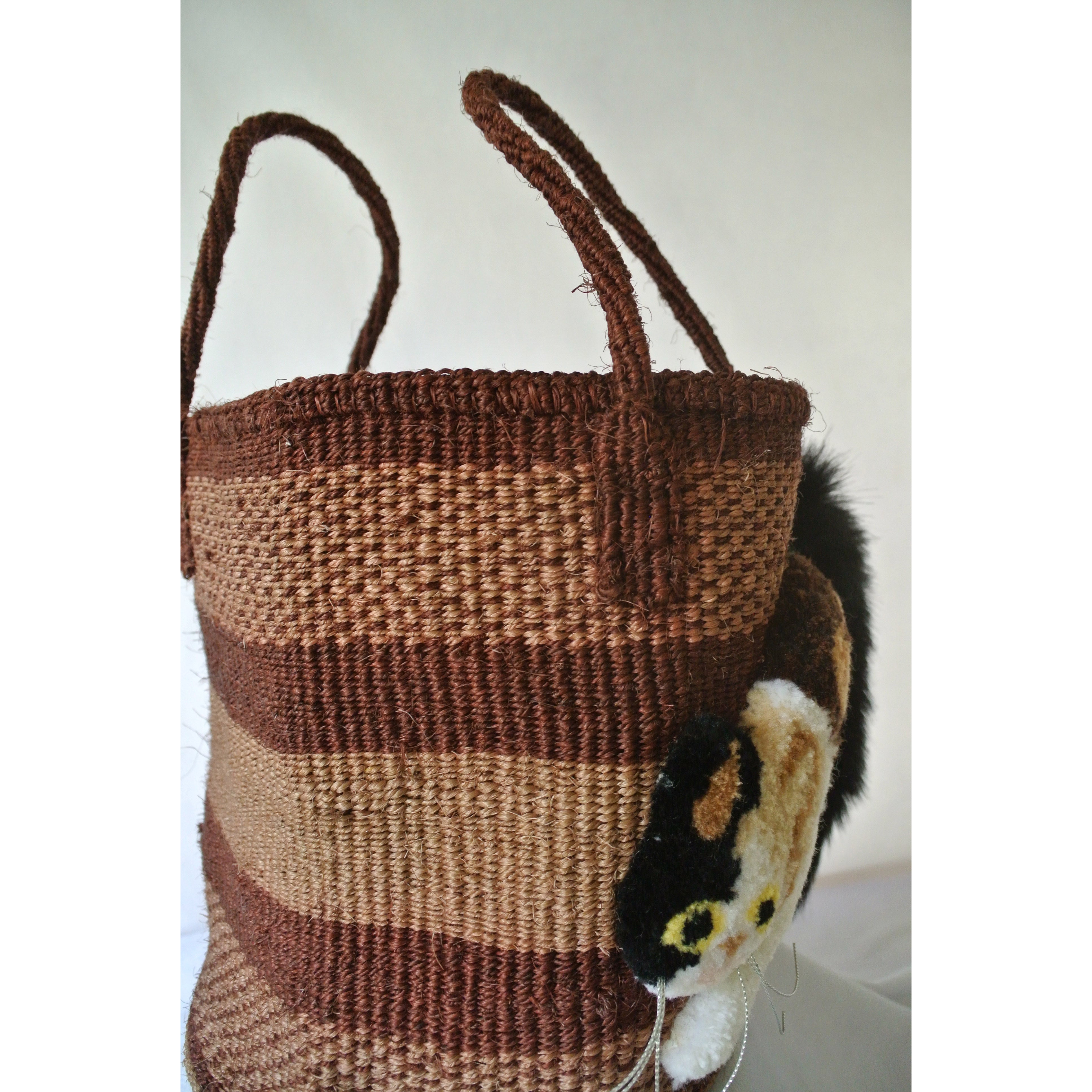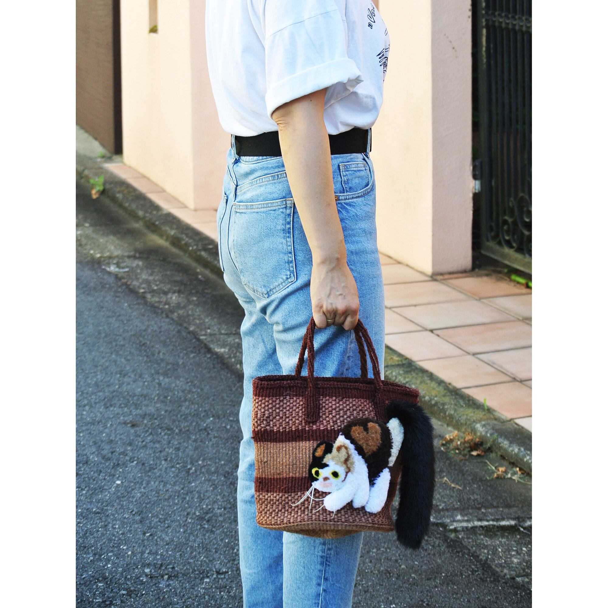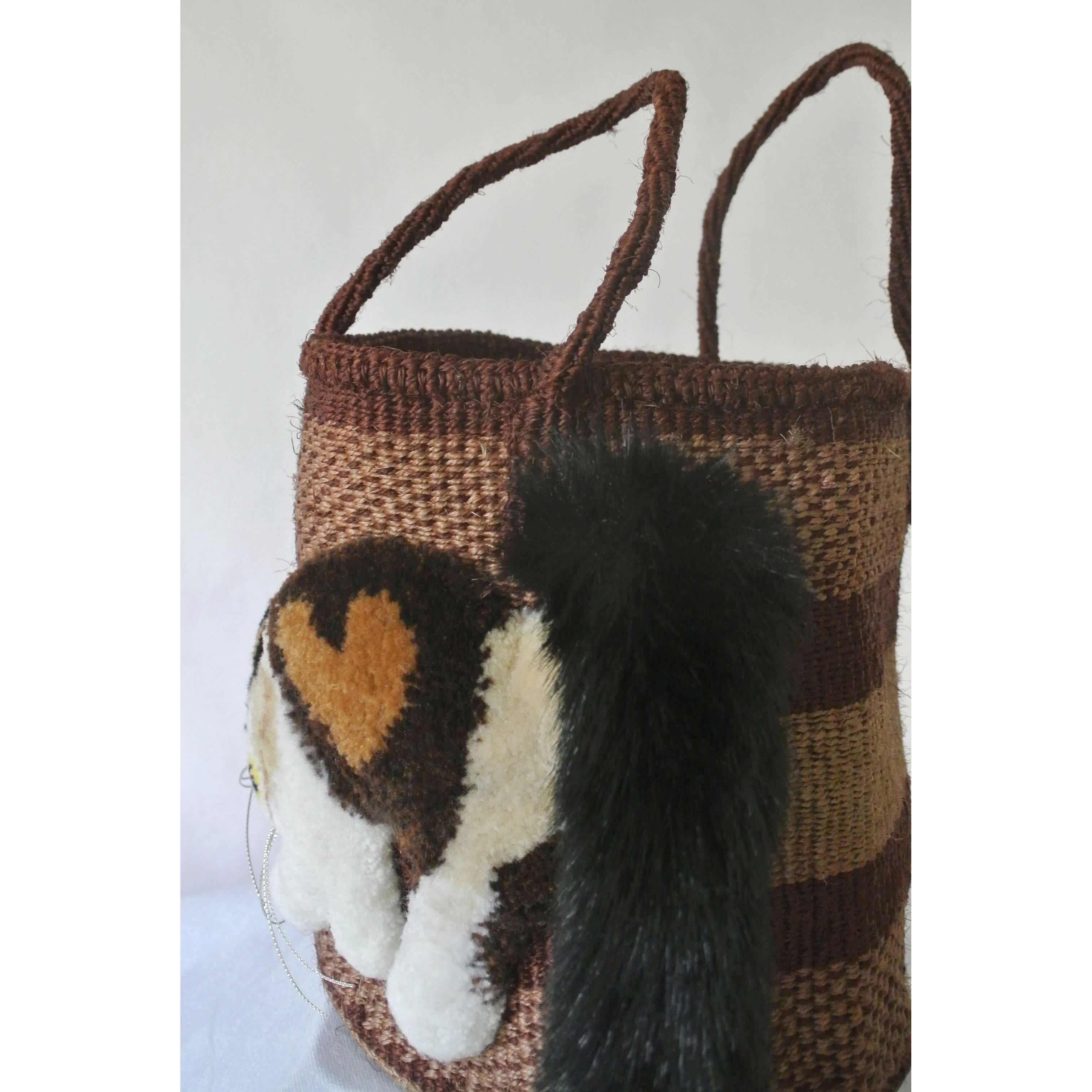 毛糸でモコモコに刺繍した猫ちゃんと、ふわふわロングなシッポがポイントのかごバッグです。